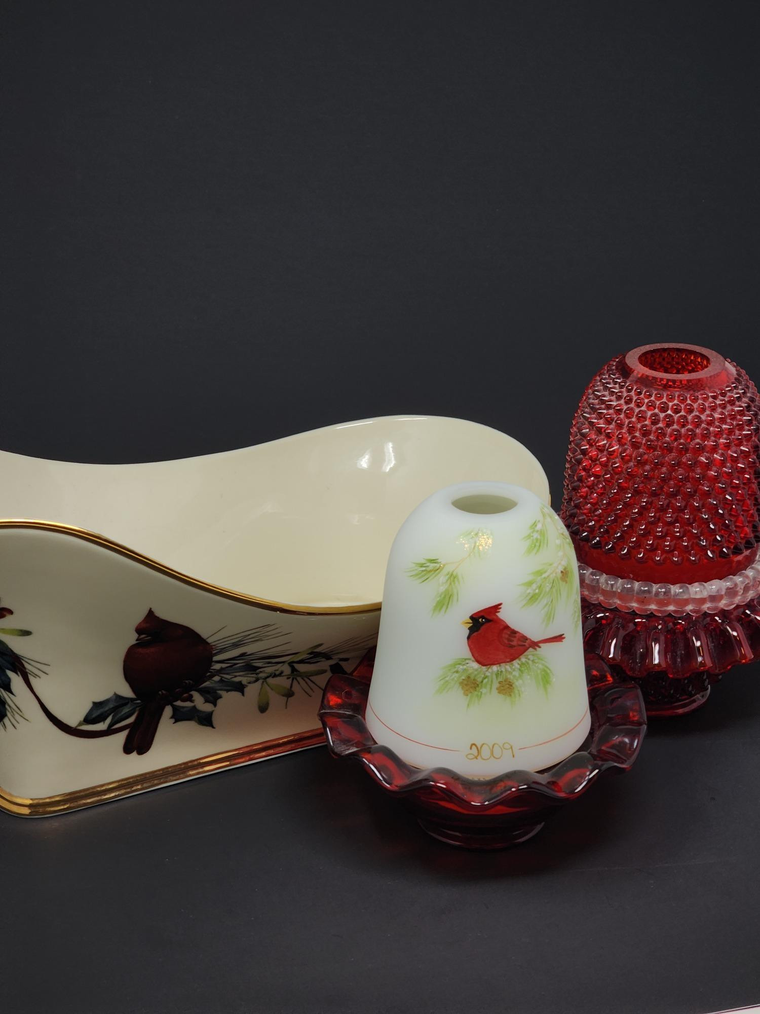 This exquisite collection features Fenton Fairy light Lamps and a Lenox Cardinal Bowl, perfect for collectors or anyone who loves vintage-inspired decor. Fenton Fairy light Lamp (2009) – Hand-painted by S. Hughes, featuring a red cardinal on frosted glass with a ruby hobnail base. Lenox Winter Greetings Wine Caddy – Designed by Catherine McClung, gold-trimmed with a cardinal motif. Fenton Ruby Glass Pieces – Elegant ruffled bowl and candle holder. Condition: All pieces are in excellent condition with no chips or cracks.