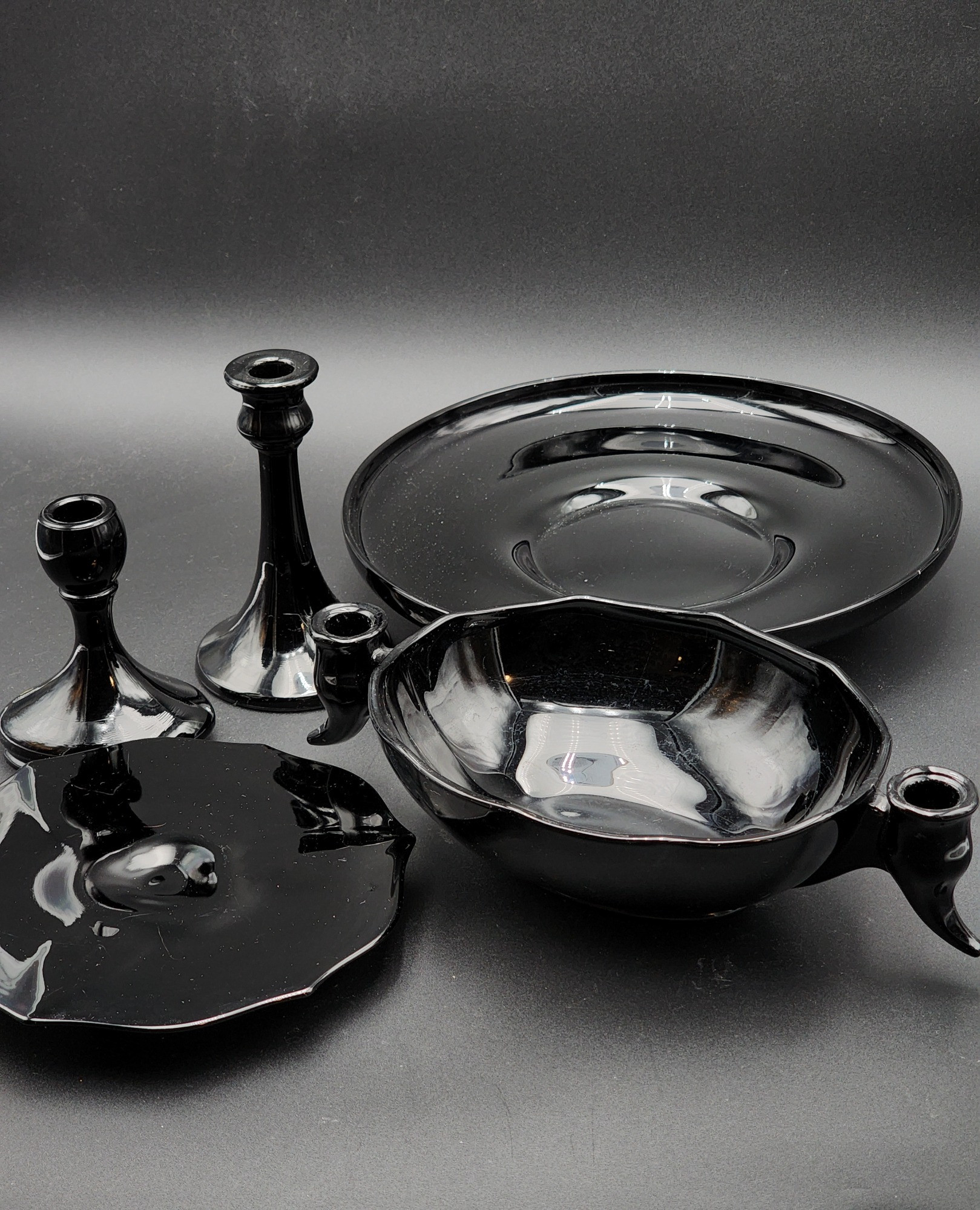 This stunning Black Amethyst Dinnerware & Candle Holders Set features a deep, rich black hue that reveals subtle amethyst undertones when held to the light. Perfect for collectors of Depression glass, vintage decor enthusiasts, or those who appreciate unique and sophisticated tableware. Set Includes: 1 Large Plate – Ideal for serving or display Features: Black Amethyst Glass – A rare and sought-after color that appears black but reveals a deep purple hue in strong light