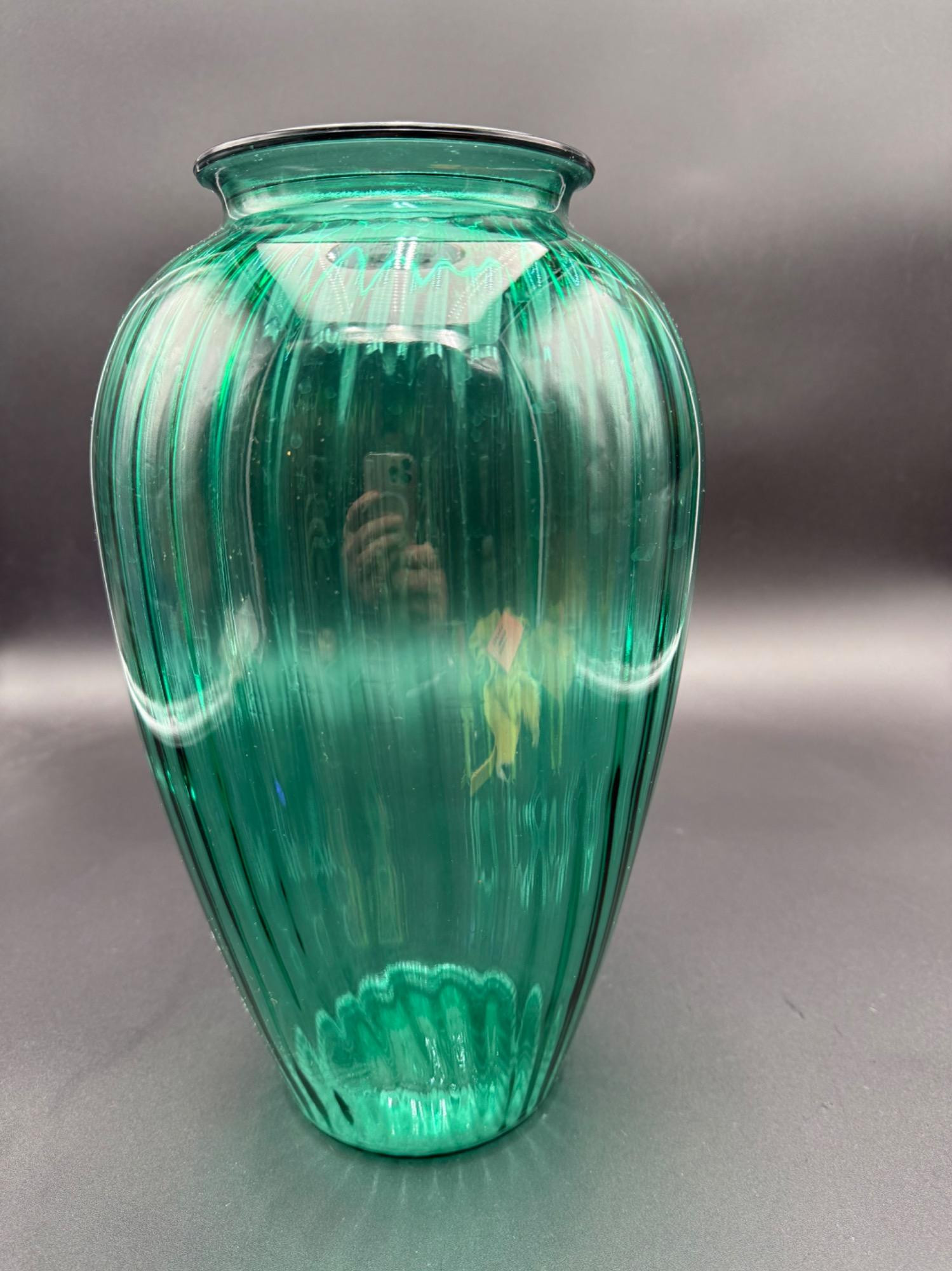 This beautiful vintage Anchor Hocking glass vase. Featuring a rich emerald green hue and a classic ribbed swirl pattern, this stunning piece is perfect for collectors and decor enthusiasts alike. Features: Authentic Anchor Hocking Glass Dimensions: 13T x 6 W
