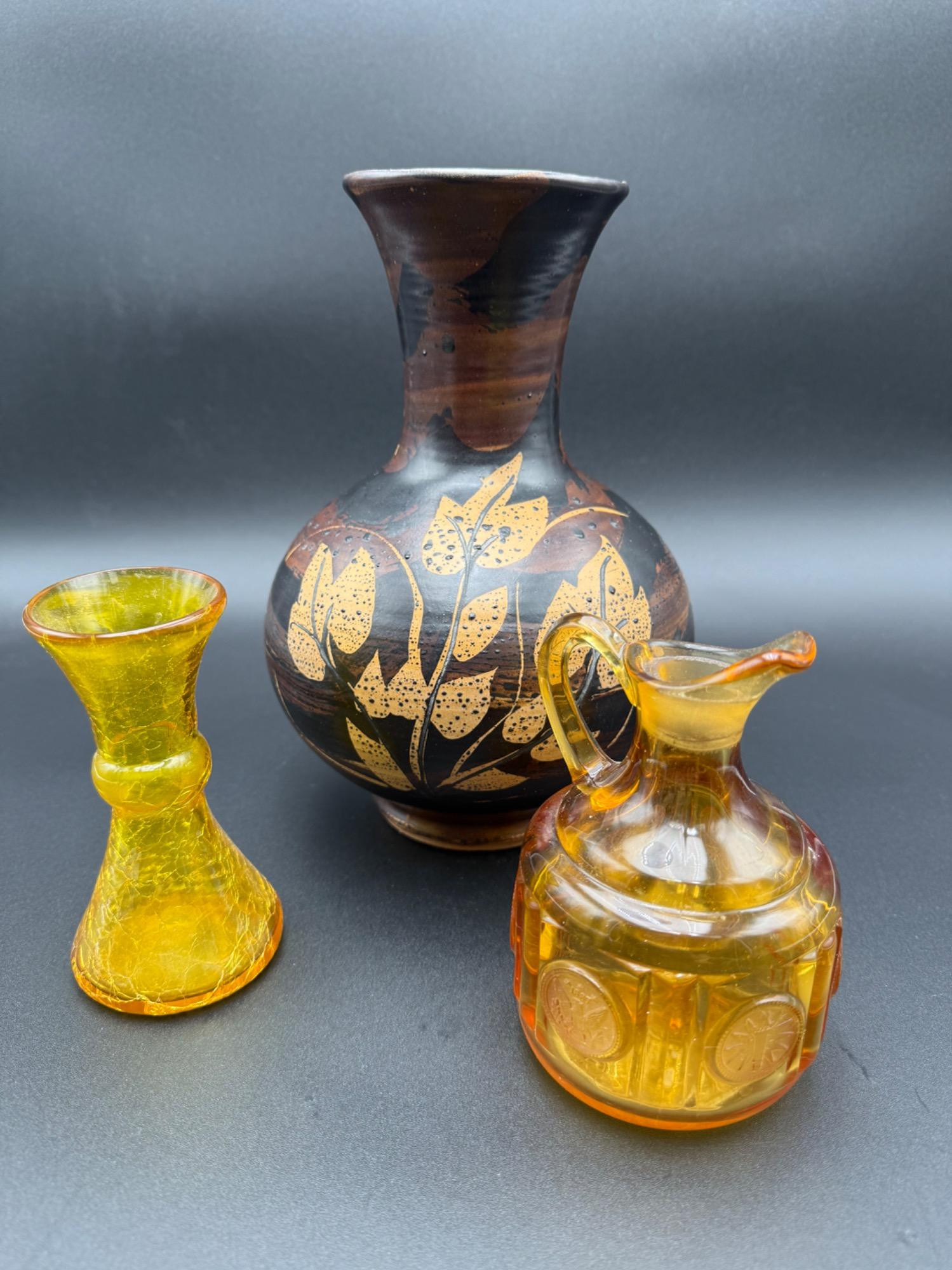 A beautiful set of vintage glassware and pottery, ideal for collectors, home decor enthusiasts. Each piece showcases unique craftsmanship and classic design. Included in the Set: Fostoria Crackle Glass Vase Size: 5" Tall x 3" Wide Color: Amber yellow Details: Features Fostoria’s signature crackle texture, adding vintage charm. Ideal for small floral arrangements or display. Amber Glass Pitcher Size: 5" Tall Color: Warm golden amber Details: Beautifully molded with intricate embossed patterns. Can be used as a creamer, decorative piece, or small bud vase. Pacific Stoneware Vase (Marked & Dated 1972) Size: 9.5" Tall x 6.5" Wide Color: Earthy brown with a golden leaf motif Markings: Stamped on the base – Pacific Stoneware, 1972, Buel’s Details: Handcrafted stoneware with a rich, rustic glaze and a hand-painted leaf design. A standout piece for collectors of Pacific Stoneware. Condition: All pieces are in great vintage condition with natural aging characteristics that enhance their charm.