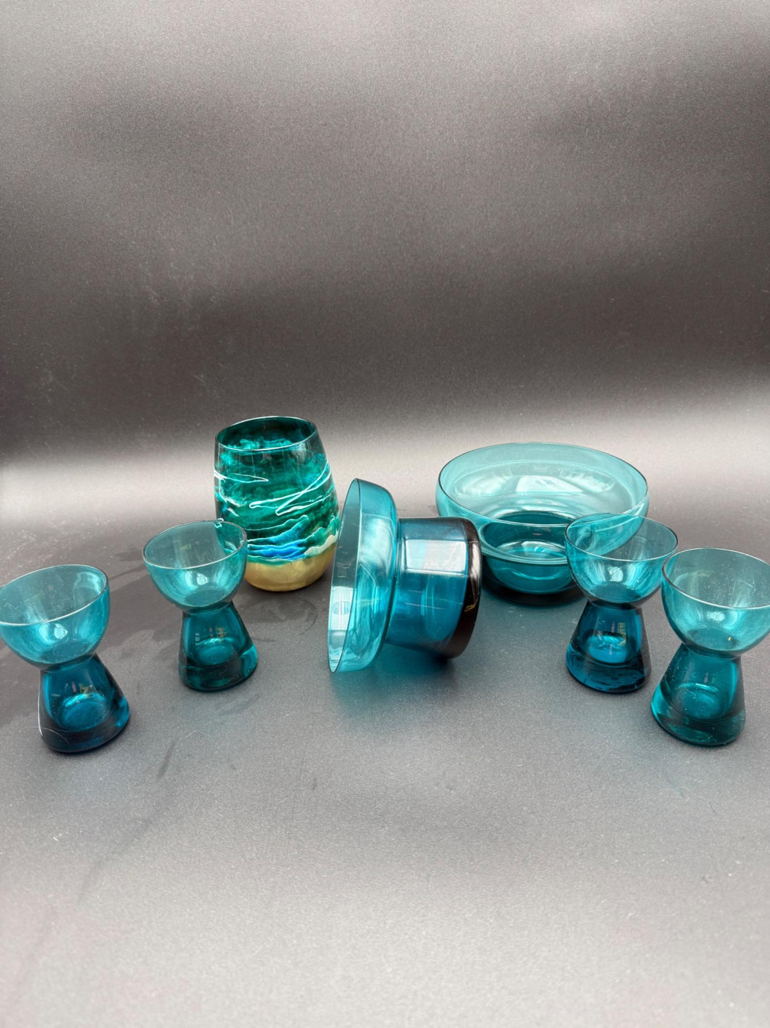 This 7-piece glassware collection includes a mix of vintage mid-century and modern artisan glass, featuring five verified Morgantown Barton pieces in Peacock Blue (circa 1960s) and a beautiful handcrafted ocean-inspired stemless glass with swirling resin design. Included in the lot: (4) Morgantown Barton Hourglass Candlestick Holders Peacock blue lead crystal from the 1960s Barton line Classic hourglass shape, commonly repurposed today as liqueur or cordial glasses Approx. size: 3.75" H x 2.5" W (2) Morgantown Barton Console Candle Holders / Pedestal Bowls Matching peacock blue with thick-walled construction and pedestal base Ideal for serving, décor, or as candle holders Approx. size: 3.5" H x 6" W (1) Ocean-Inspired Stemless Glass Modern artisan-made glass with swirling layers of teal, blue, green, and sandy gold Evokes the movement and tones of ocean waves Condition: All pieces are in good vintage or pre-owned condition.