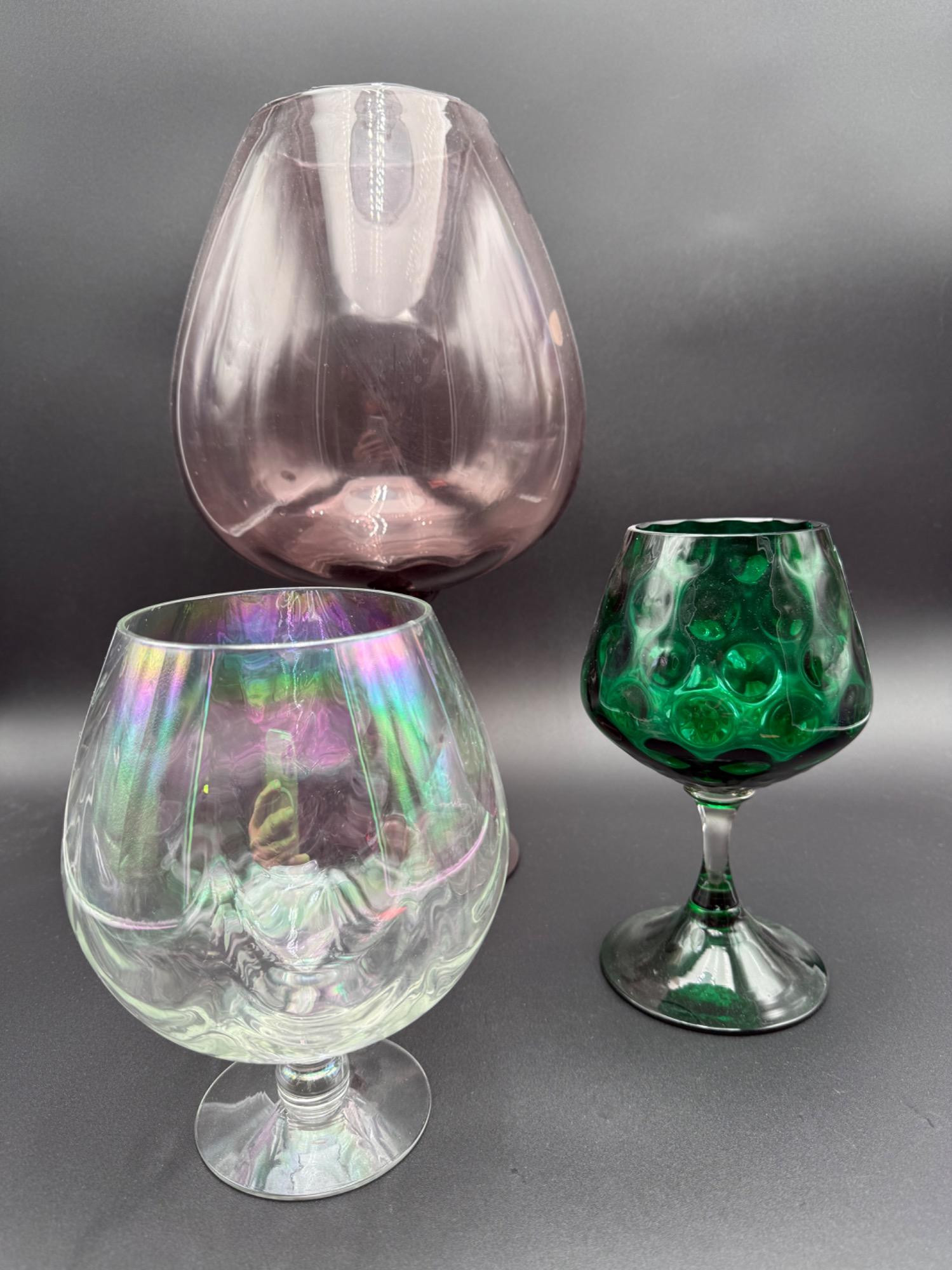 Splash bold color and vintage elegance into your decor with this stunning set of three Mid-Century Modern art glass compotes. These unique, oversized pieces come in varying heights and finishes, perfect as votives, centerpiece displays, or striking shelf decor. Set includes: One iridescent clear compote with a mesmerizing oil-slick finish – approx. 9” tall One amethyst/purple compote with tall stem – approx. 16” tall One deep emerald green compote with a bold bubbled texture – approx. 8” tall Condition note: These pieces show minor rim wear.