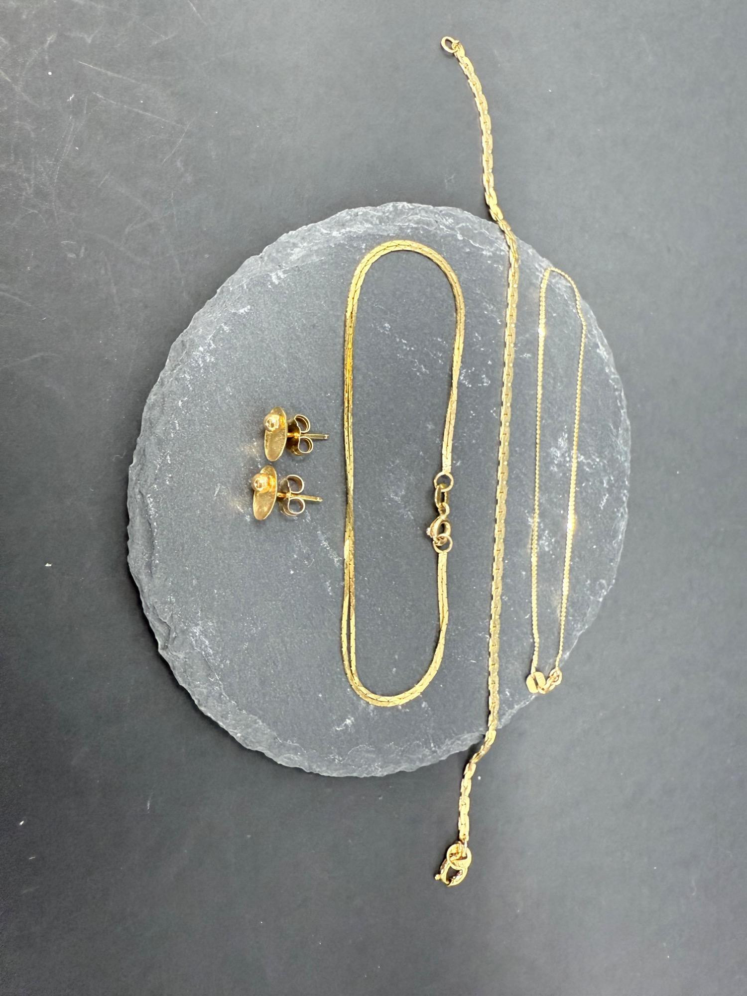 14K Gold Jewelry Collection – 4g Total Weight – Earrings & Bracelets This refined lot includes four delicate pieces of 14K yellow gold jewelry. Light and elegant, these pieces collectively weigh 4 grams and are marked for gold purity. Includes: 14K Gold Stud Earrings (.25") Classic ball stud design with butterfly backs Stamped 14K 14K Gold Bracelet (6.75") Flattened link design with subtle shine Spring ring clasp 14K Gold Double-Strand Bracelet (6") Two fine linked strands joined at clasp Marked 14K 14K Gold Single-Strand Bracelet (6") Sleek box or snake chain style Stamped 14K Total Weight: 4g (confirmed via scale)