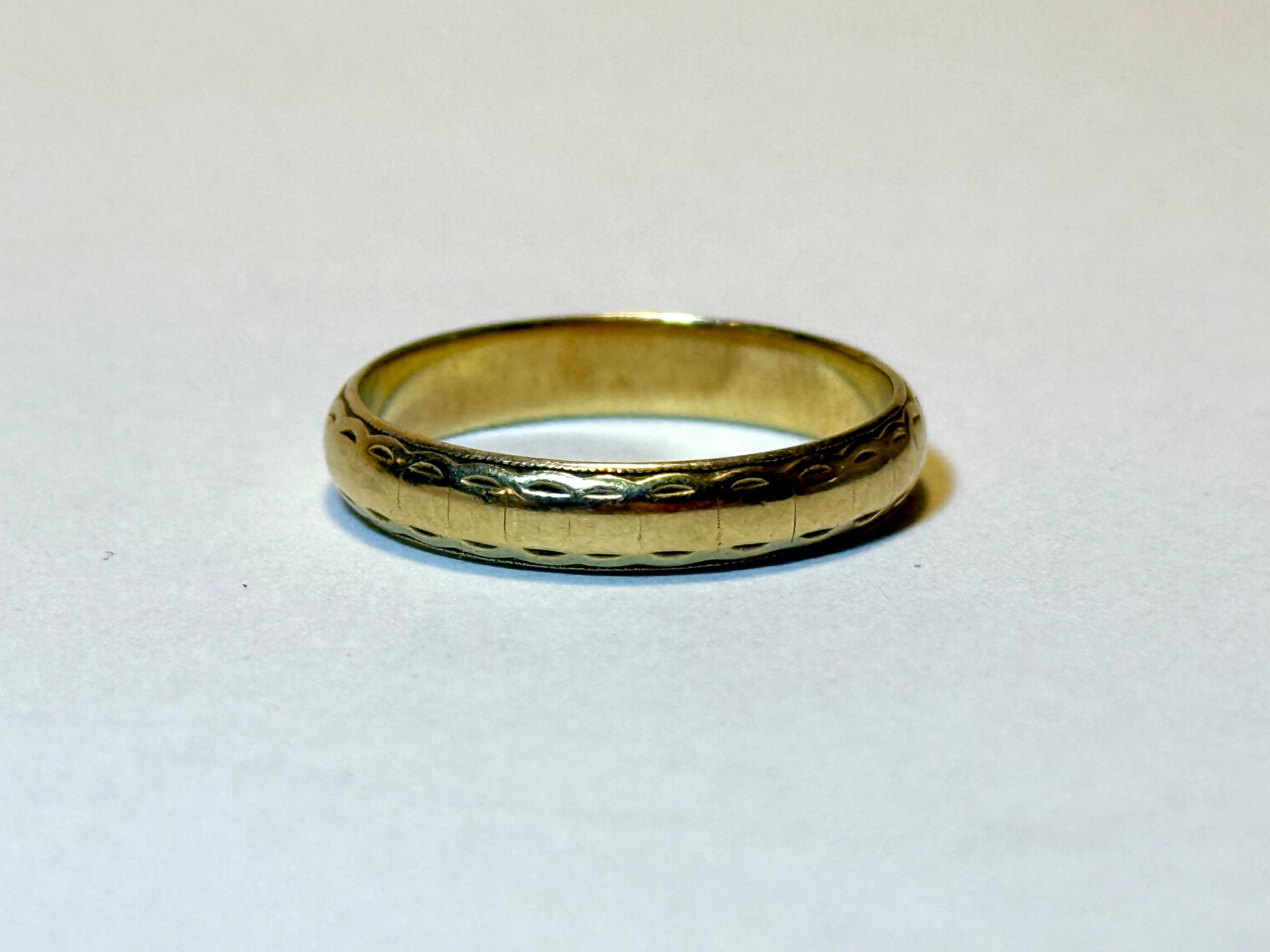 This timeless wedding band is crafted in solid 14k yellow gold and features a classic, lightly textured design. It’s stamped "ALSAN 14K" on the inner band, indicating its gold purity and maker. The band has a clean, polished finish with a subtle etched pattern around the center, adding a touch of vintage charm. Size: Approximately 8 to 8.5 Weight: 3.6 grams Material: 14k yellow gold Markings: ALSAN 14K Condition: Pre-owned, good vintage condition with minor surface wear consistent with age
