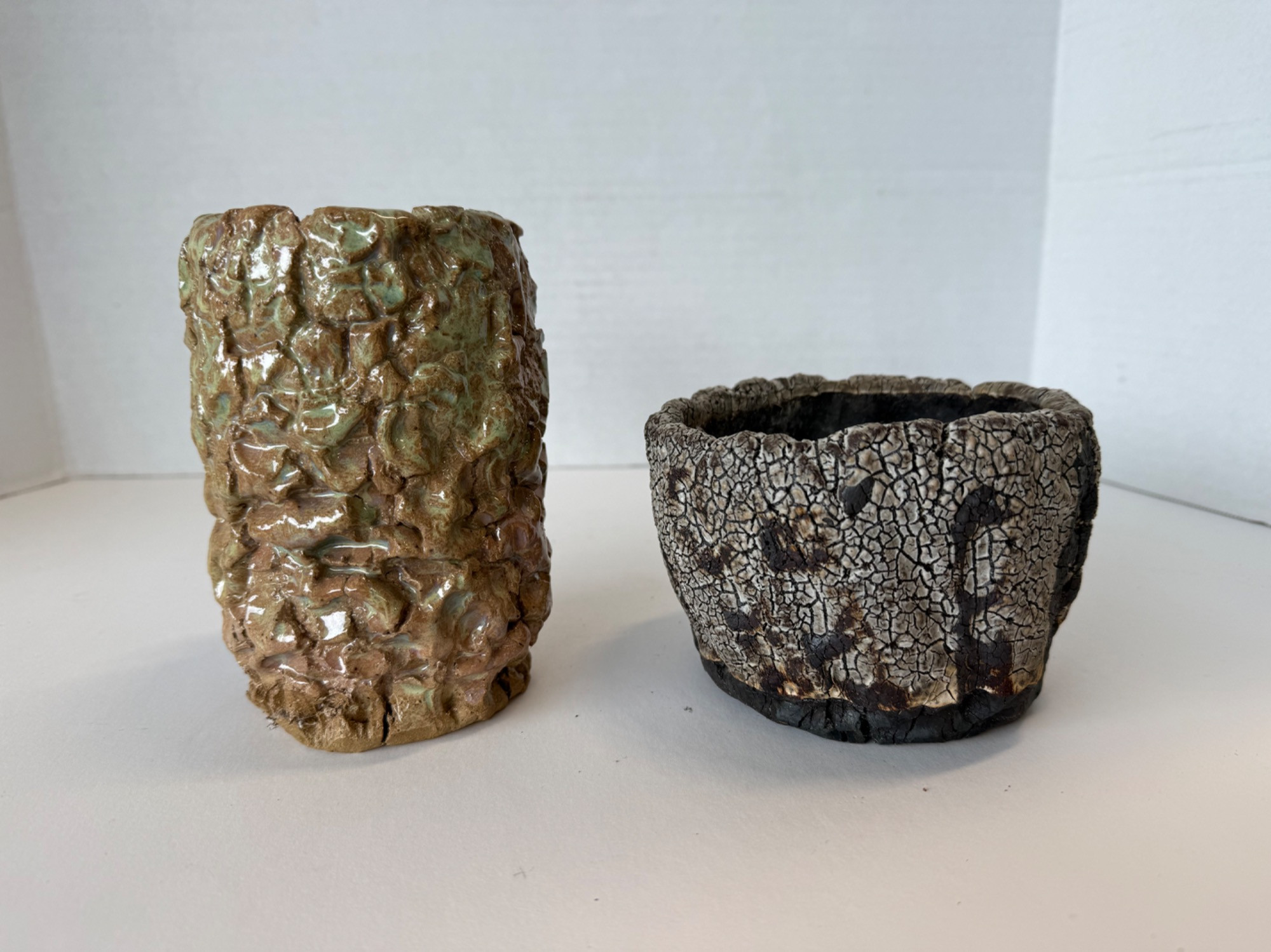 A striking set of two handmade ceramic pieces featuring bold textures and organic forms—perfect for lovers of studio pottery and unique planter or cup designs. Set includes: One tall cup/vessel with a richly glazed, bumpy surface in earthy browns and greens. One squat, crackle-textured planter with dark rustic tones and a raw, fired look. Measurements: Up to 5.5 inches tall
