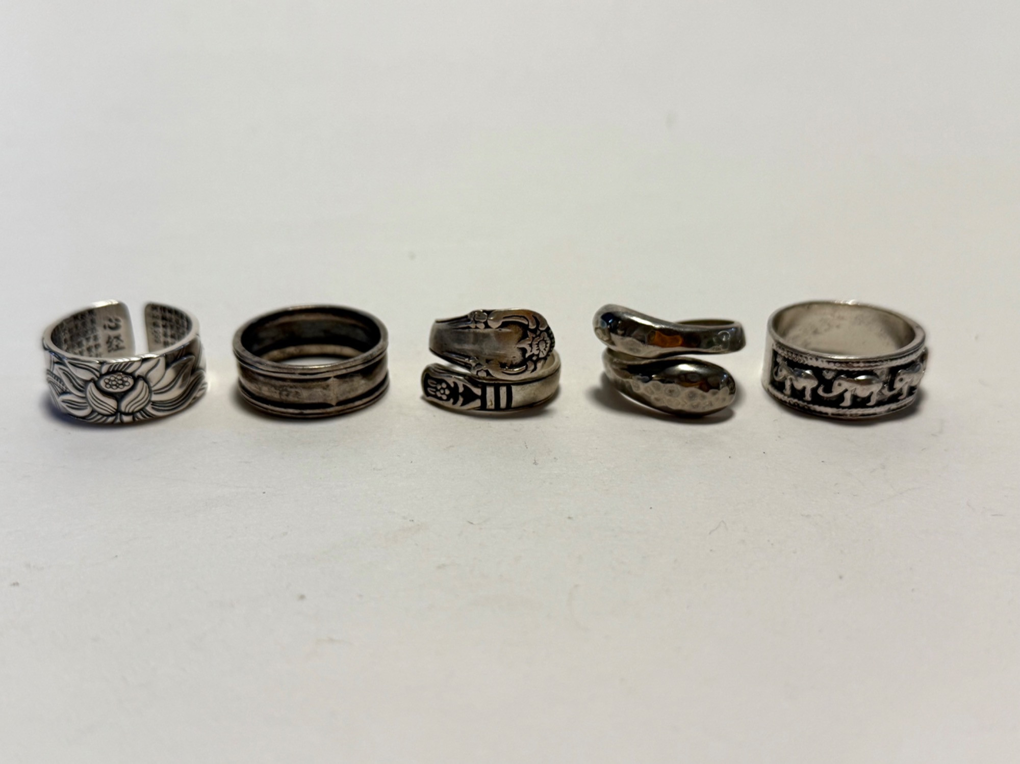 This unique collection features five beautifully crafted rings, each with its own distinct design. Four of the five rings are clearly marked as sterling silver (925 or STERLING), while one is unmarked but believed to be sterling based on appearance and weight. These rings vary in design and style—from hammered textures and engraved patterns to detailed figural and elephant motifs. Details: Total of 5 rings 4 rings marked “925” or “Sterling” Mix of vintage, boho, and artisan styles