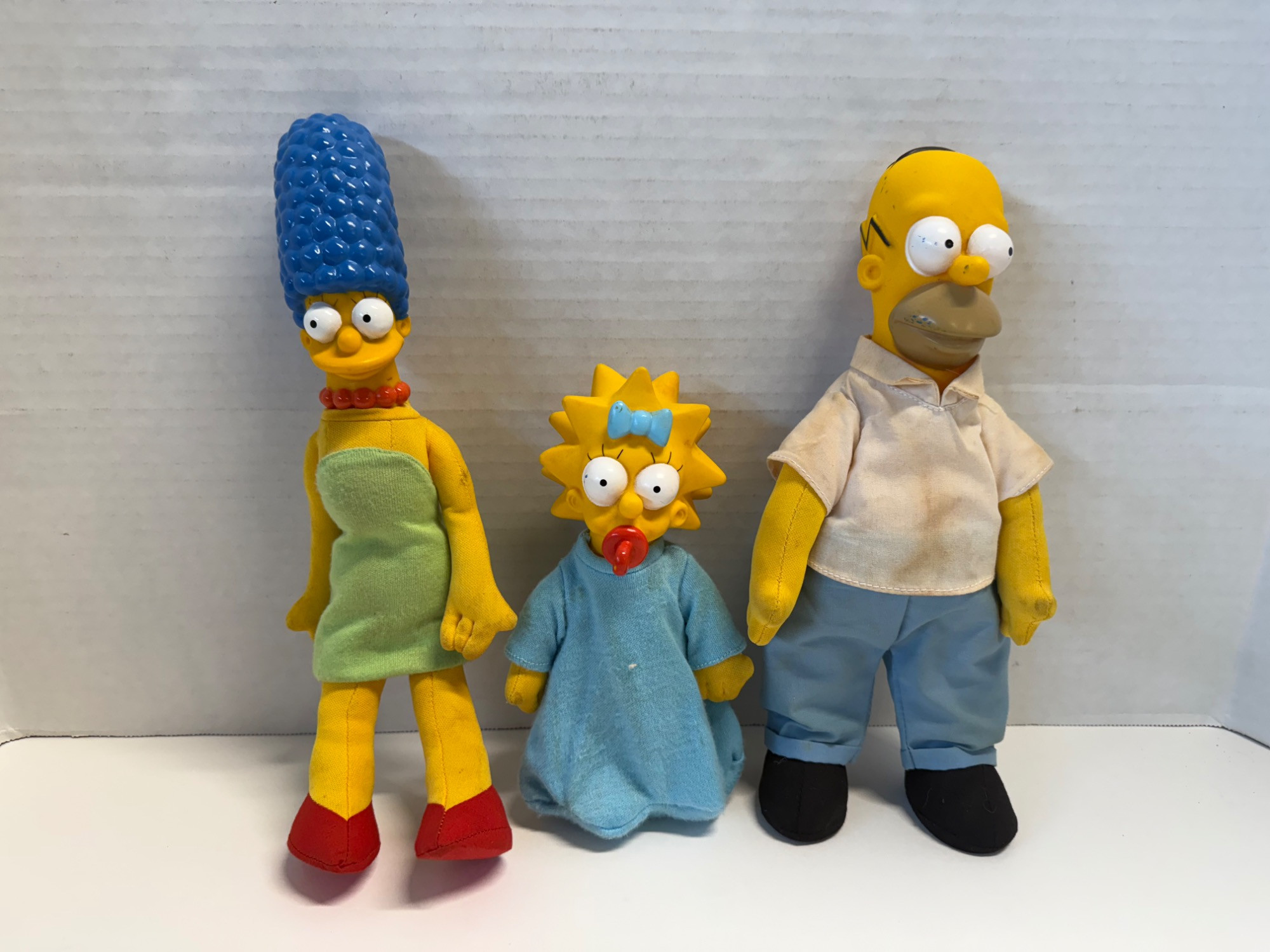 Set of three plush dolls from The Simpsons featuring Marge, Homer, and Maggie Simpson. Each doll measures up to 11 inches tall. They have soft bodies with plastic heads and are dressed in character-specific outfits. Details: Marge: Green dress, red shoes, red necklace. Minor signs of age on fabric. Homer: White shirt, blue pants, black shoes. Light discoloration on shirt and a few facial scuff marks. Maggie: Blue sleeper, red pacifier, blue bow. Small tear on back of clothing (shown in photo).