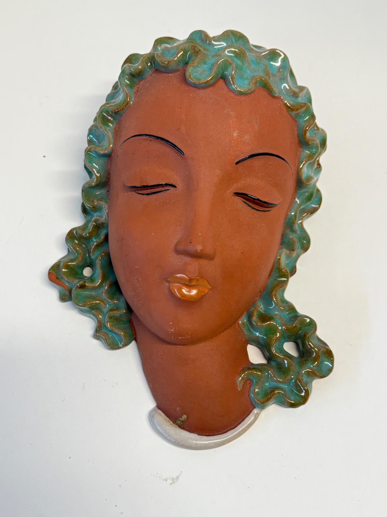 This is a vintage wall mask made by Keramos, an Austrian ceramics manufacturer. The piece features a stylized female face with closed eyes and wavy hair. The surface is a mix of matte terracotta and glossy teal glaze, with hand-painted details on the lips and eyebrows. Details: Maker: Keramos (marked on the back: “MADE IN AUSTRIA – KERAMOS”) Material: Ceramic / Terracotta Finish: Partially glazed with teal accents Condition: Vintage, with minor wear and a small chip near the neckline (visible in photos)