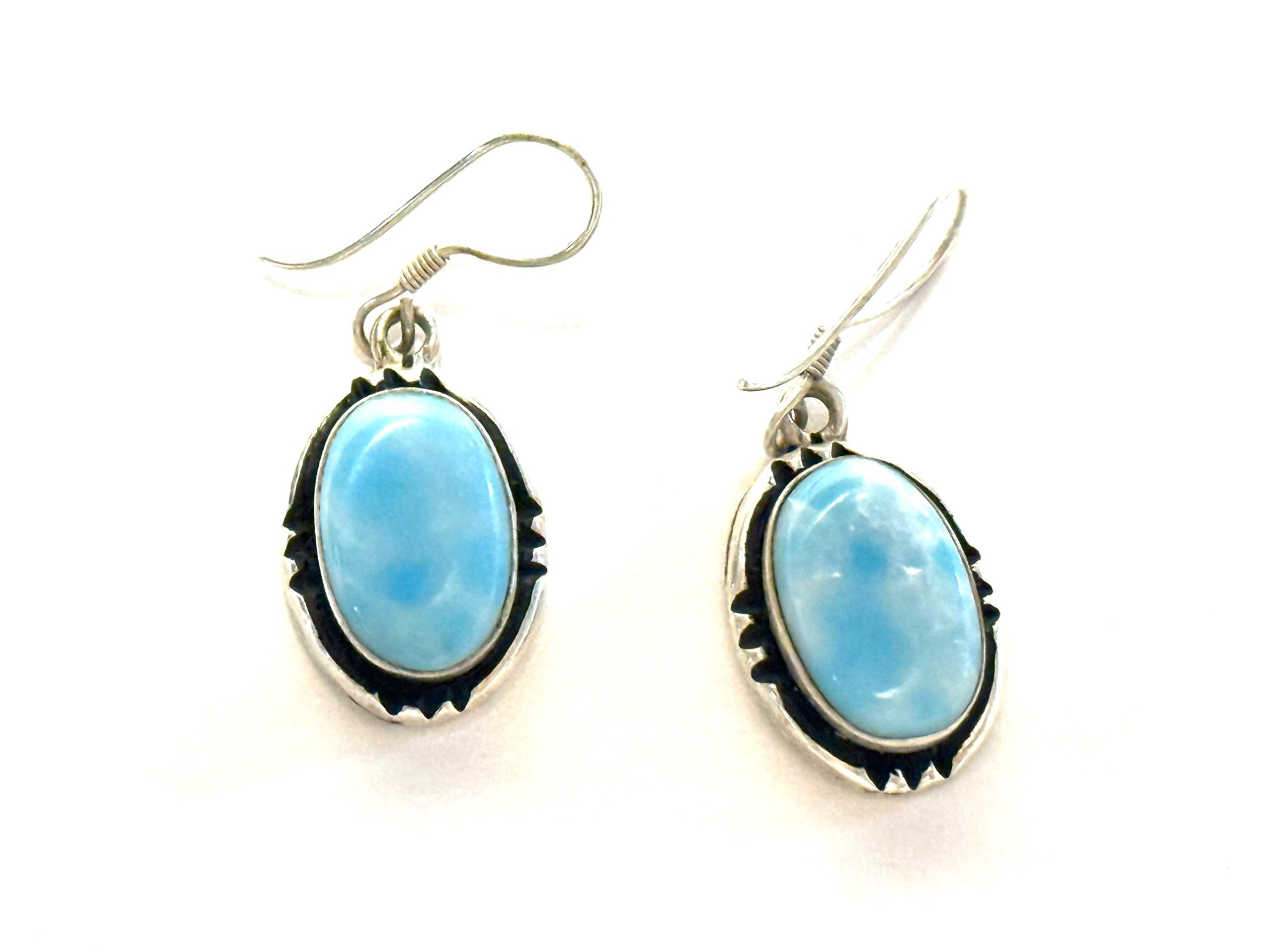 These stunning vintage dangle earrings showcase genuine larimar cabochons in sterling silver settings, featuring bold black oxidized accents for contrast. The calming blue stones are bezel-set in handcrafted frames that reflect artisan skill. Marked "Taxco Mexico." Measures 3/4 inch long.