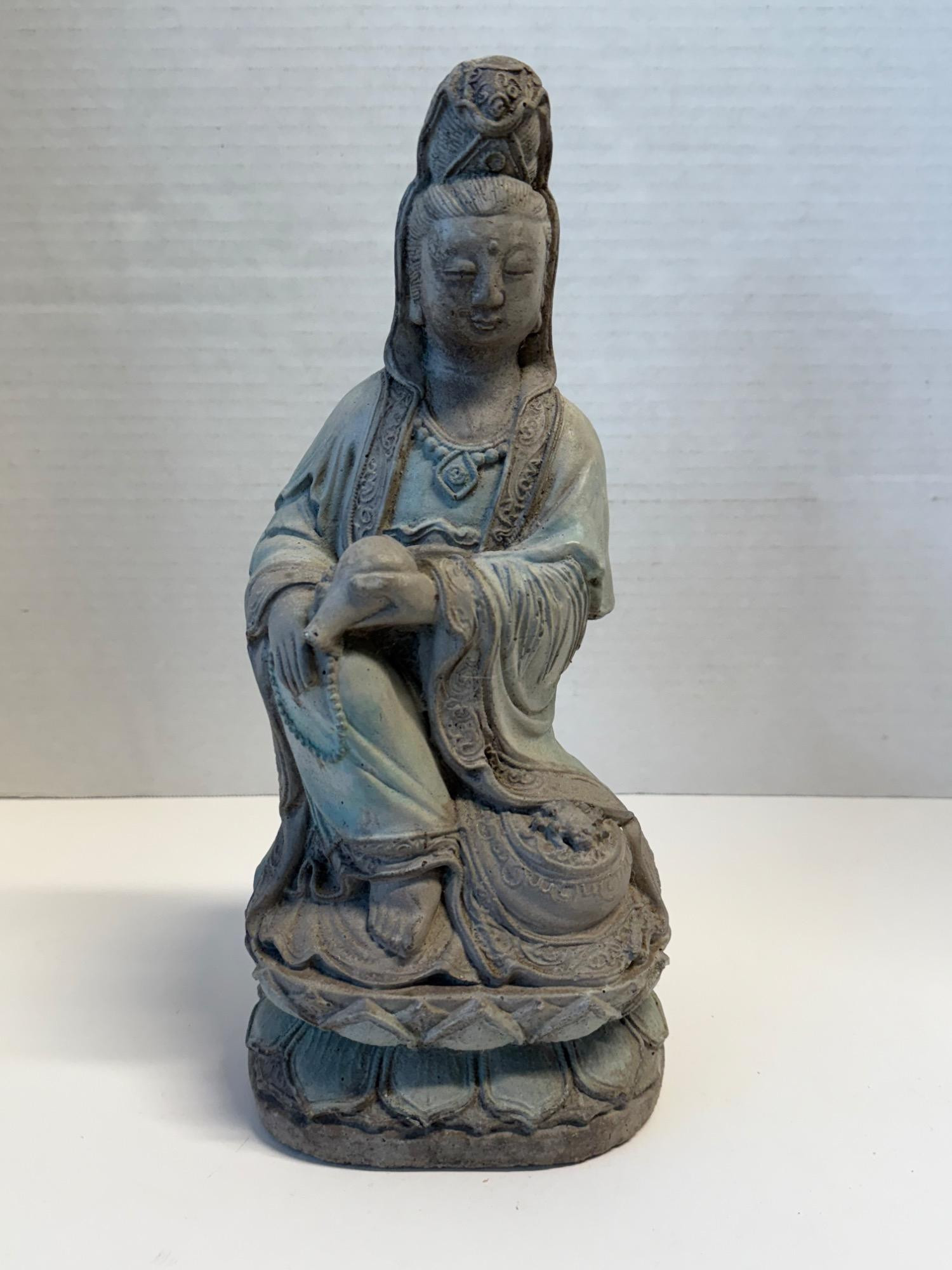 Capture the peaceful elegance of this beautifully detailed vintage Guanyin (Kwan Yin) statue. The serene Bodhisattva is depicted seated in a meditative pose atop a lotus pedestal, hands delicately positioned in a gesture of calm compassion. The statue is cast in a stone-like material with a weathered, patinated finish in soft green and earthy gray tones, enhancing its antique appeal. Height: Approx. 7 inches (17.8 cm) Material: Composite stone or resin with aged finish Condition: Pre-owned vintage condition; wear consistent with age. Please see photos for full details.