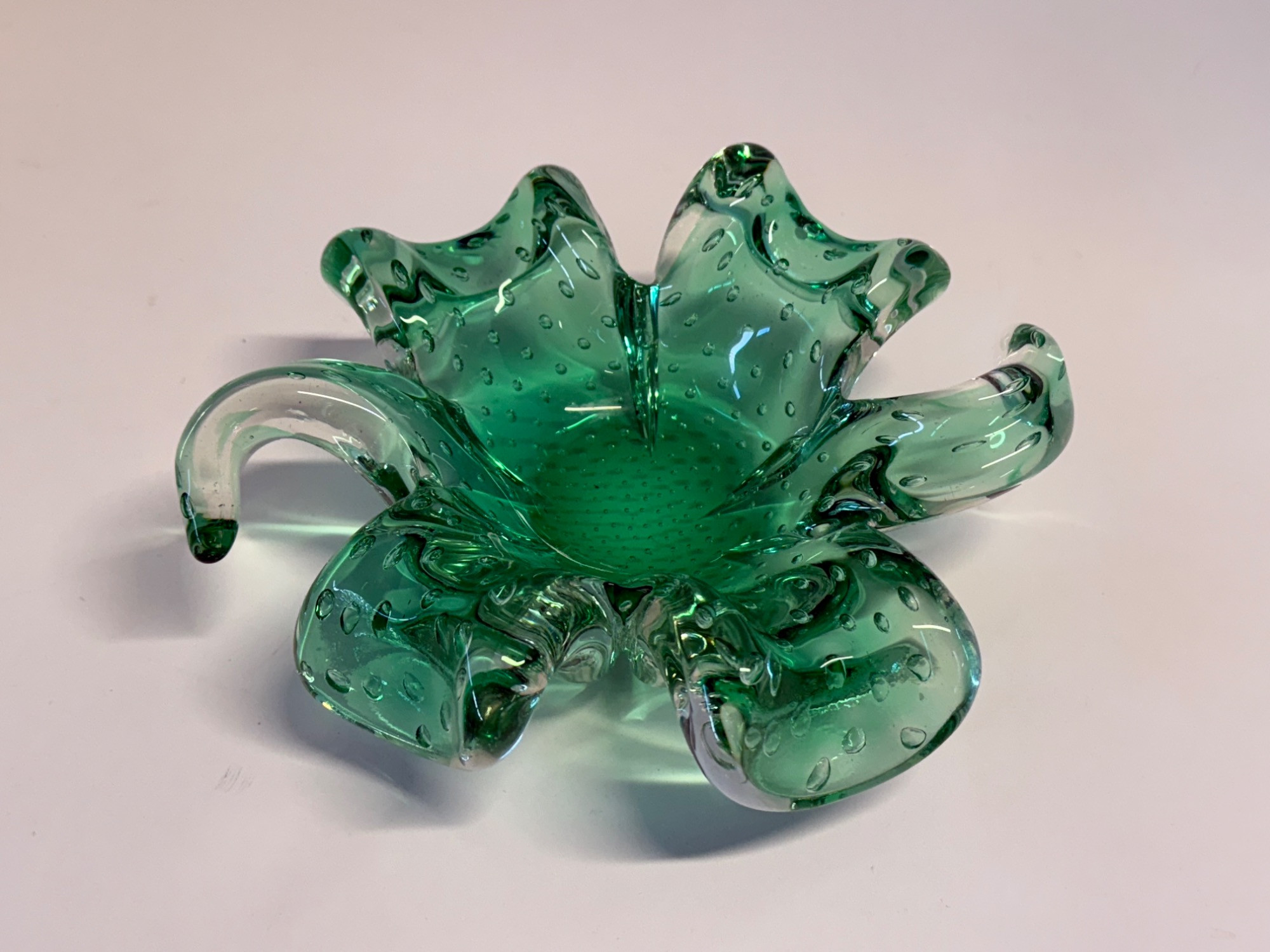 Handcrafted on the island of Murano, Italy, this green glass bowl features a ruffled, flower-like shape and controlled bubble detailing (bullicante technique). Made with thick, clear green glass, the piece showcases traditional Murano artistry. Suitable as a decorative centerpiece or catchall dish, this bowl reflects mid-century modern and art glass aesthetics. Details: Color: Green Technique: Bullicante (controlled bubbles) Material: Hand-blown Murano glass Design: Ruffled edges, floral form Condition: Excellent vintage condition; no chips or cracks Note: Tiny chip on bottom.