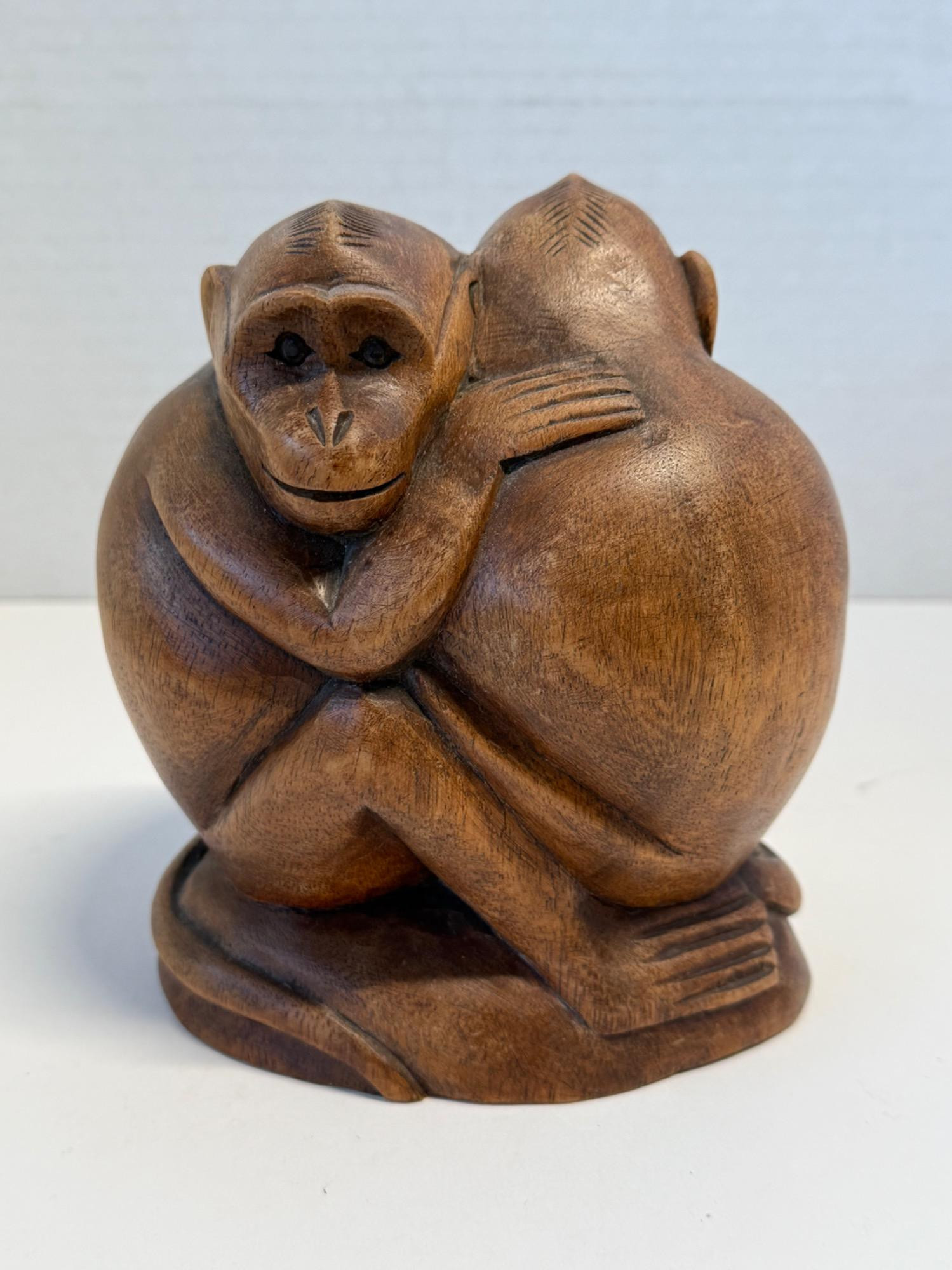 This unique and heartwarming hand-carved wooden sculpture features two monkeys embracing in a tender hug, symbolizing love, unity, and connection. The piece is beautifully crafted with intricate details that highlight the expressive faces and intertwined limbs of the monkeys. Made from solid wood with a smooth, warm finish, the sculpture is both rustic and elegant. On the underside, the piece is signed "Tom + Julie" and inscribed with “Year of Monkey 2016,” making it a meaningful and personal collectible.