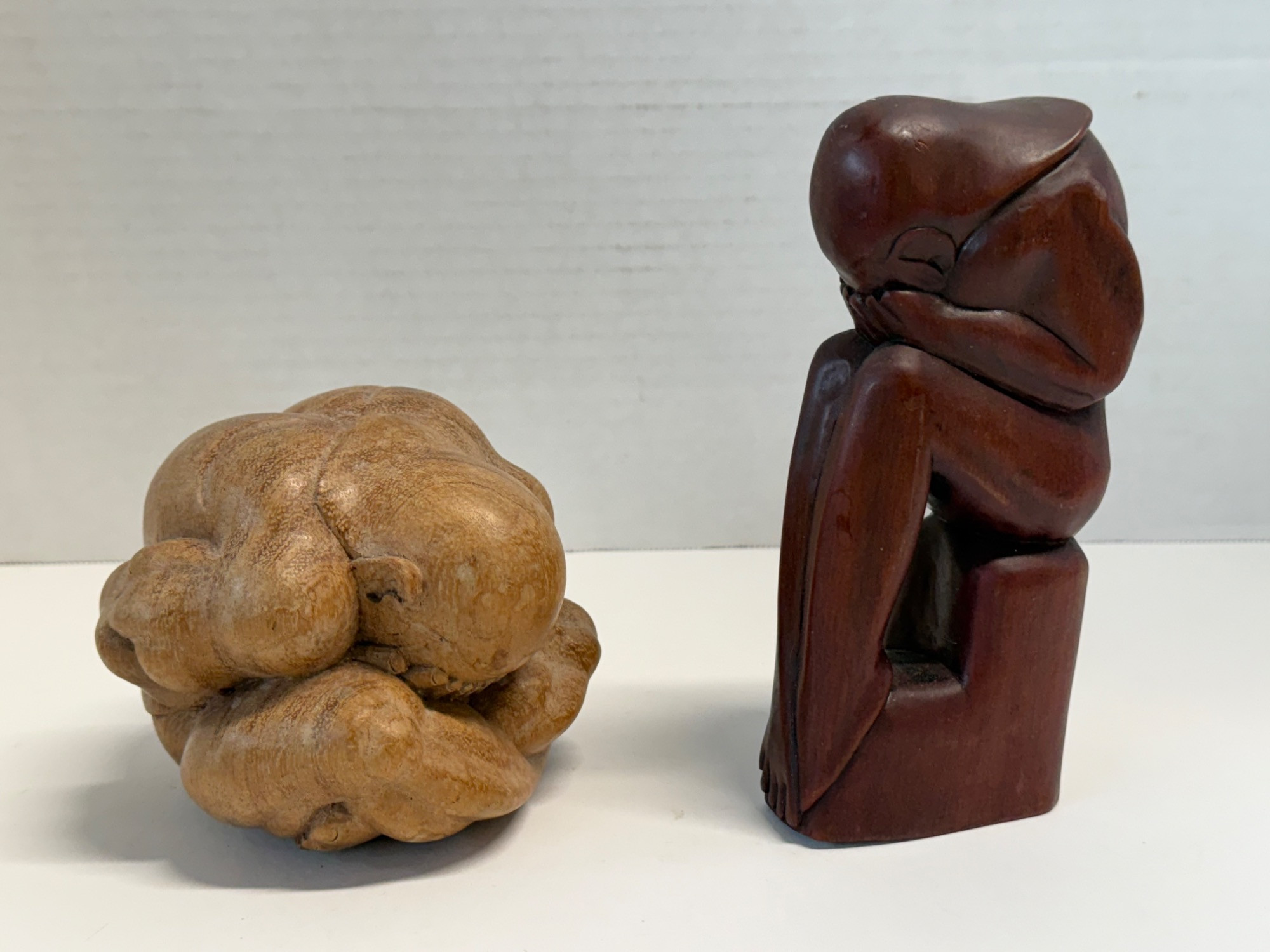 This unique duo of hand-carved wooden sculptures captures the introspective "Thinking Man" pose in two distinct artistic styles. The darker wood figure sits contemplatively on a block, hands cradling the face, crafted with smooth lines and fine detail. The lighter wood sculpture takes a more abstract and compact approach, with multiple curled limbs forming a tight, emotional posture. Height: Tallest figure measures approximately 6.75 inches Material: Solid wood (types not specified) Condition: Excellent pre-owned condition with natural wood variations.