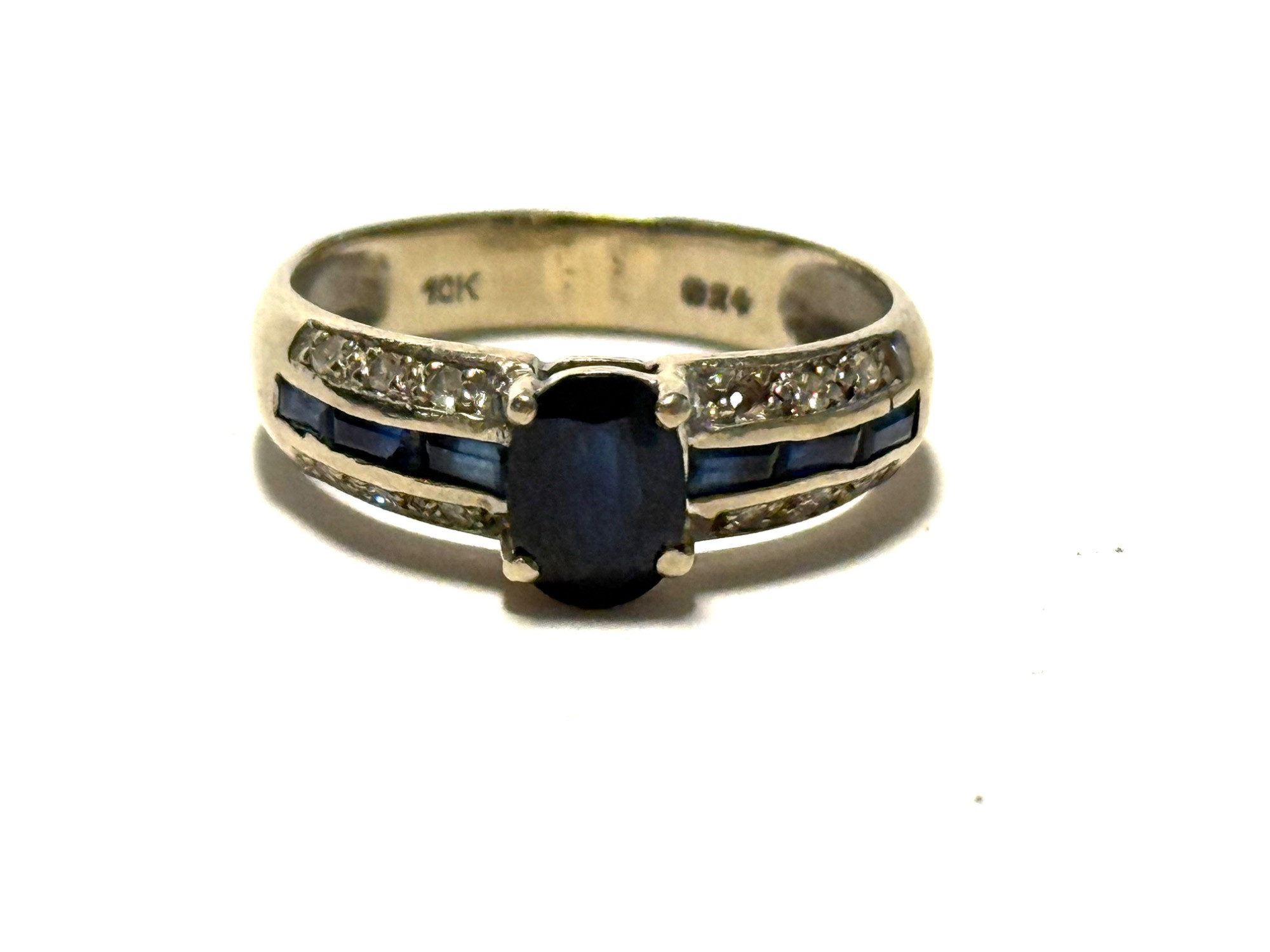 Elegant and timeless, this 10K gold ring features a bold oval-cut deep blue center stone, accented by sparkling diamonds and channel-set sapphire blue baguette stones on both shoulders. The split-shank design adds dimension and brilliance, with beautiful detail visible from every angle. Details: Size: 7 Metal: 10K Gold (stamped) Stones: One oval-cut dark blue center stone Baguette-cut sapphire blue side stones Small round diamond accents Condition note: Good overall condition. One small accent diamond is missing (see photo close-up for reference).