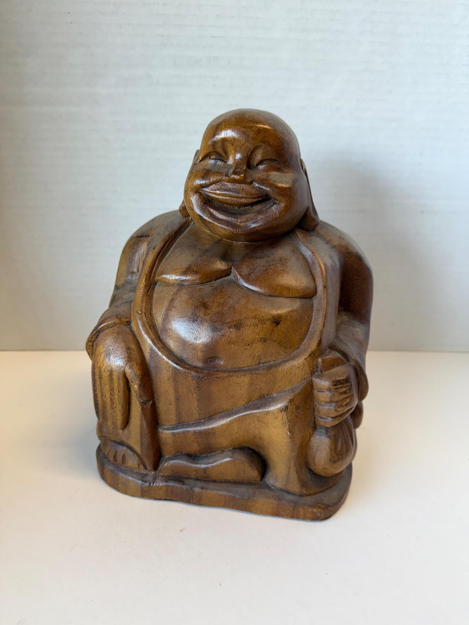 This beautifully hand-carved wooden Laughing Buddha statue brings warmth and joy to any space. Standing 10 inches tall, this solid wood figure features a classic depiction of the Laughing Buddha with a joyful expression, rounded belly, and sack of wealth in hand—symbolizing prosperity, happiness, and abundance. Material: Solid wood Origin: Made in the Philippines Stock #: F505 Condition: Excellent vintage condition with a smooth finish and rich natural wood grain