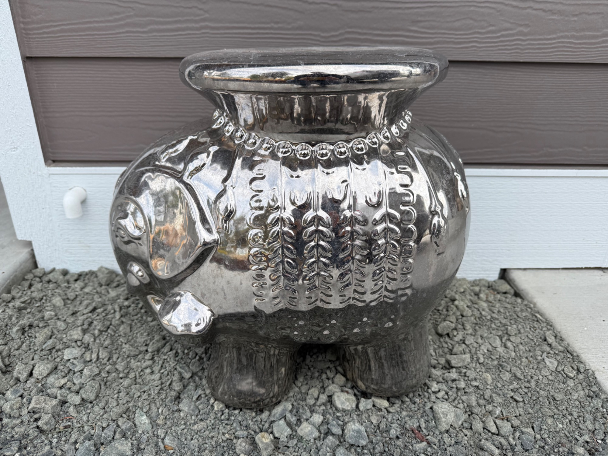 Add a unique and eye-catching accent to your garden or indoor space with this striking decorative elephant-shaped planter. Made from ceramic and finished with a shiny silver metallic glaze, this piece features a beautifully embossed design with ornate patterns around the body, giving it a luxurious and whimsical look. Material: Glazed ceramic with metallic finish Shape: Elephant with four sturdy legs and a wide, open-top bowl (ideal for plants or as a standalone decor piece) Features: Intricate raised patterns, detailed elephant face and feet, multi-hole base (possibly for drainage or ventilation) Condition: Very good; minor signs of use at the bottom