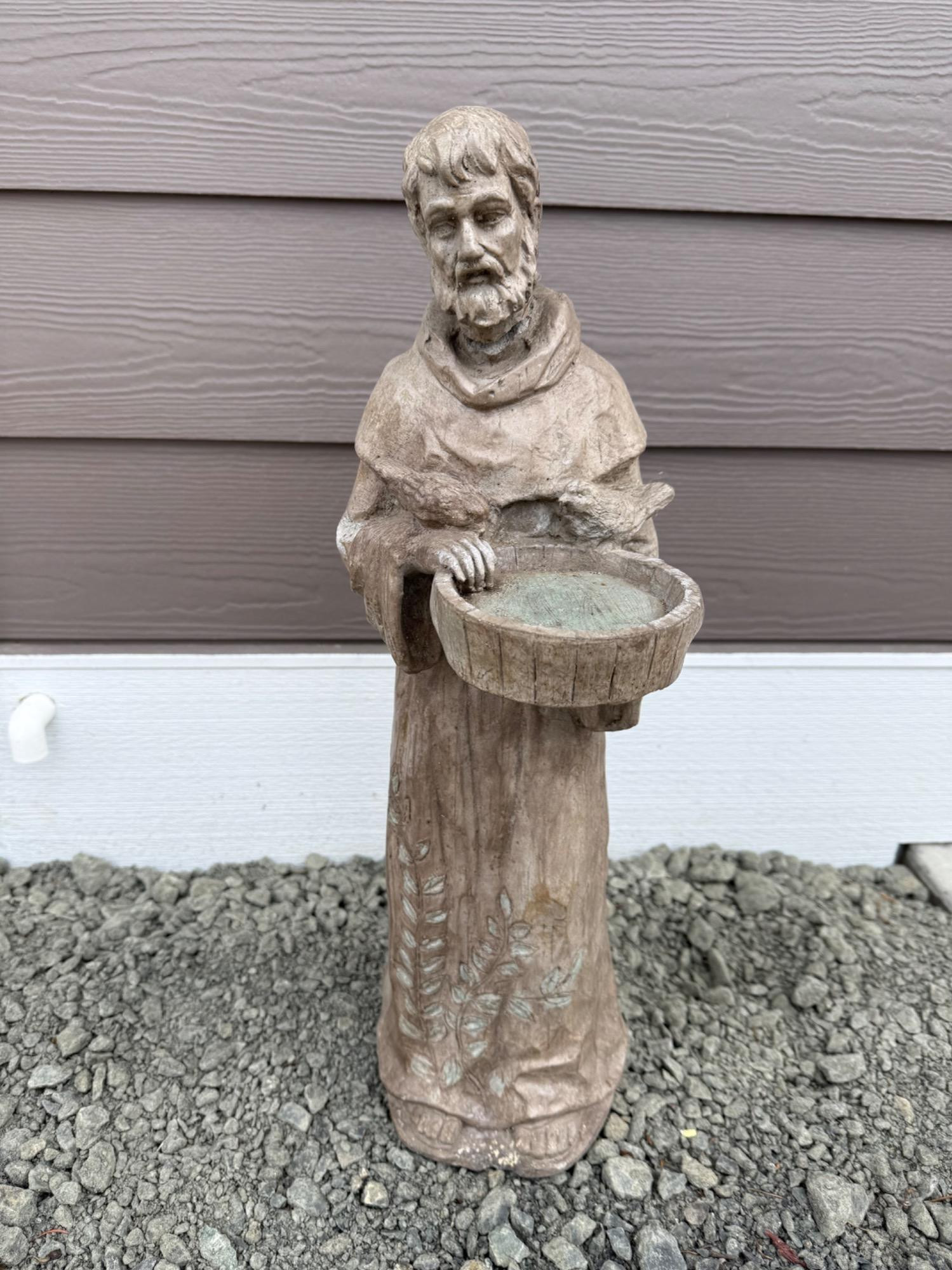 This charming statue depicts St. Francis of Assisi, the patron saint of animals and nature, holding a bowl that can be used as a birdbath or small feeder. The piece is made of a rustic, weathered material with delicate detailing on the robe and facial features. Ideal for garden or outdoor spaces. Condition: Pre-owned with visible wear consistent with age and outdoor use. Note: There is a crack around the neck area (see photo for details)