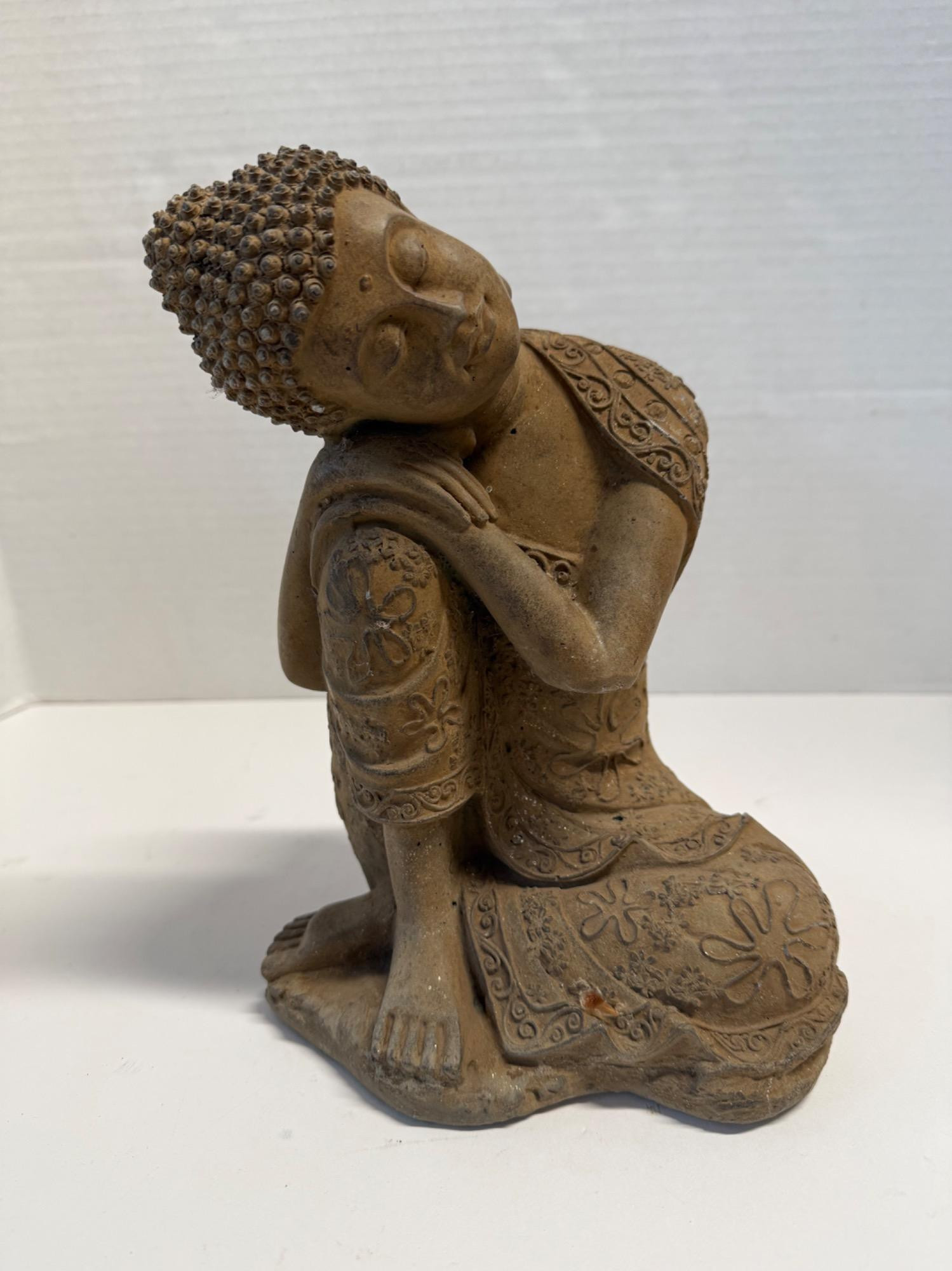 Bring serenity and calm to your space with this beautifully crafted Resting Buddha figurine. This statue features the Buddha in a peaceful seated pose, resting his head gently on one knee with eyes closed in meditation. Intricately detailed floral patterns adorn the robe, symbolizing tranquility and mindfulness. Material: Concrete Color: Earthy brown tones with natural texture Condition: Gently used, with minor wear that adds to its rustic charm