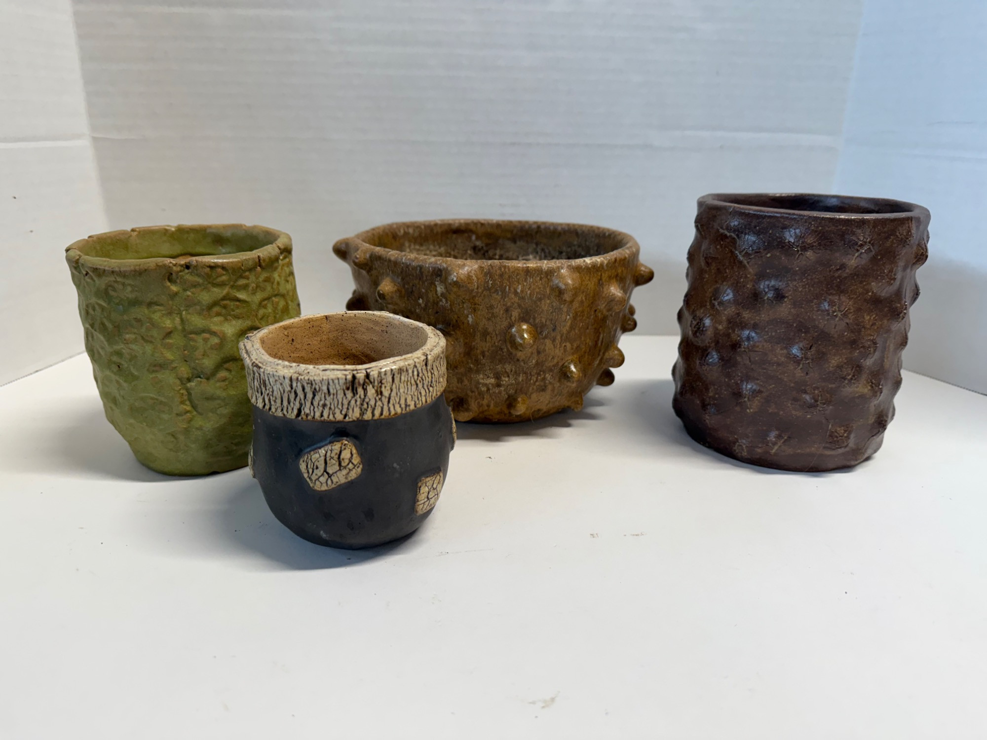This unique collection features four handcrafted stoneware planters by Root Down Pots. Each piece showcases earthy tones, tactile textures, and individual character, perfect for small plants, succulents, or as standalone art pottery. The bottoms are marked with the maker's signature stamp and dates ('22 and '23), along with multiple drainage holes for functionality. Measurements: approximately 3.5" to 5.5" tall