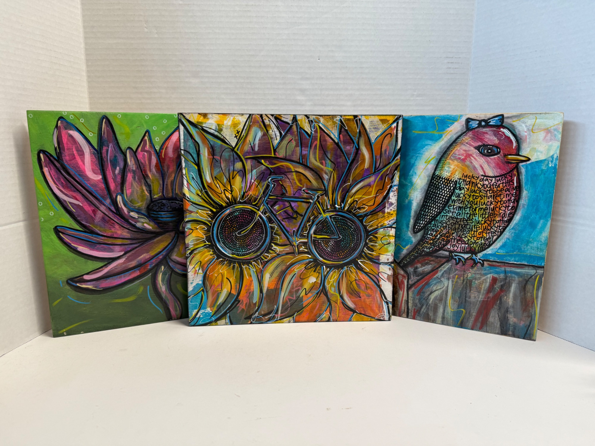 This is a vibrant and expressive collection of three original paintings by renowned artist Amy Baca Lopez. Each piece is hand-painted and signed by the artist, showcasing her signature style of rich colors, layered textures, and inspirational themes. Included in the set: Pink Lotus Flower – A vivid pink and purple lotus bloom set against a lush green background, symbolizing peace and renewal. Signed by the artist in the bottom corner. Sunflower Bicycle – A unique fusion of nature and motion, this painting features a bicycle hidden within golden sunflower petals. Signed and inscribed on the back: “Live in Peace & Love – Amy Baca Lopez, 2019.” Colorful Bird with Text – A whimsical bird with a blue bow perched on a ledge, its body filled with empowering words like “joy,” “hope,” “love,” and “strength.” The back is signed with a message of thanks.