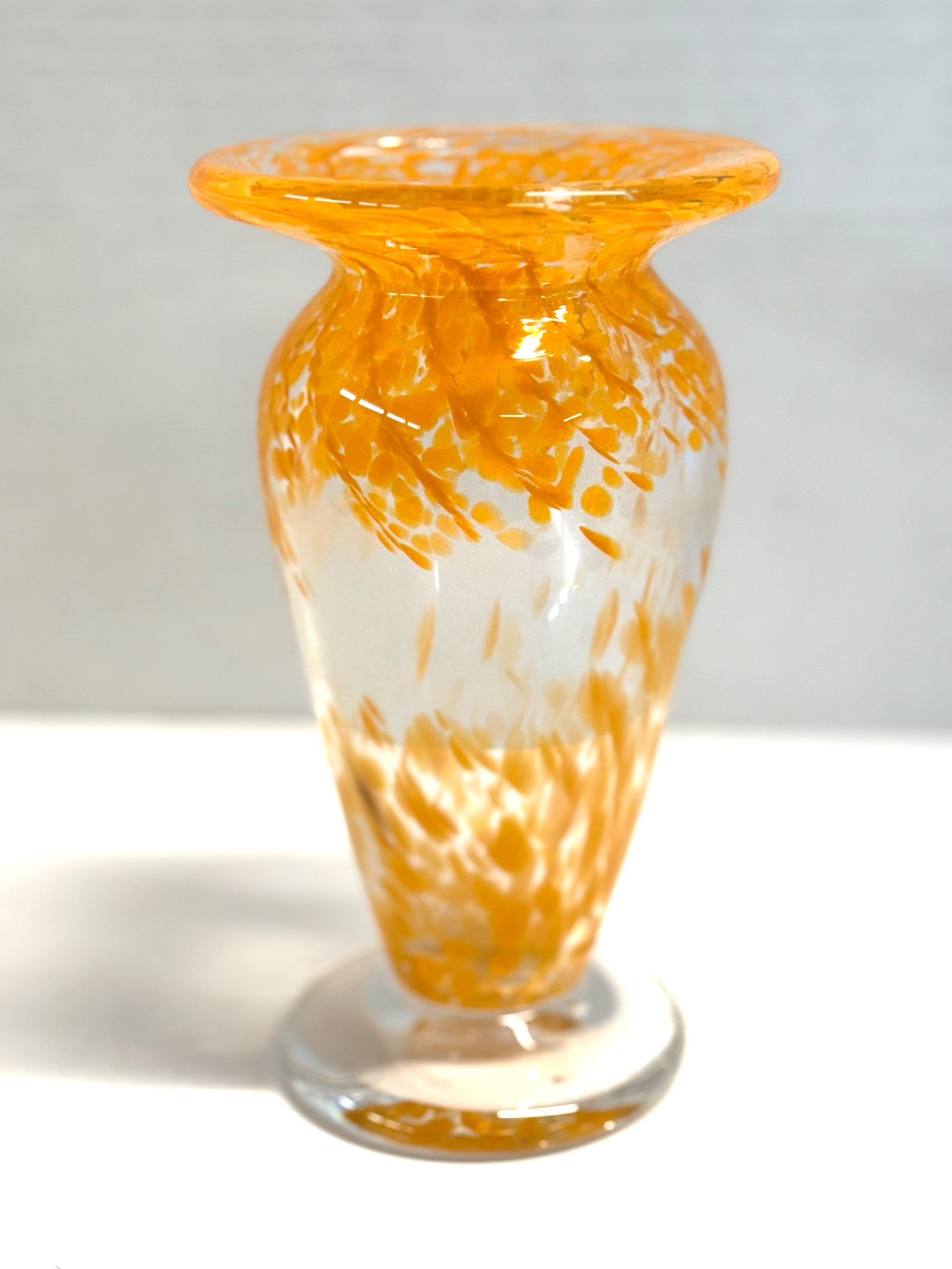 This stunning handblown art glass vase features a vivid swirl of orange and white flecks suspended within clear glass, beautifully capturing the fluidity and elegance of modern glass artistry. Its flared rim and smoothly tapered body enhance its sculptural appeal, making it an eye-catching decorative centerpiece. Medium: Handblown art glass Colors: Orange and white on clear glass Features: Signed on the base (artist unknown) Condition: Excellent with no chips or cracks