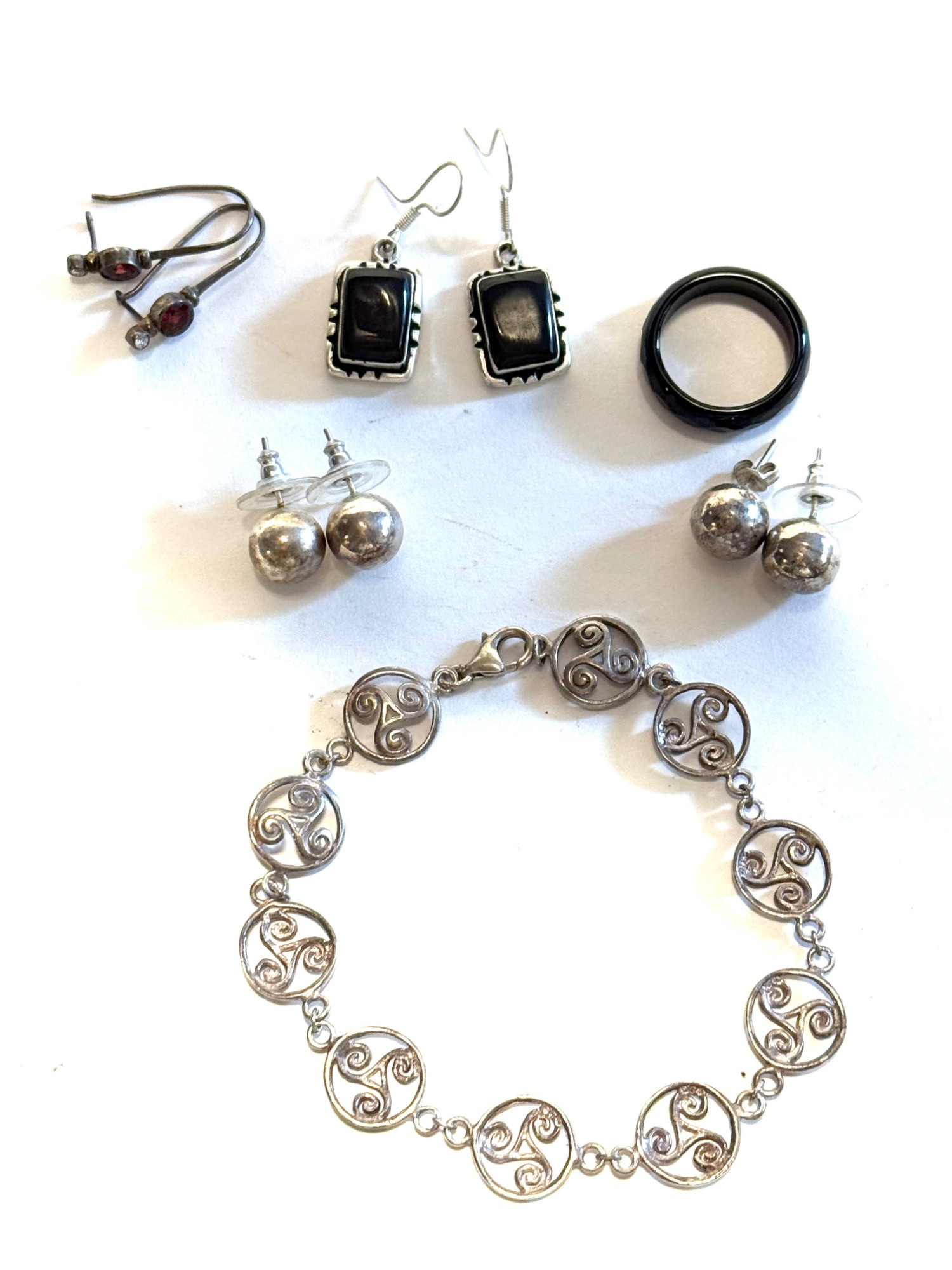 This stylish collection features a variety of elegant and unique pieces: Two pairs of dangle earrings: One features deep red stones with a vintage flair, while the other has bold black rectangular stones set in silver-tone frames. Two pairs of silver-tone stud earrings: Classic round ball studs that add a simple yet sophisticated touch to any outfit. One striking black ring: Sleek and modern, perfect for making a subtle statement. One intricate silver-tone bracelet: Composed of circular links with a beautiful swirling triskelion-style design, offering both elegance and artistic flair. Condition: Excellent, minimal signs of wear.
