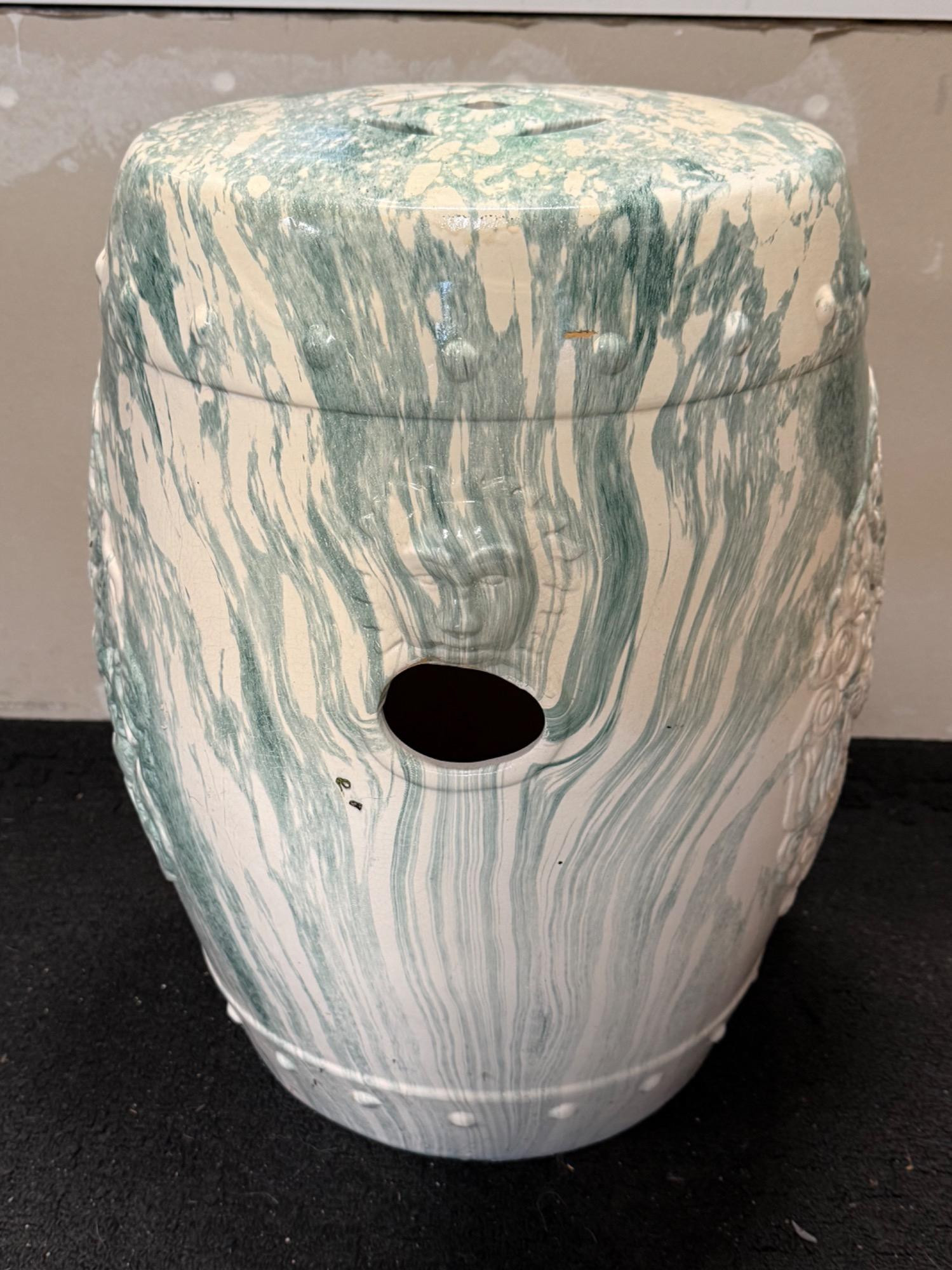 This unique green marbled garden stool brings organic charm to any space. Featuring a flowing, water-like marbled pattern in green and white, this ceramic stool offers both visual appeal and versatile functionality. With classic cutout detailing and a glossy finish, it works beautifully as a side table, plant stand, or extra seating.