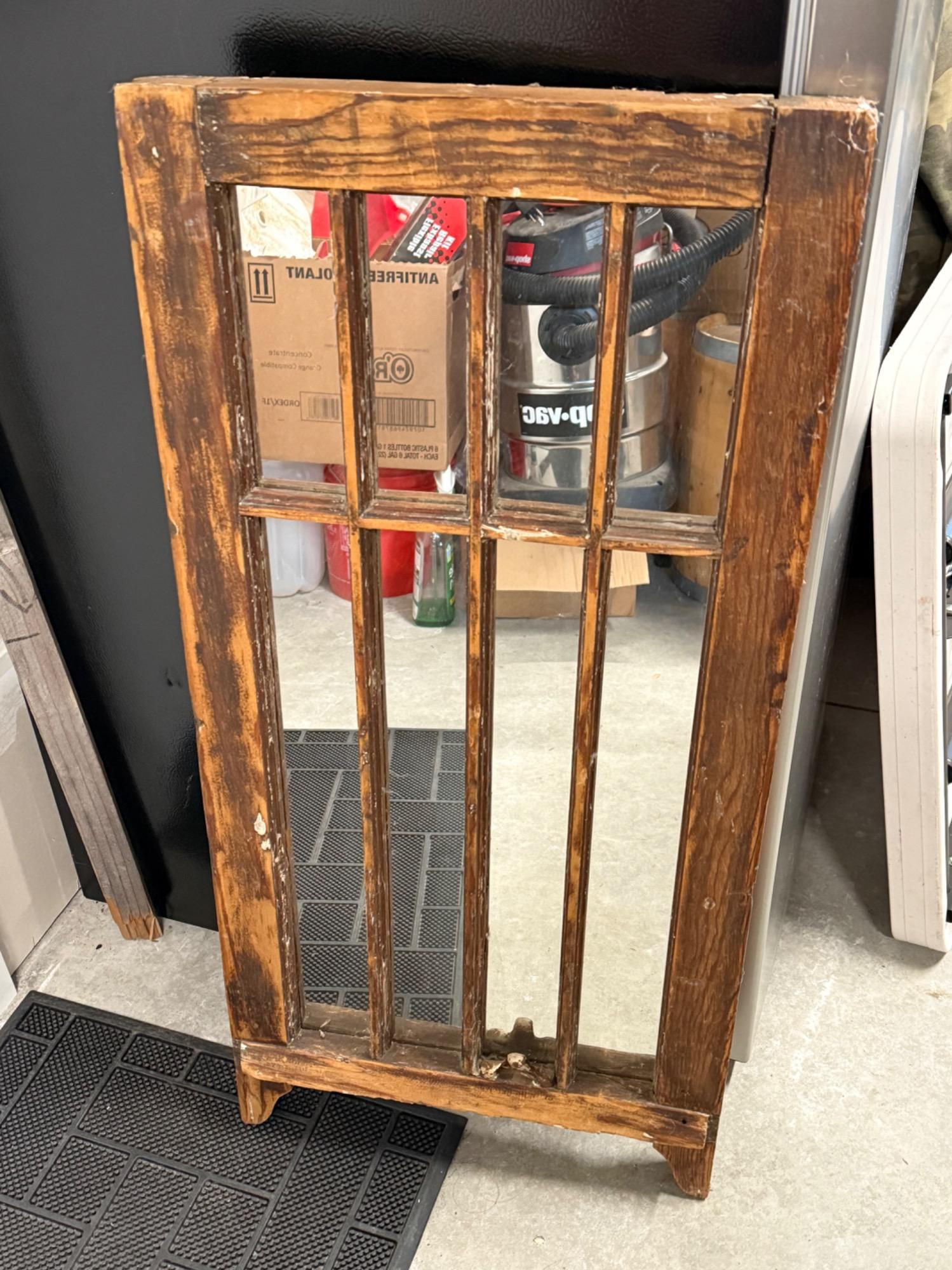Add a touch of vintage charm to your space with this antique-style hanging window mirror, crafted from an old wooden window frame. This piece features aged, weathered wood with visible patina and wear that brings out its authentic character. The mirror panes are set behind the original wooden grid, offering a unique and rustic windowpane effect. Materials: Solid wood frame with mirror inserts Condition: This piece shows heavy rustic wear including chipped wood, peeling paint, minor cracks, and signs of age and use (see detailed photos). Some old adhesive and structural repairs are visible—perfect for those who love the distressed, reclaimed look.
