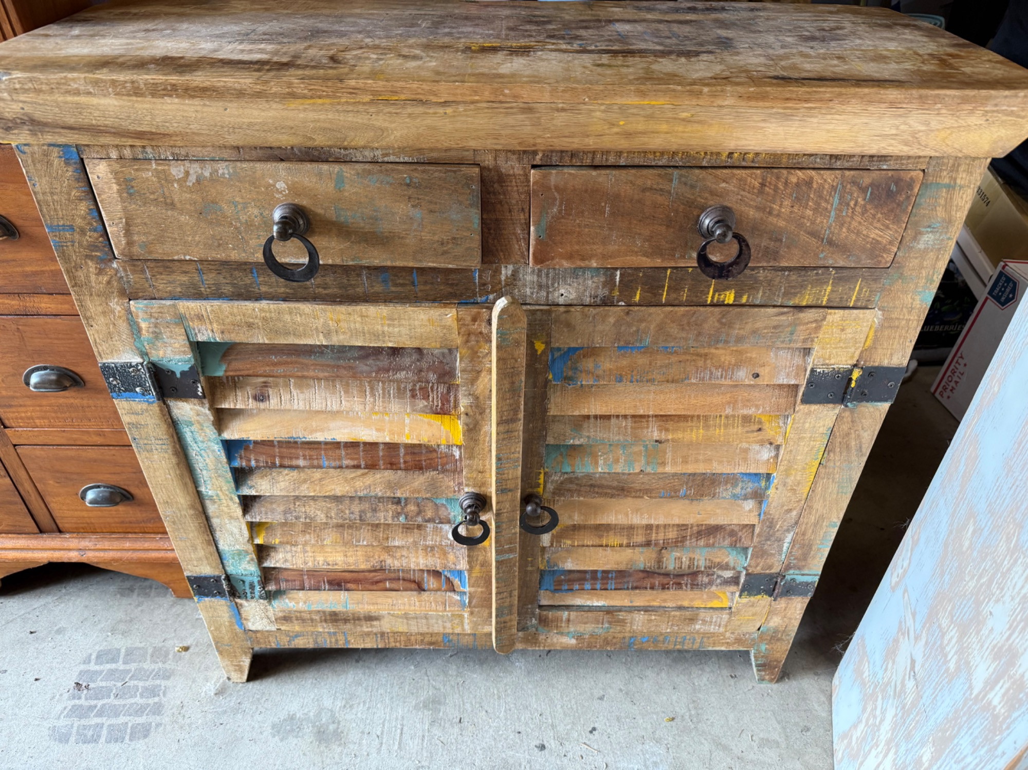 Add character and sustainable flair to your space with this charming shabby-style sideboard crafted from recycled wood. Featuring a beautifully weathered finish with hints of teal, yellow, and blue paint remnants, this piece captures the essence of rustic vintage charm. The sideboard offers practical storage with two spacious drawers and a double-door cabinet that opens to reveal a full-length interior shelf—perfect for organizing tableware, linens, or household essentials. The slatted door design, sturdy iron ring handles, and distressed metal hinges add to its authentic farmhouse appeal. Features: Made from eco-friendly recycled wood 2 drawers with metal ring pulls 2 louvered cabinet doors with interior shelf Distressed multicolor finish for a vintage look