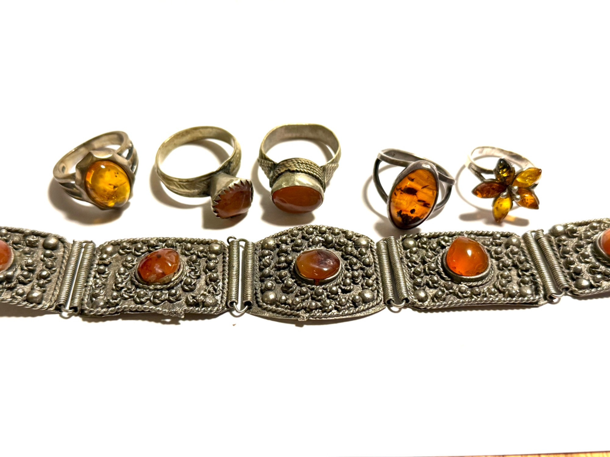 Lot # 124 - Amber and Other Gemstone Rings and Bracelet