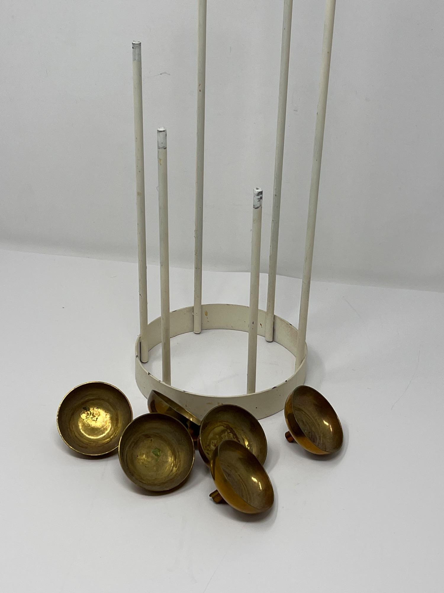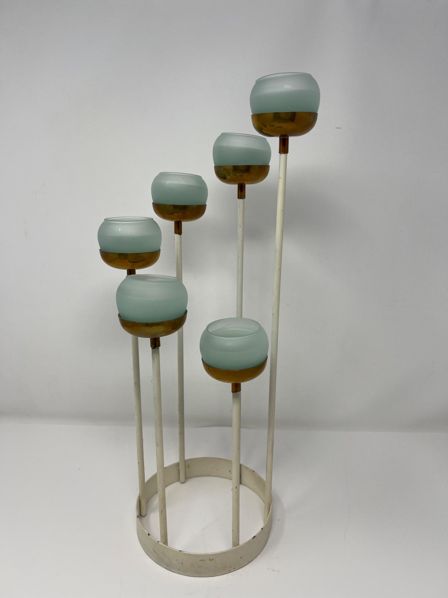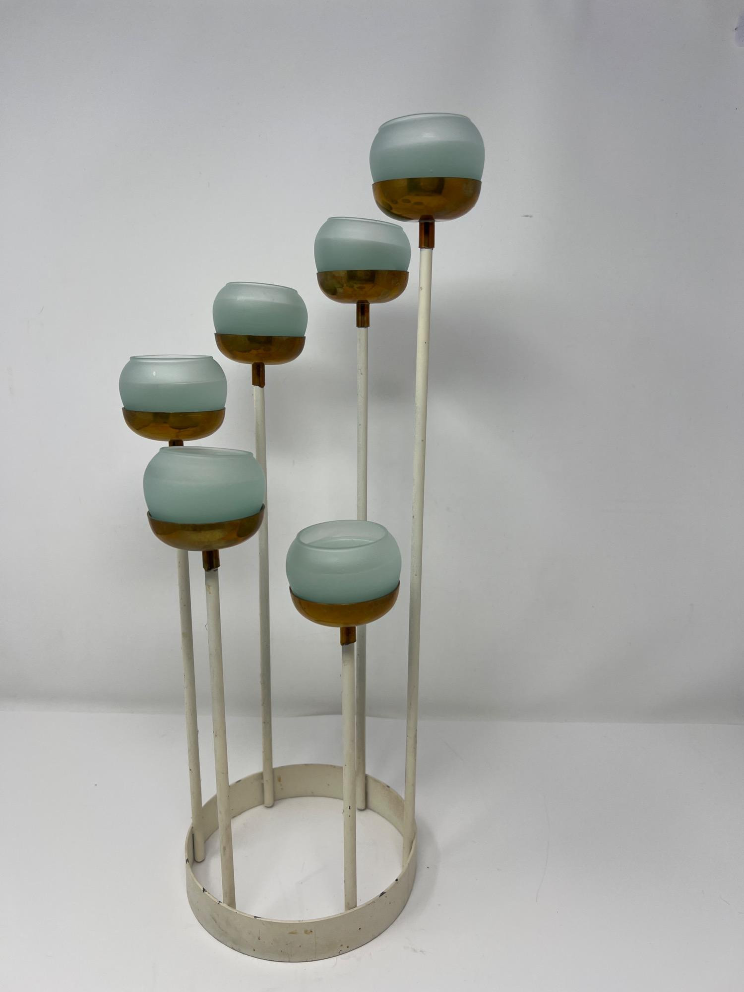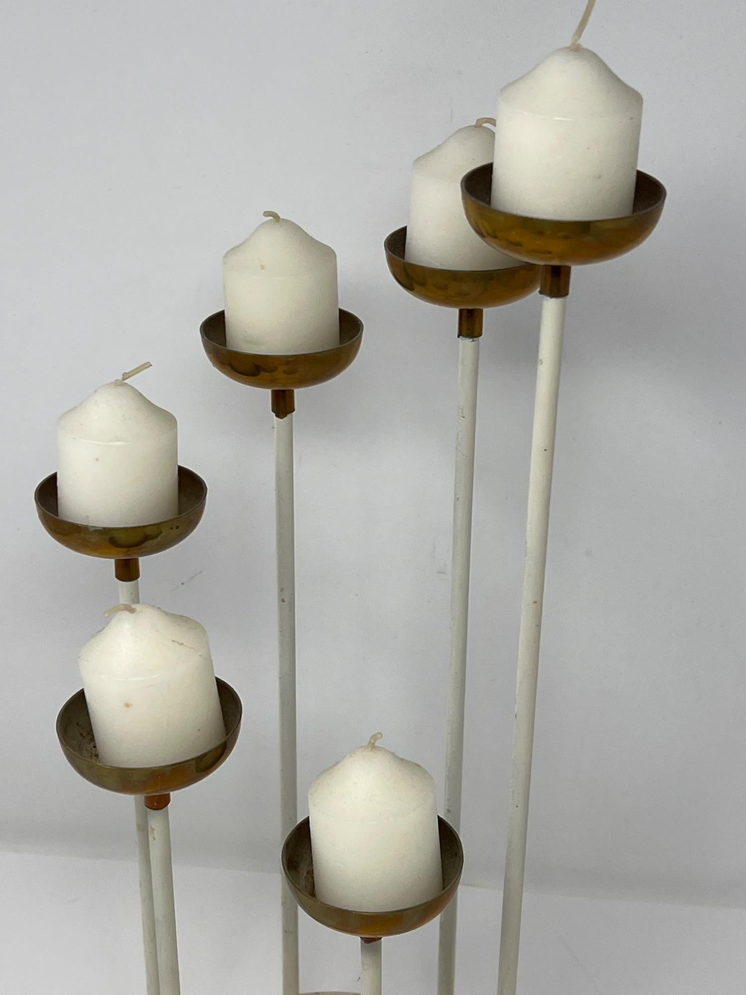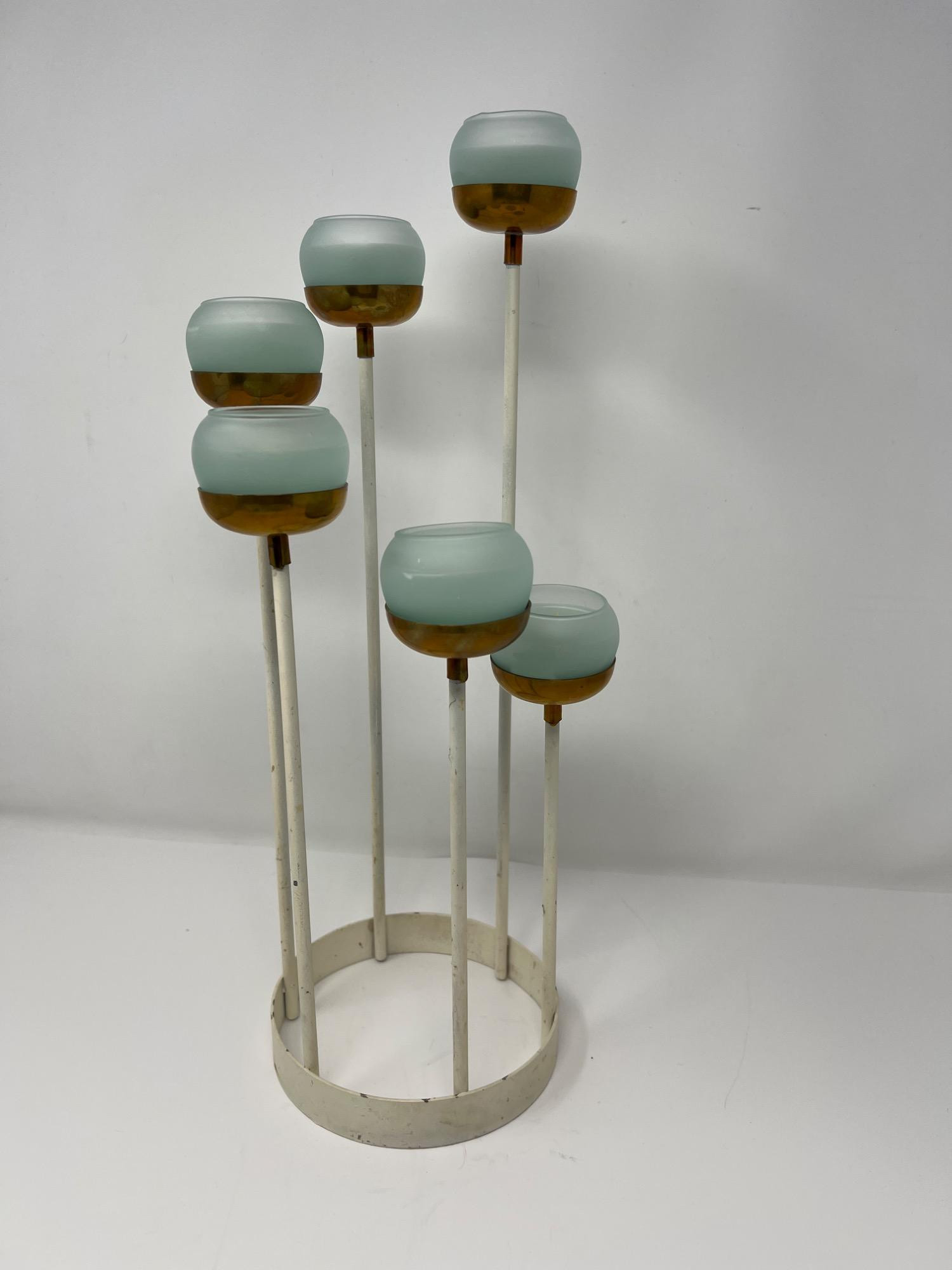 Minimalist mid century 6 piece candelabra with removable brass cups that set onto metal rods with metal base. Seafoam green glass cups are Pier 1 imports and added as an extra feature to this auction.