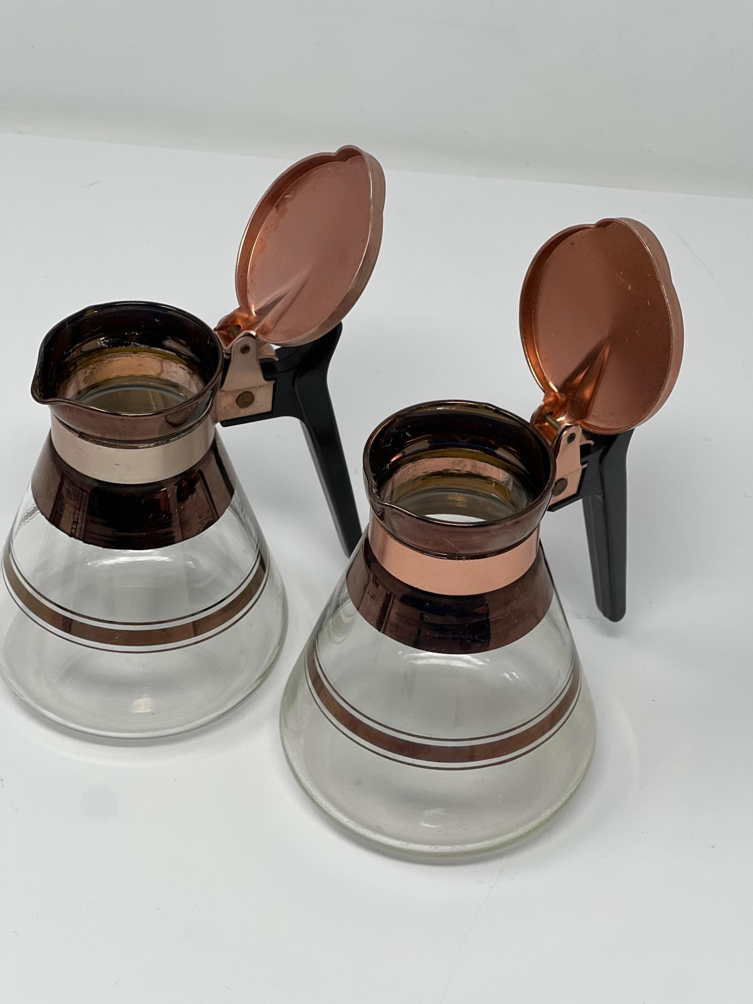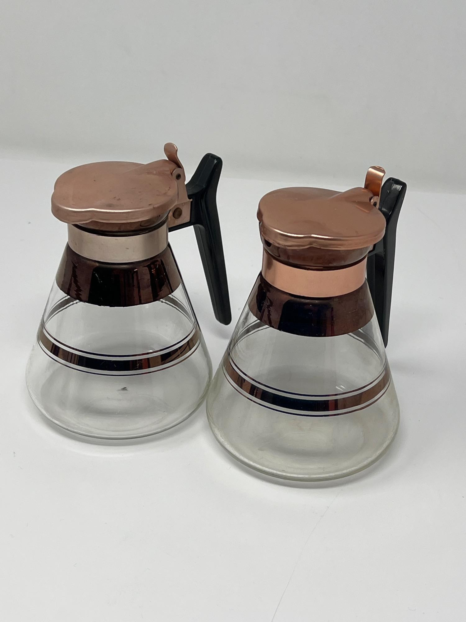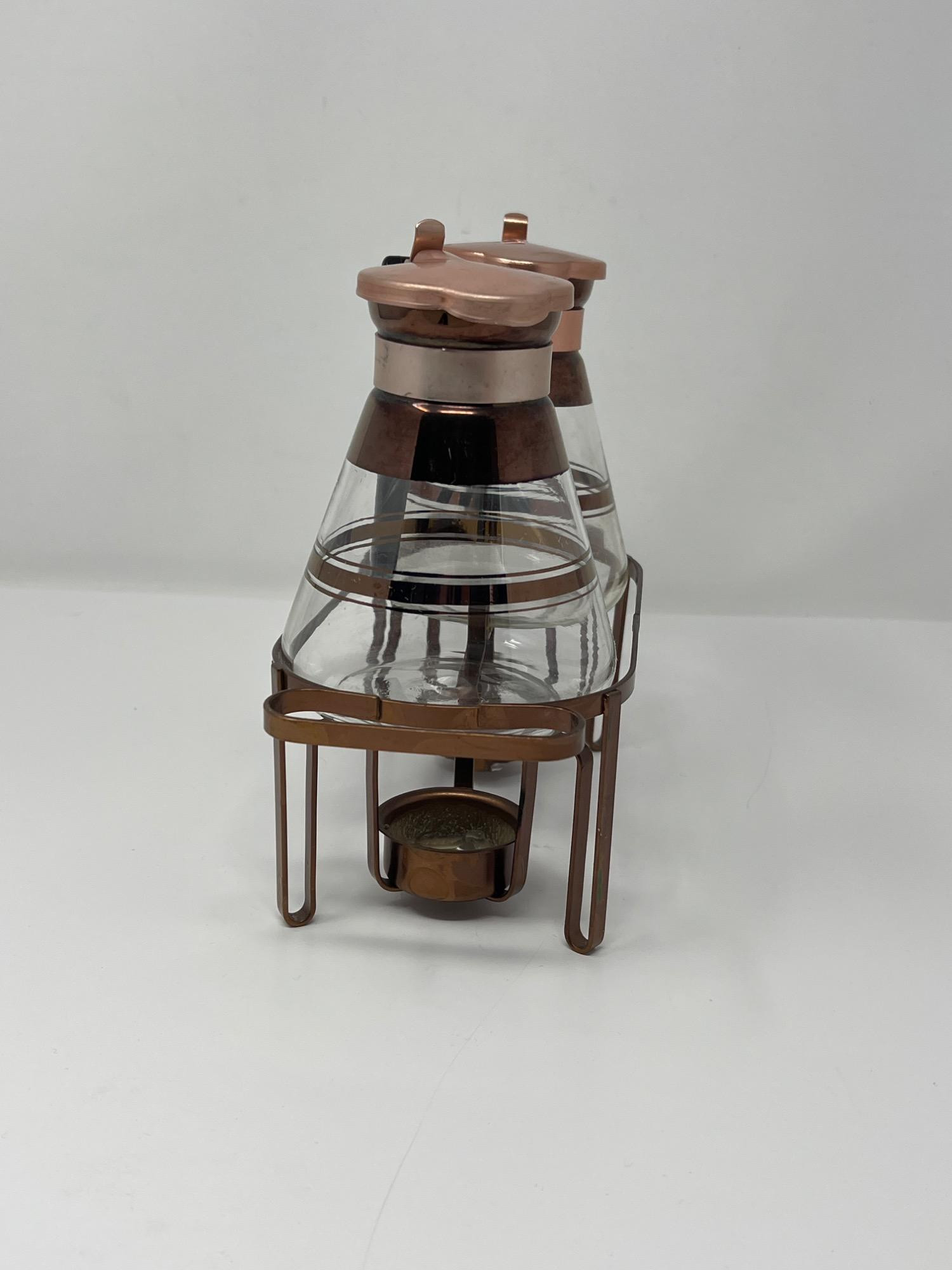 Mid century carafes to warm syrup for pancakes and/or waffles. Glass with copper tops. Carafes measure 5.5” tall x 4” round Overall
