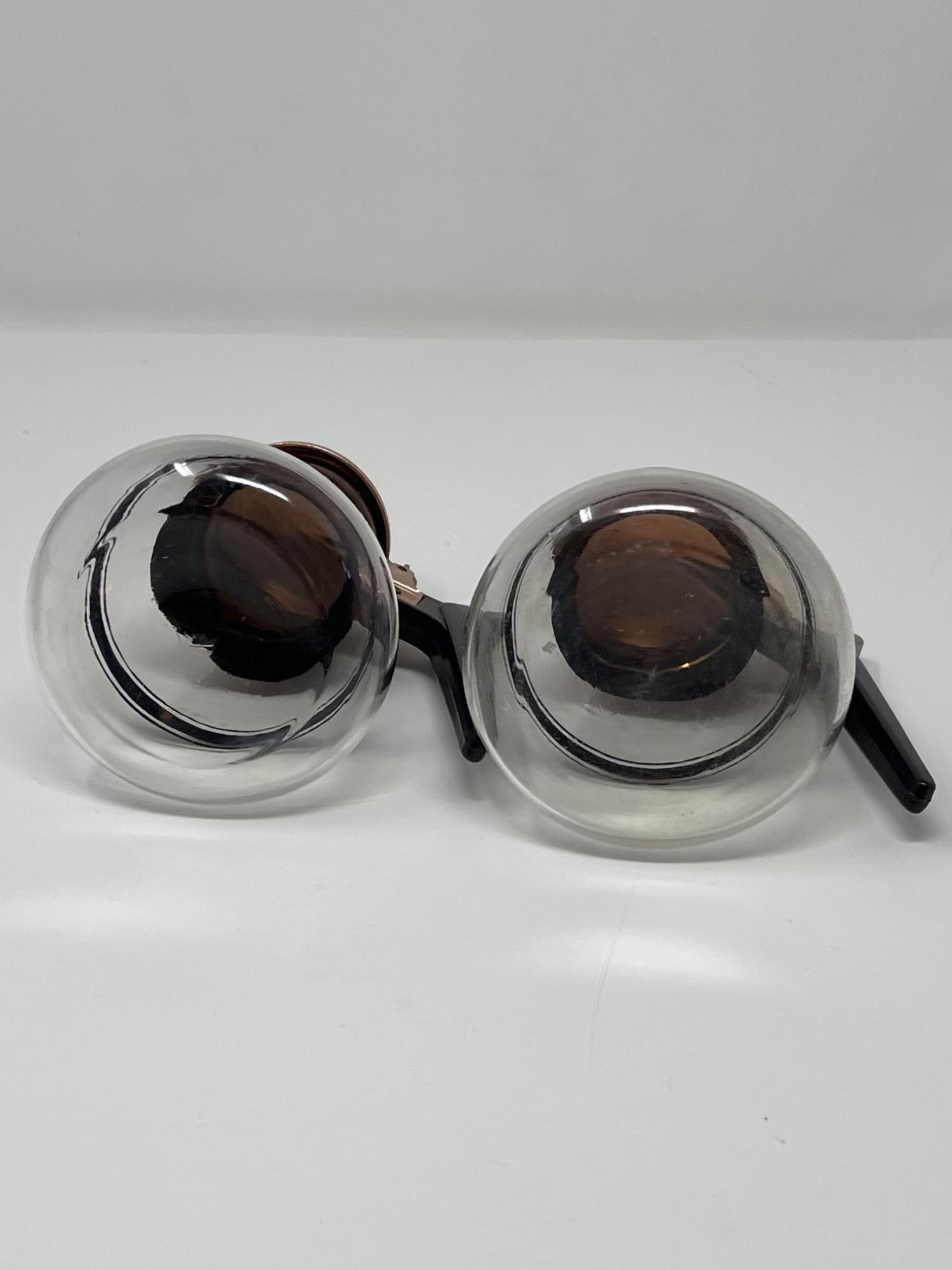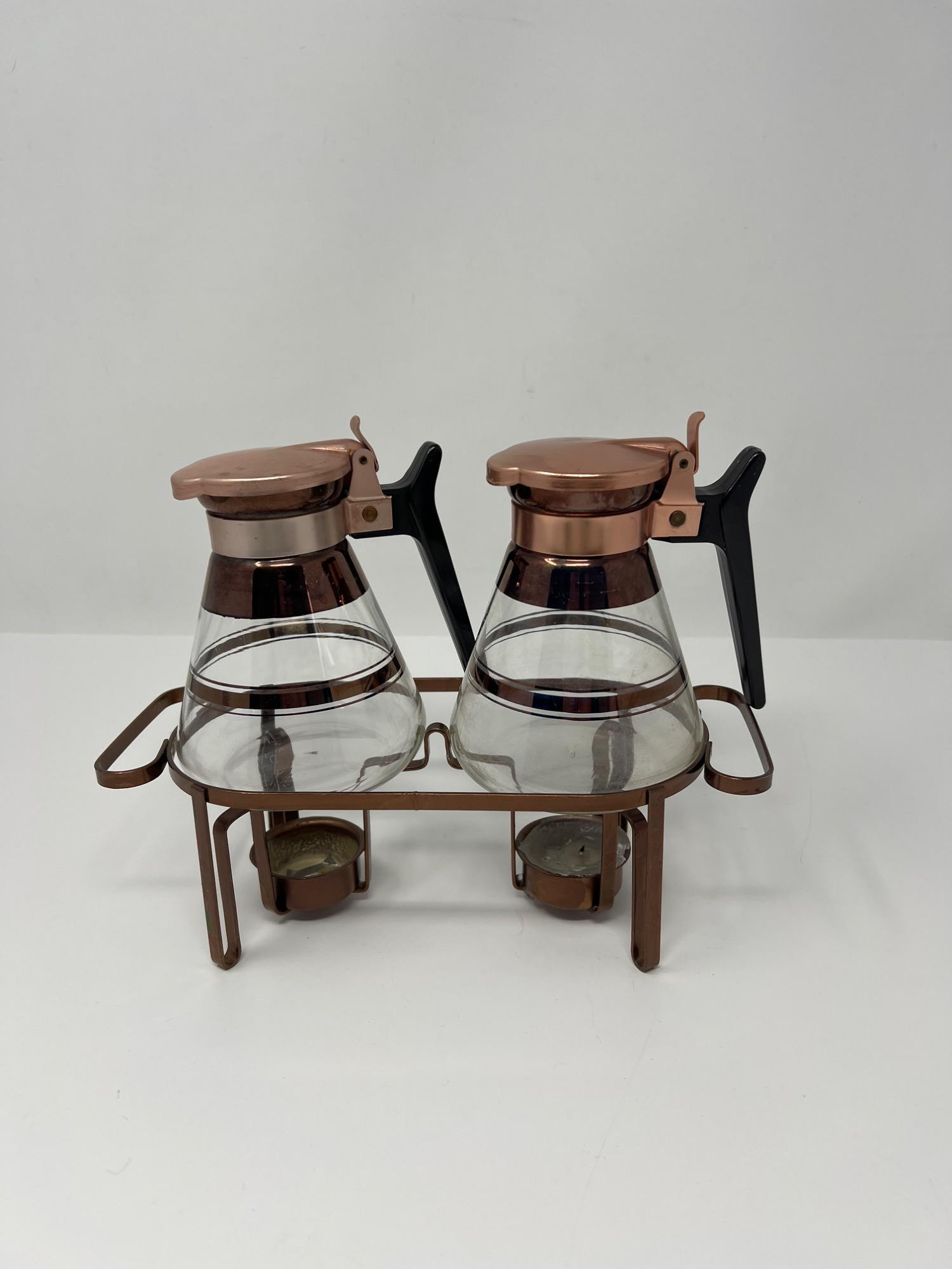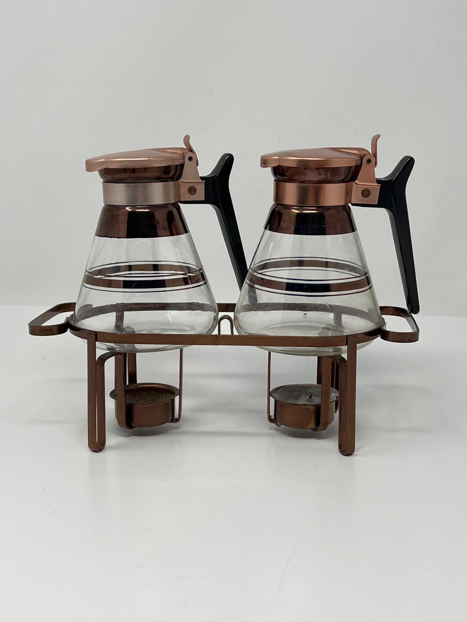 Mid century carafes to warm syrup for pancakes and/or waffles. Glass with copper tops. Carafes measure 5.5” tall x 4” round Overall