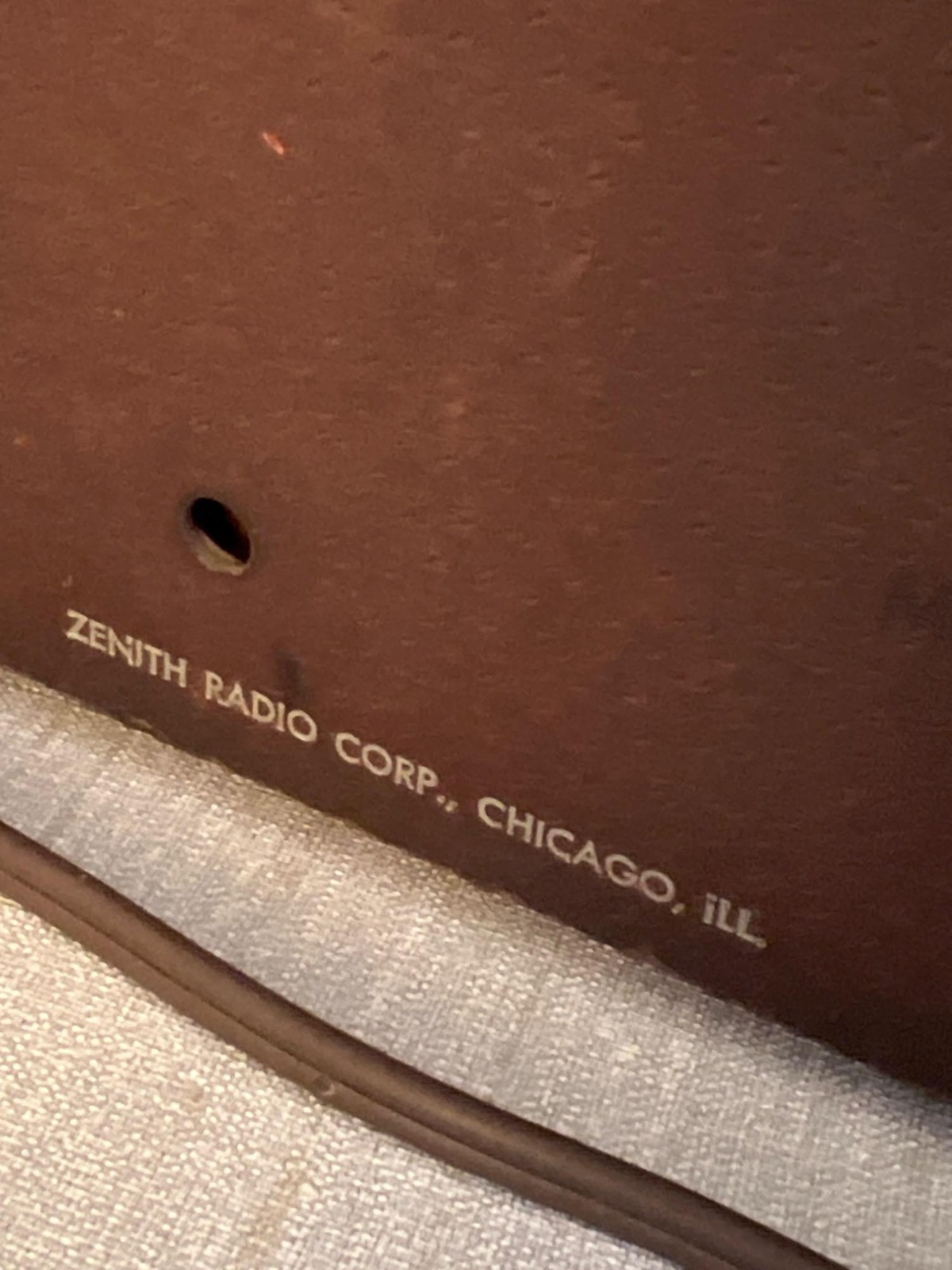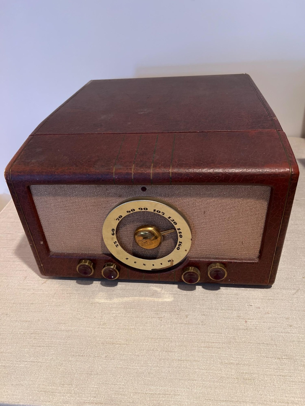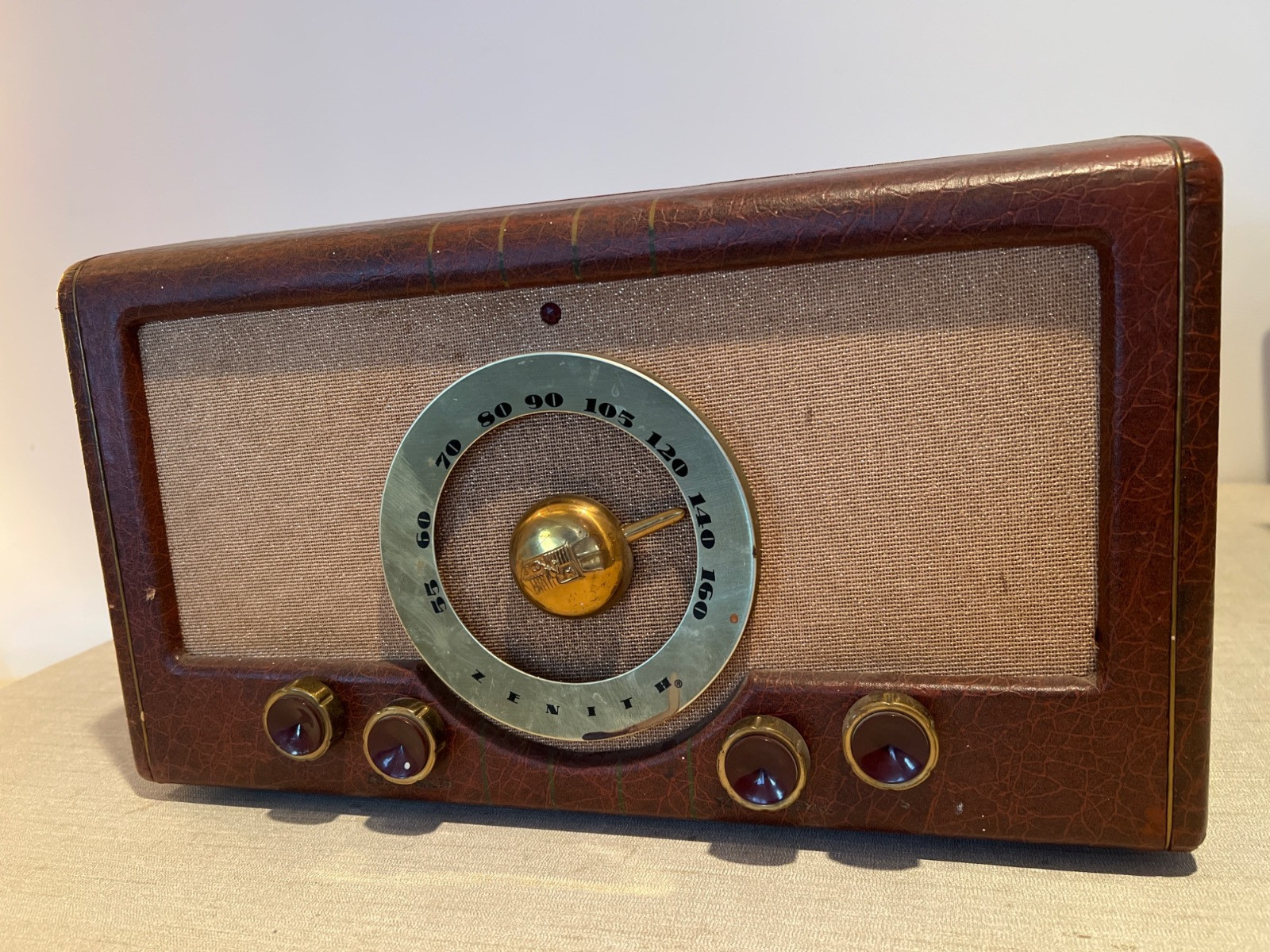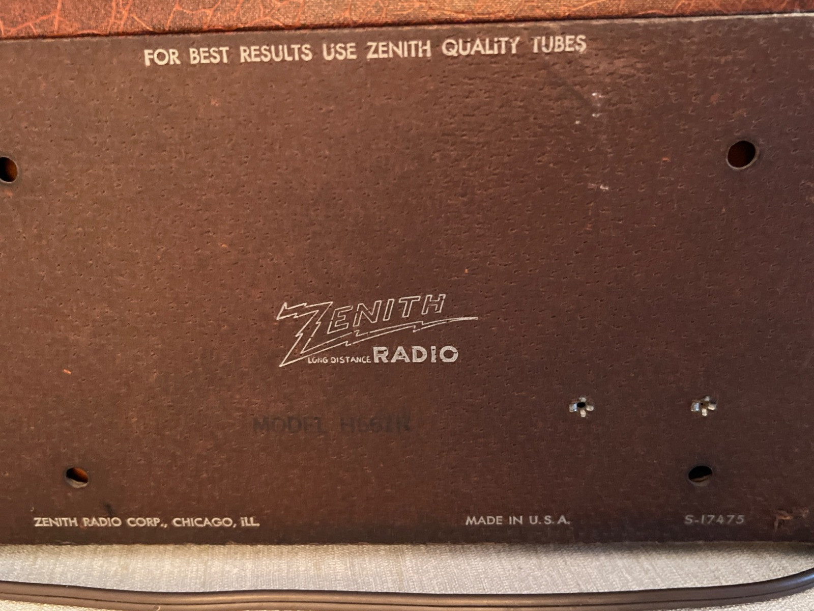Antique model of Zenith electronic AM/FM radio and loop antenna. Radio functions. Phonograph spins. Otherwise, no further testing. Click here for more information about Model H661R Ch= 6H01 - Zenith Radio Corp.; Chicago. S-17475