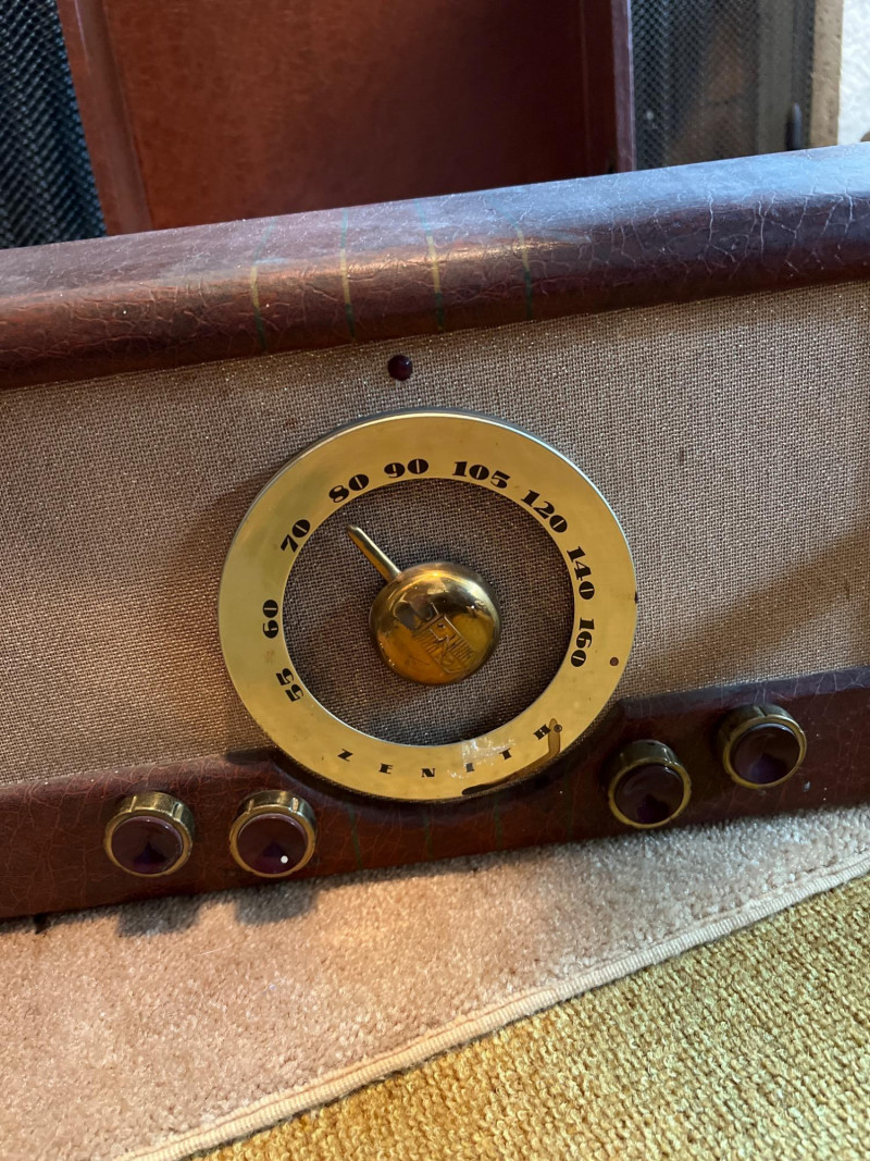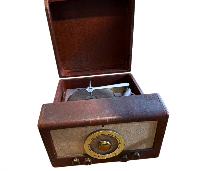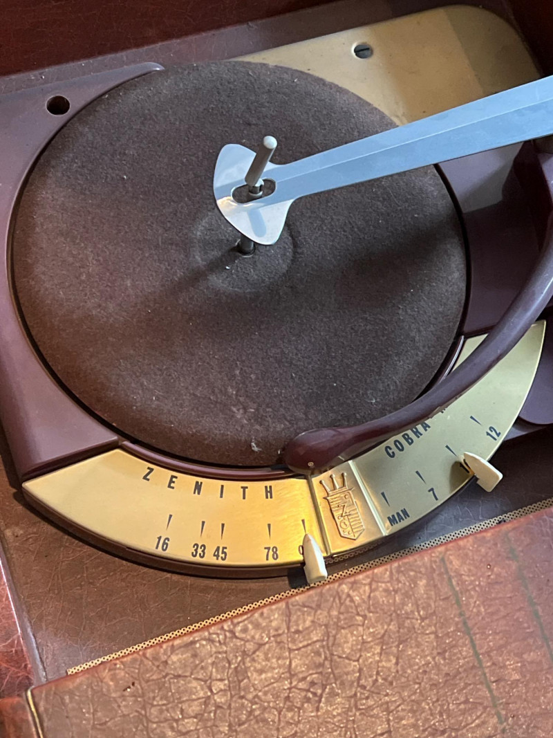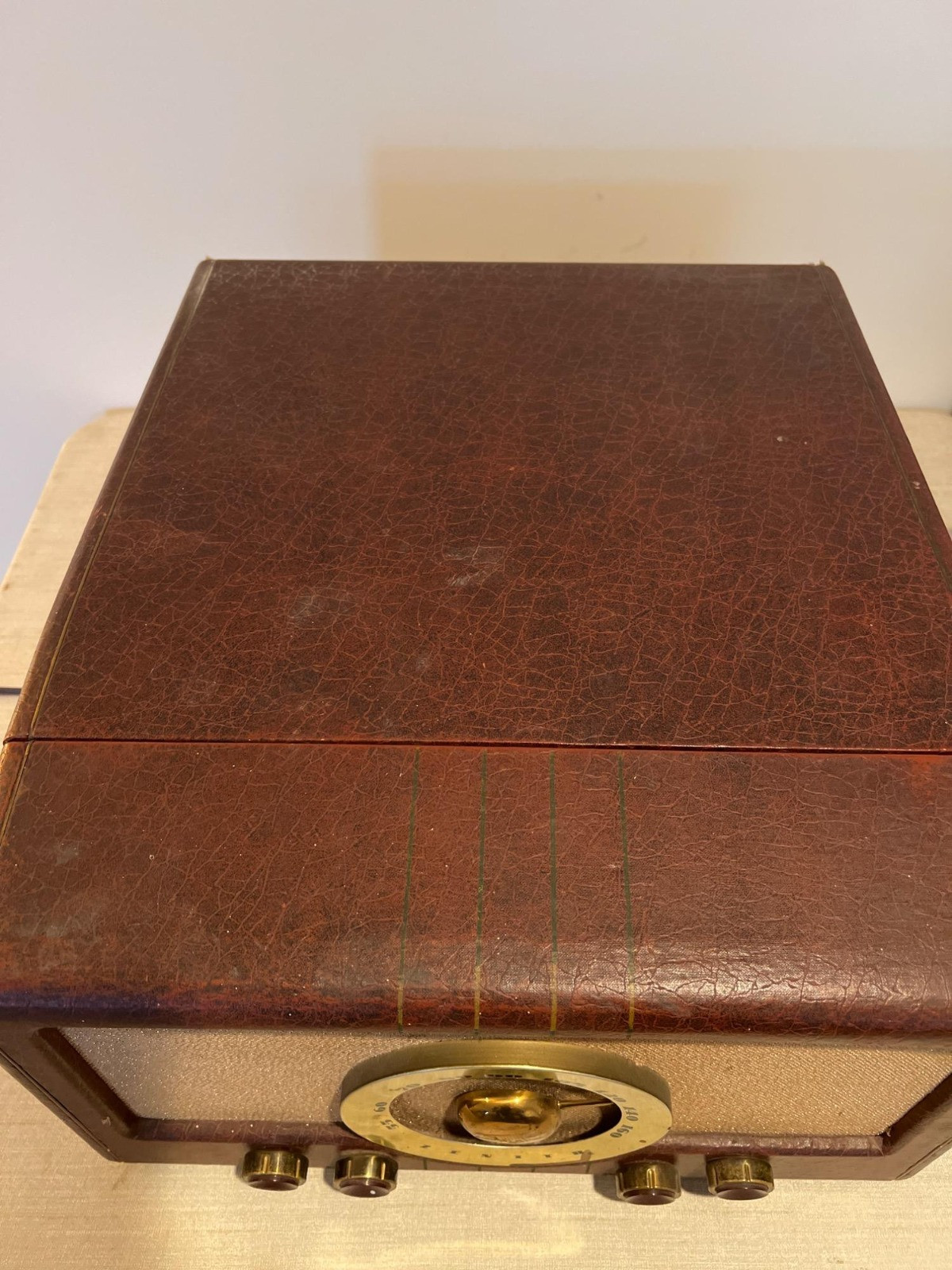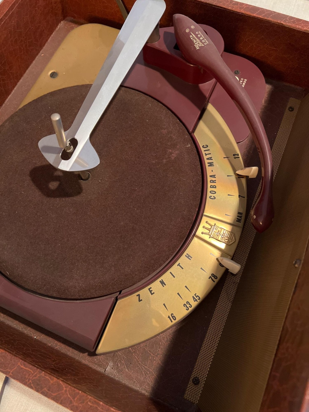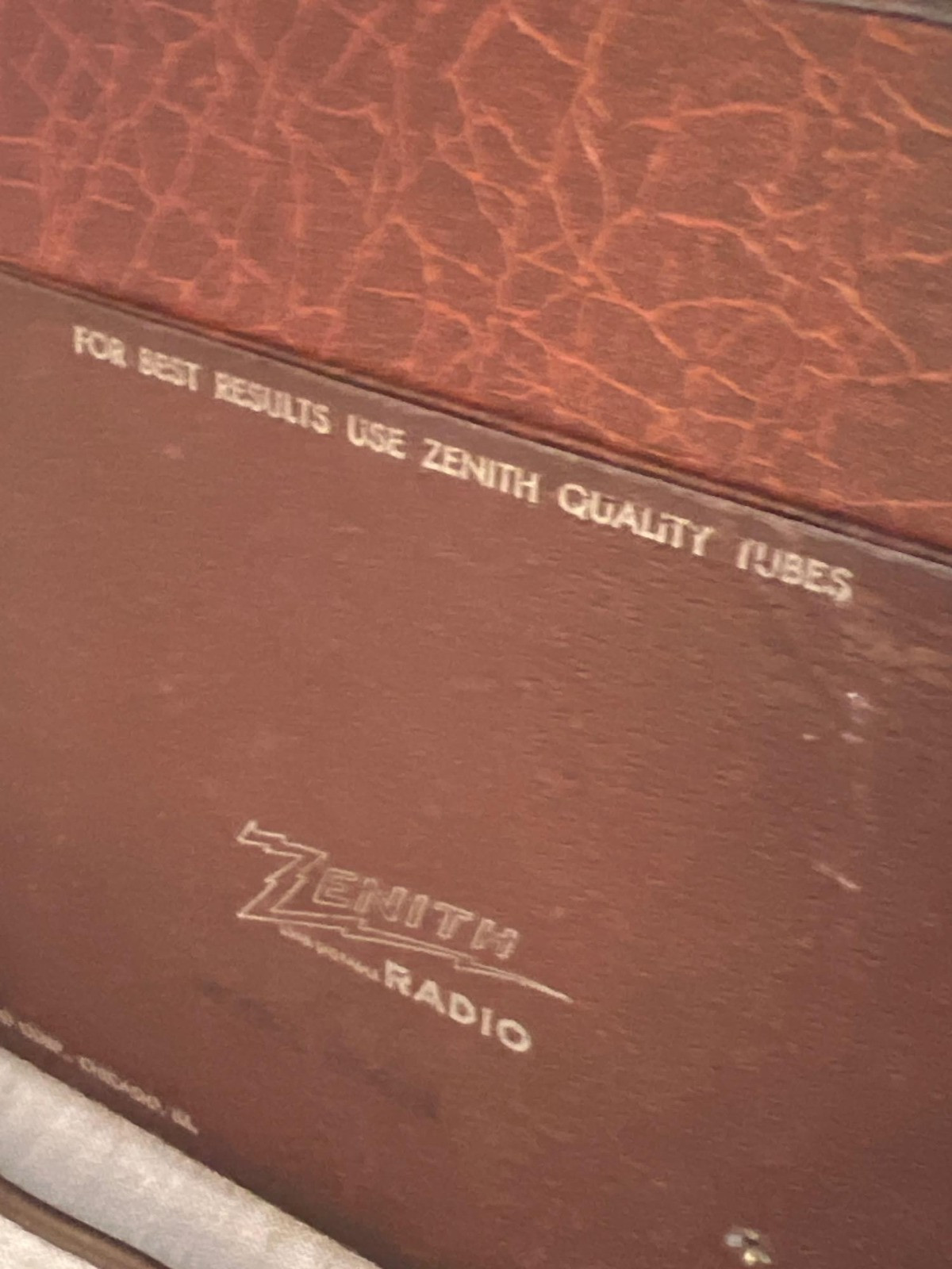Antique model of Zenith electronic AM/FM radio and loop antenna. Radio functions. Phonograph spins. Otherwise, no further testing. Click here for more information about Model H661R Ch= 6H01 - Zenith Radio Corp.; Chicago. S-17475