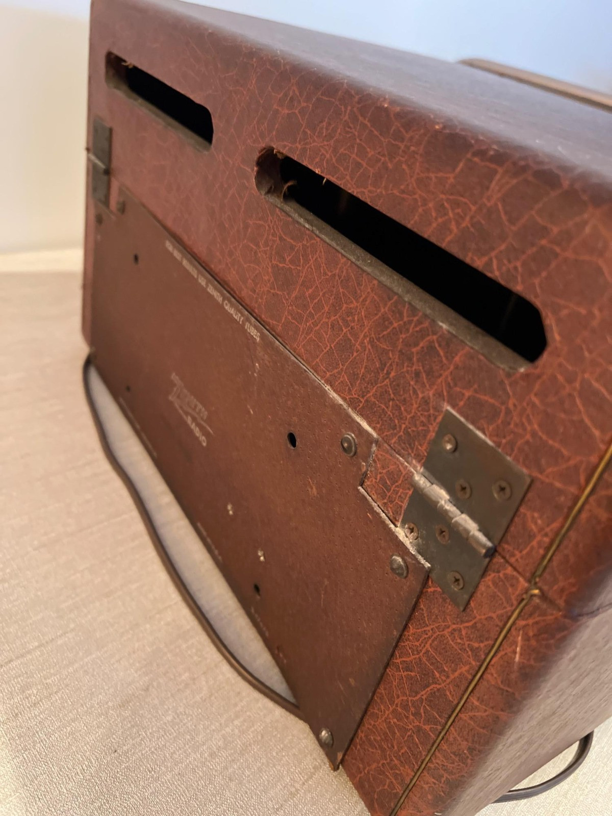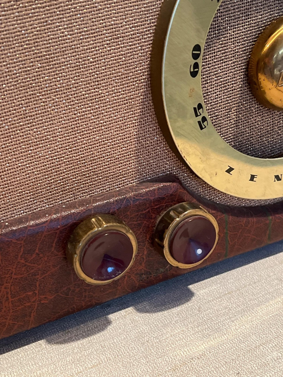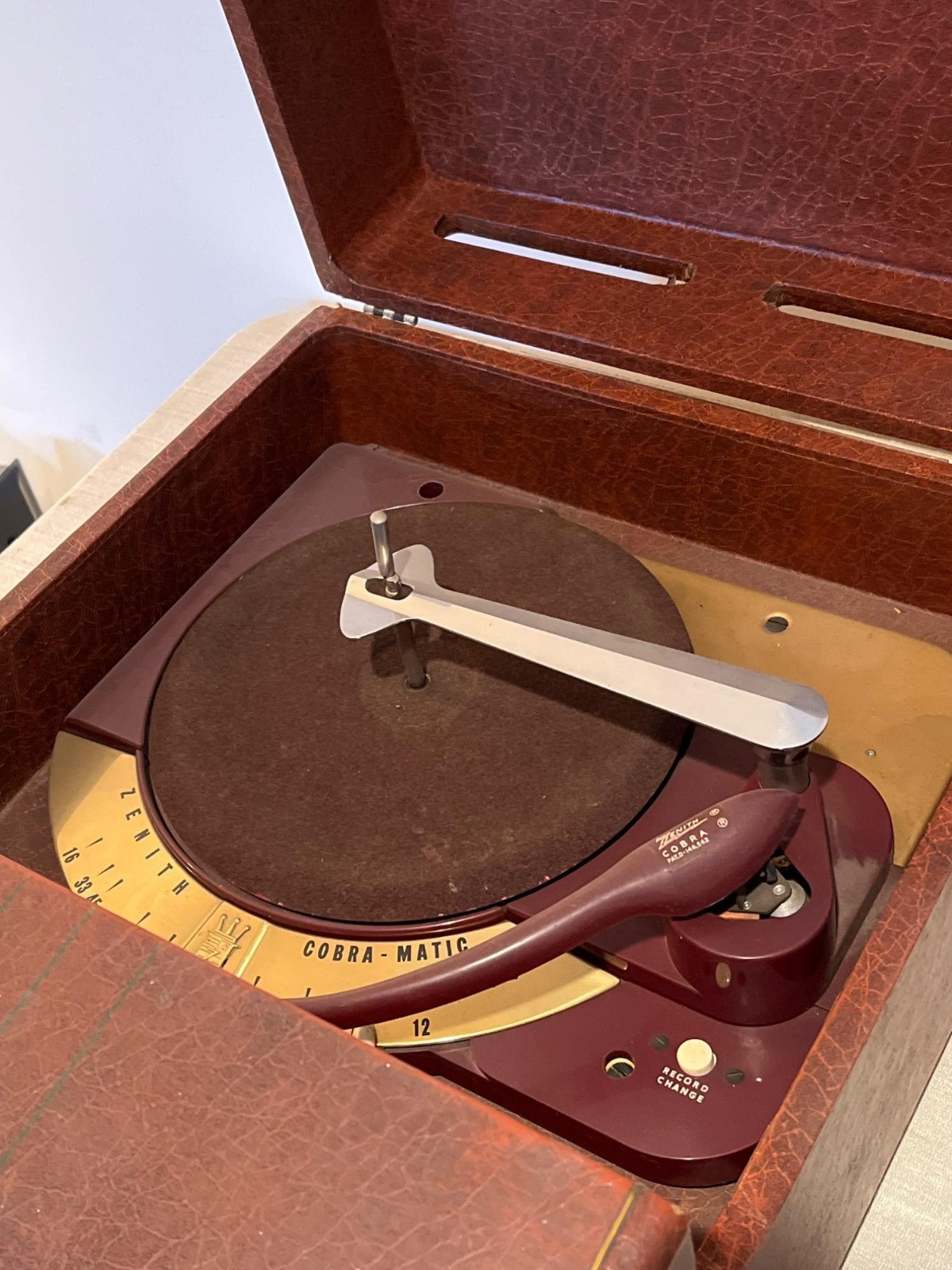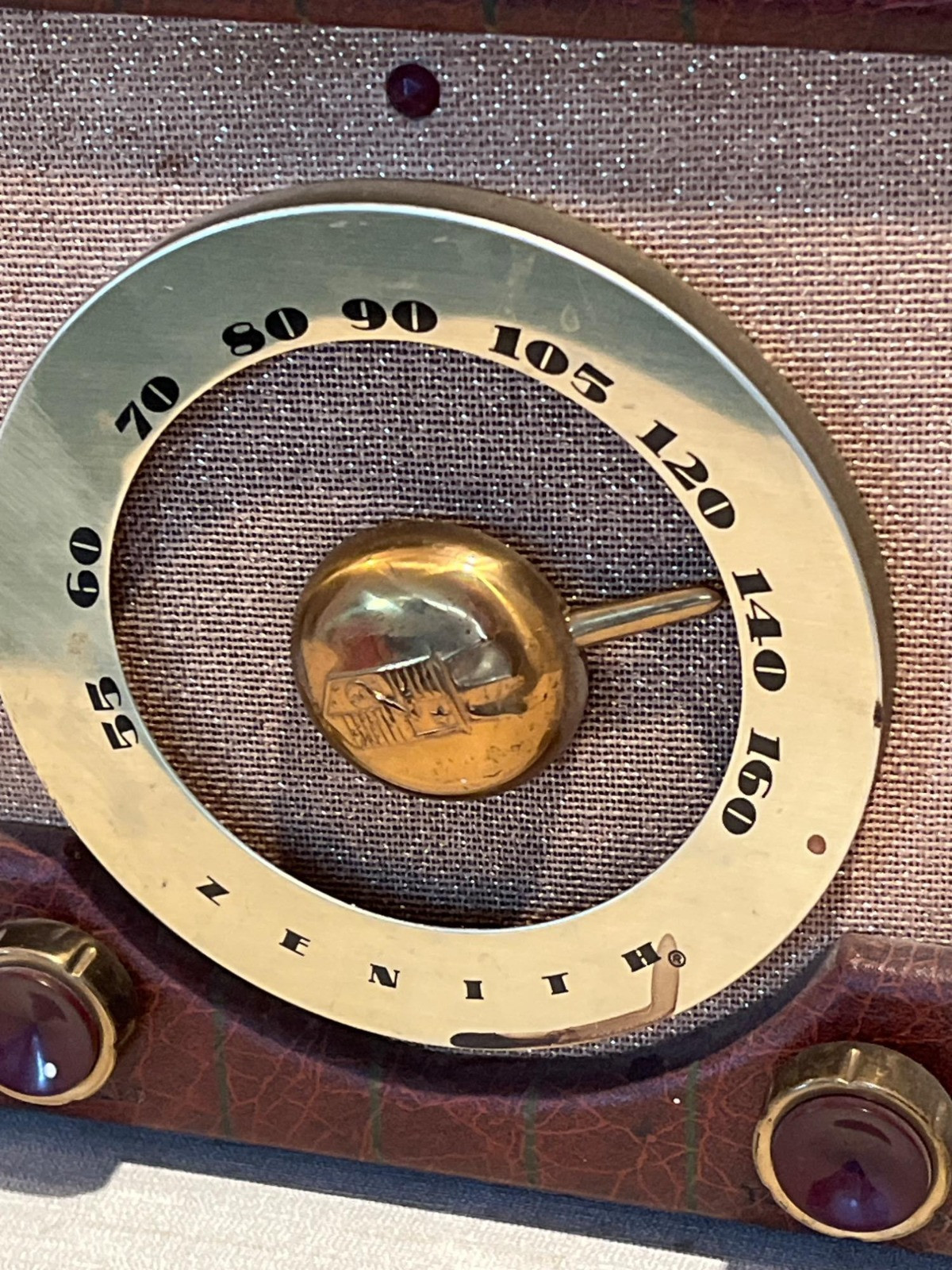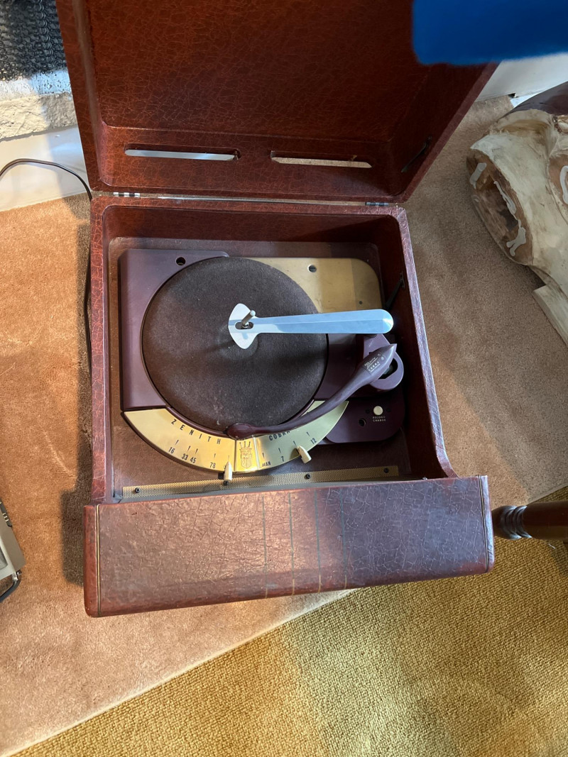Antique model of Zenith electronic AM/FM radio and loop antenna. Radio functions. Phonograph spins. Otherwise, no further testing. Click here for more information about Model H661R Ch= 6H01 - Zenith Radio Corp.; Chicago. S-17475