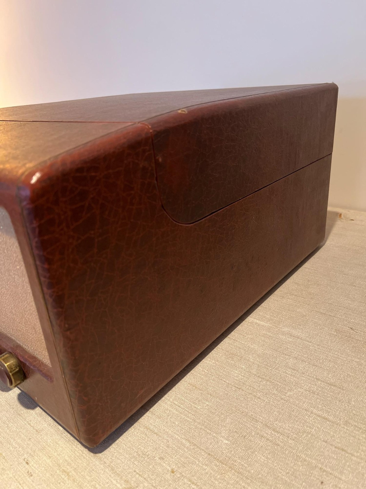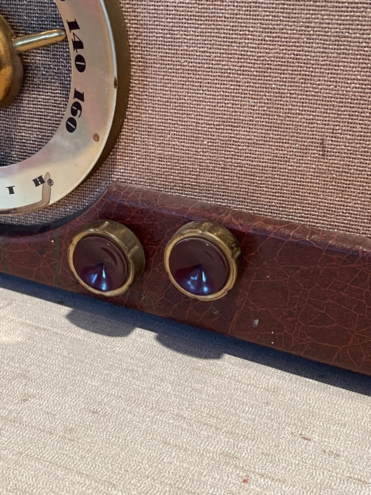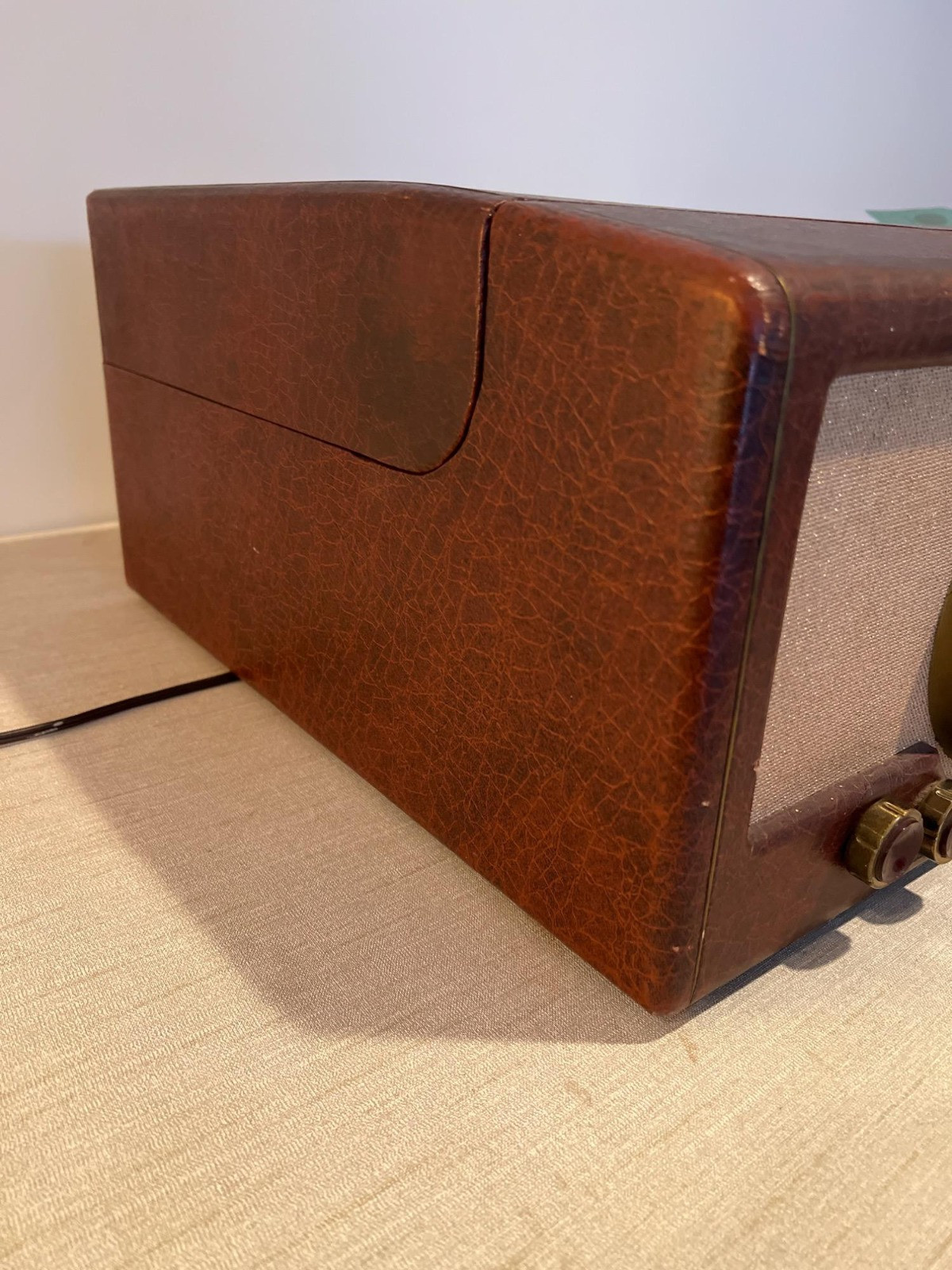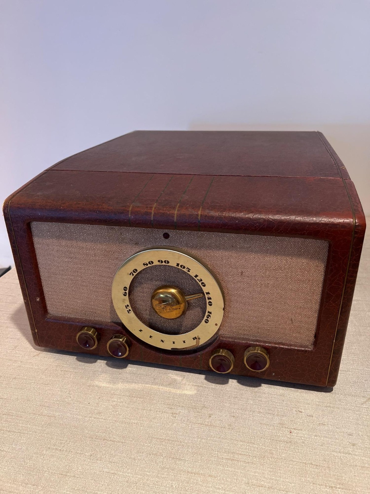 Antique model of Zenith electronic AM/FM radio and loop antenna. Radio functions. Phonograph spins. Otherwise, no further testing. Click here for more information about Model H661R Ch= 6H01 - Zenith Radio Corp.; Chicago. S-17475