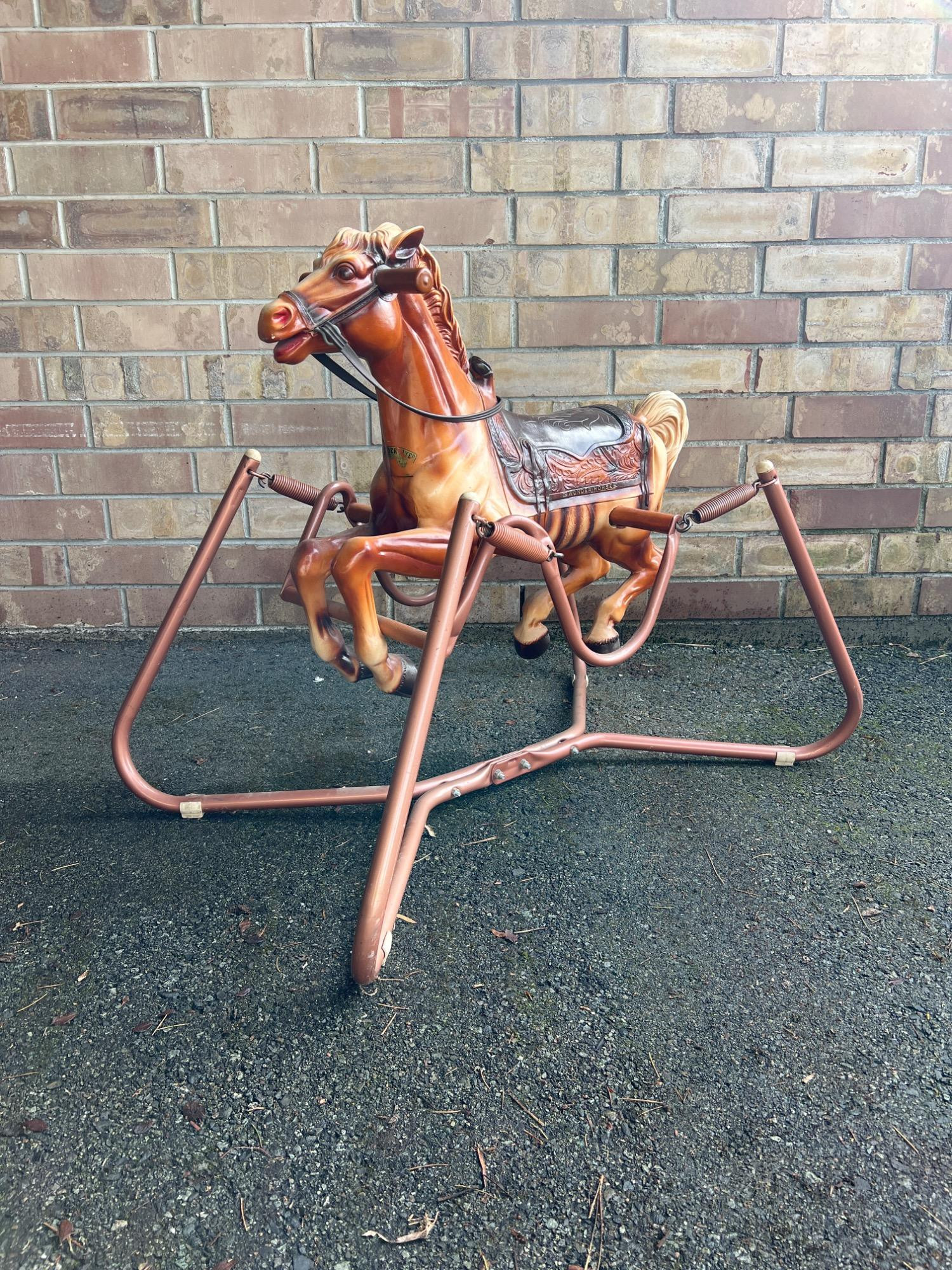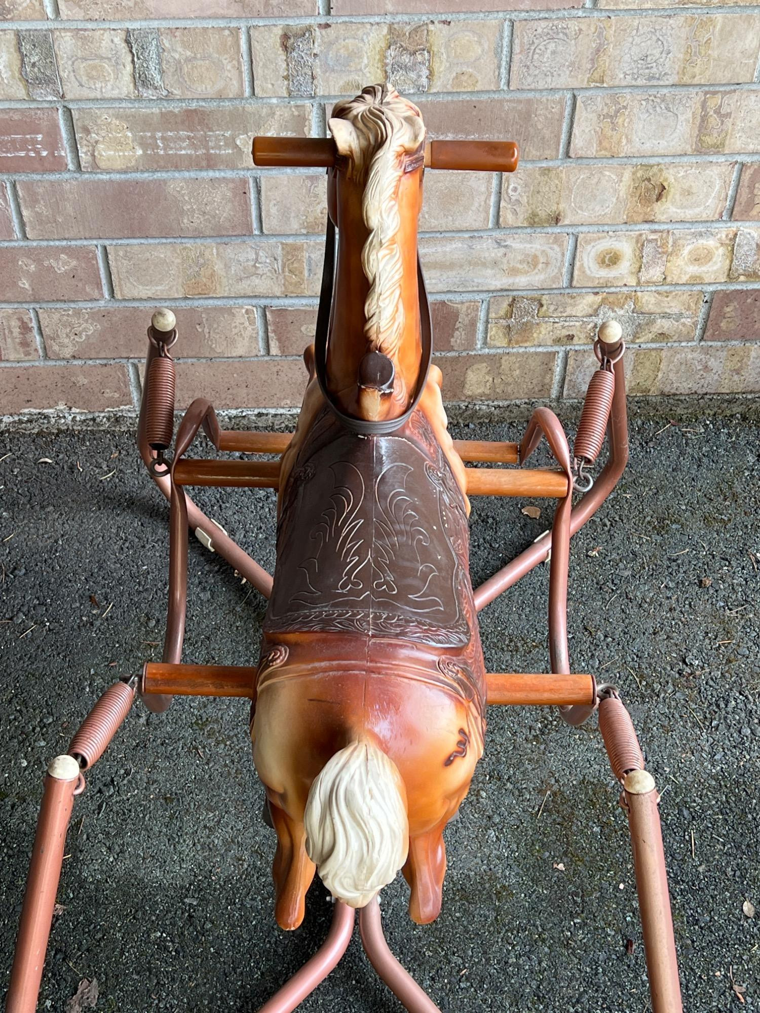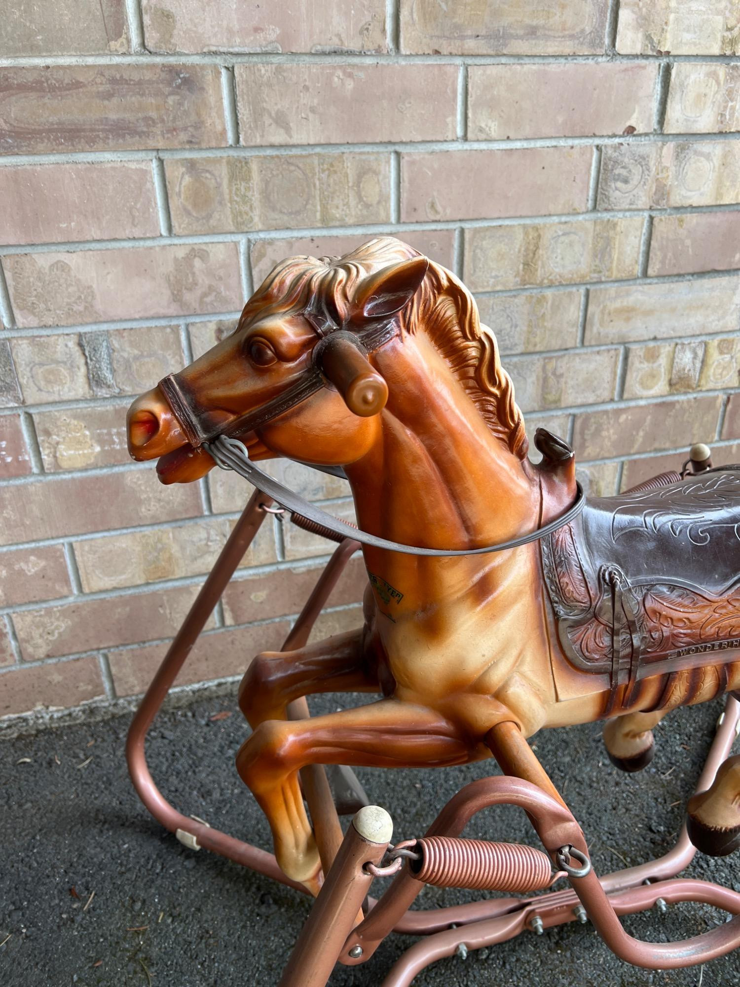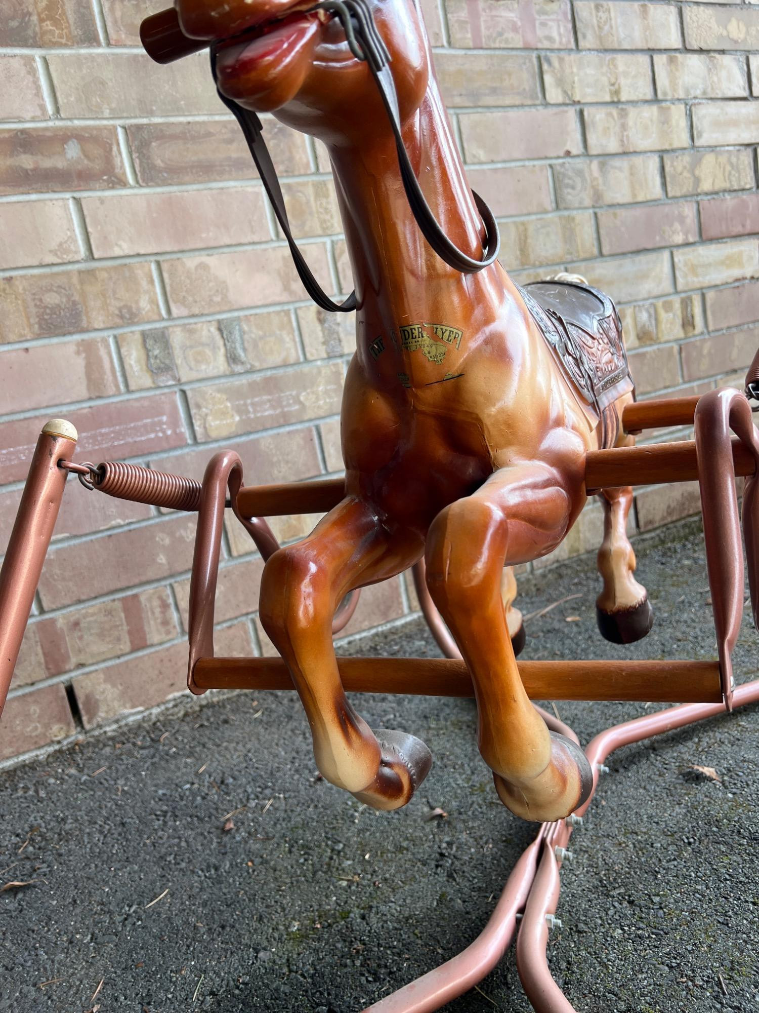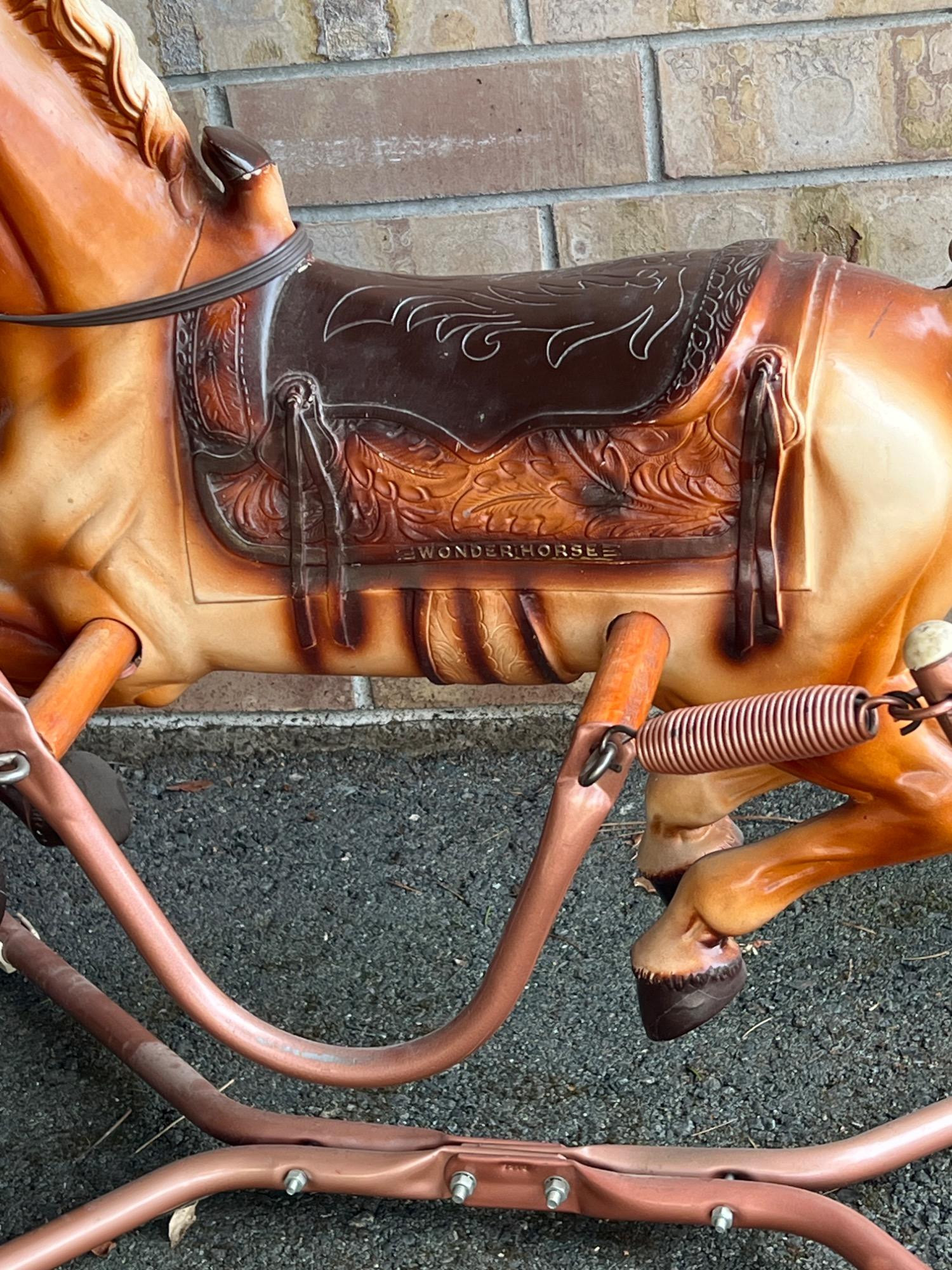 The Wonder Horse is a classic children's toy. It was invented in 1939 by William Baltz in Arkansas, originally crafted from packing crates and a wooden frame. The design evolved over the decades, with mass production beginning in the 1940s. By the 1950s, the Wonder Horse became a household favorite, featuring coiled springs for a realistic rocking motion. The rubber handle sleeves are still intact (no splits or tears). This model was produced in the 1950s or early 1960s. (Later models included textured fur, detailed facial expressions, and even sound mechanisms to mimic horse neighs and galloping hooves.)