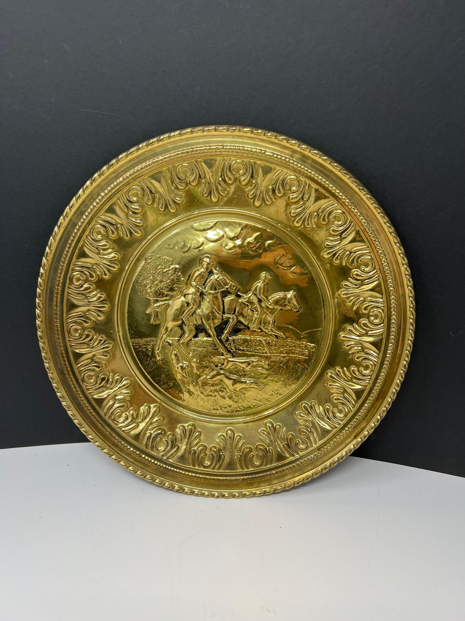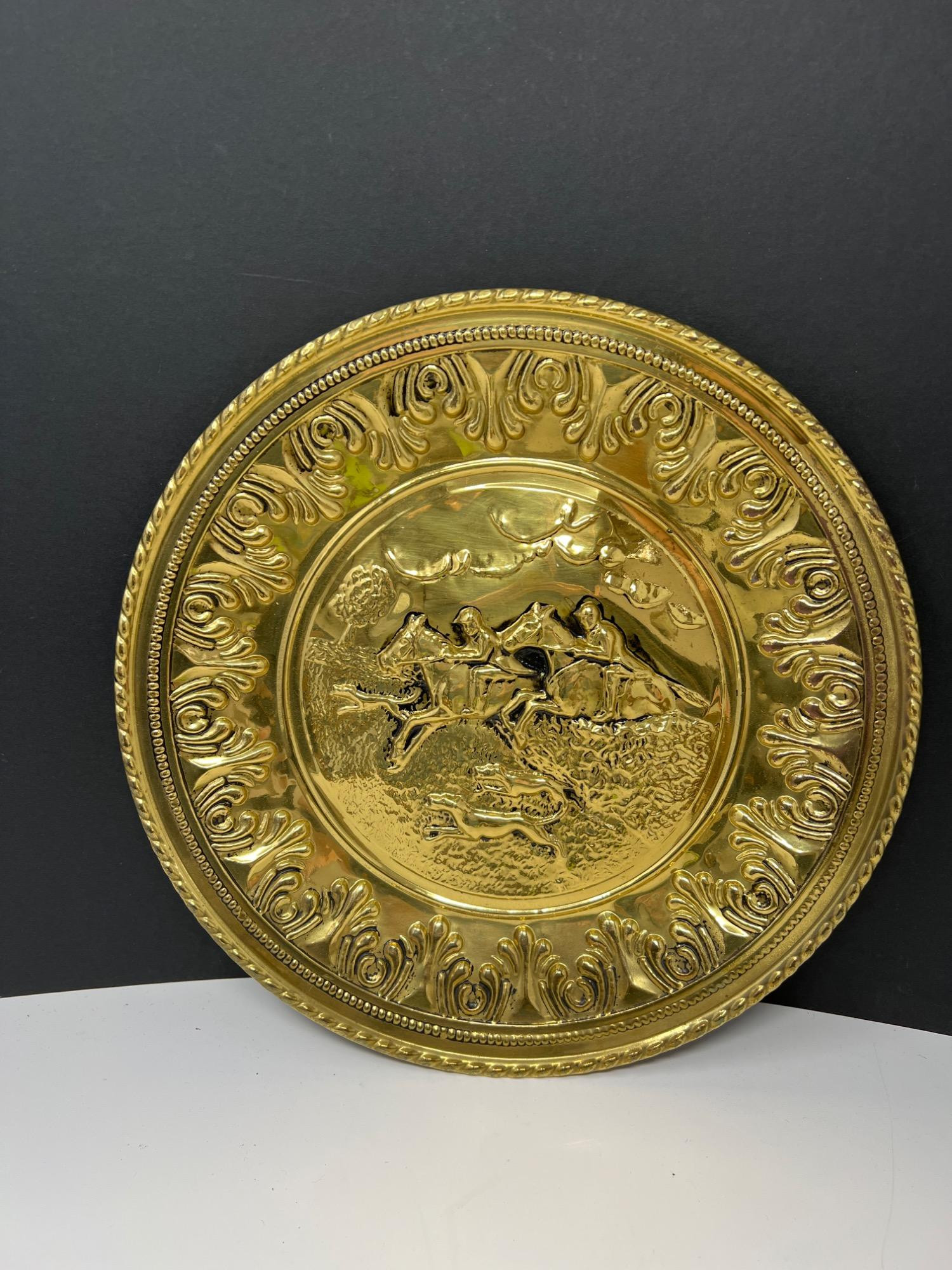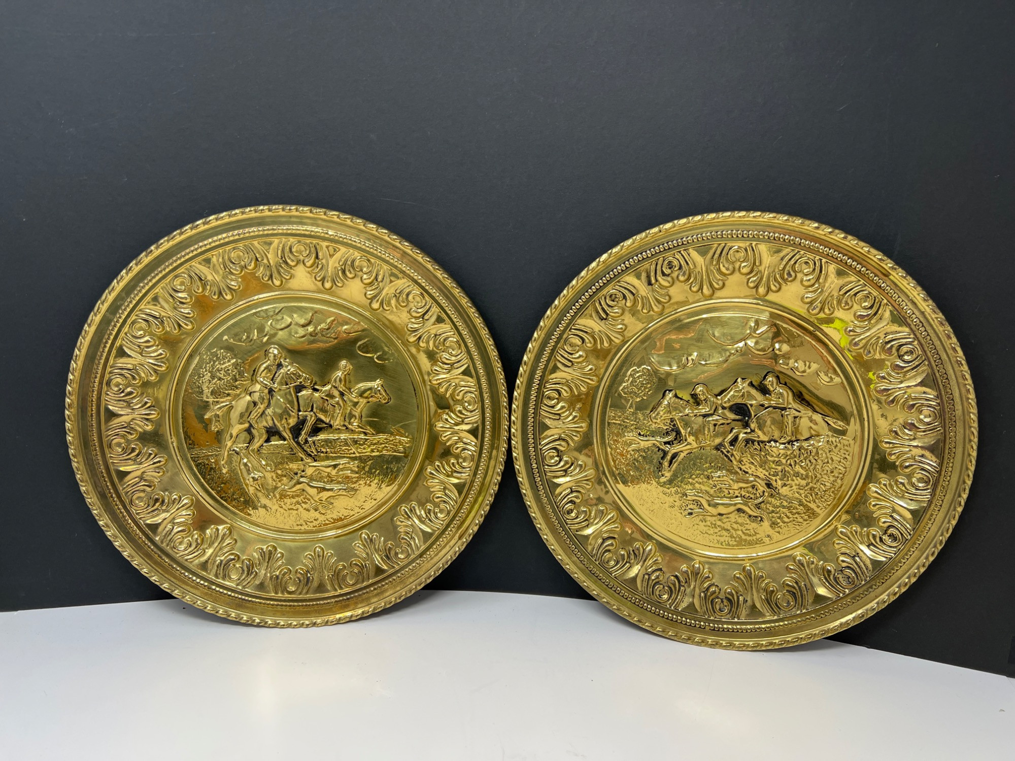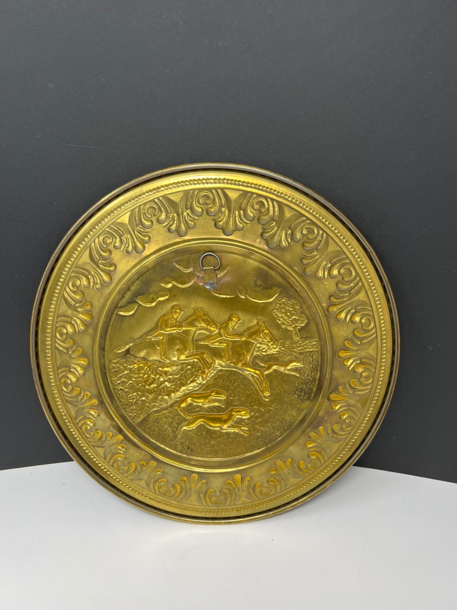 These vintage brass plates are embossed with fox hunting scenes, showcasing intricate craftsmanship. Made in England, these plates are a fine example of traditional decorative art. Their embossed design adds texture and depth, making them visually striking and perfect for wall display. Measuring 12 inches in diameter, they are a charming addition to any vintage or rustic-themed décor.