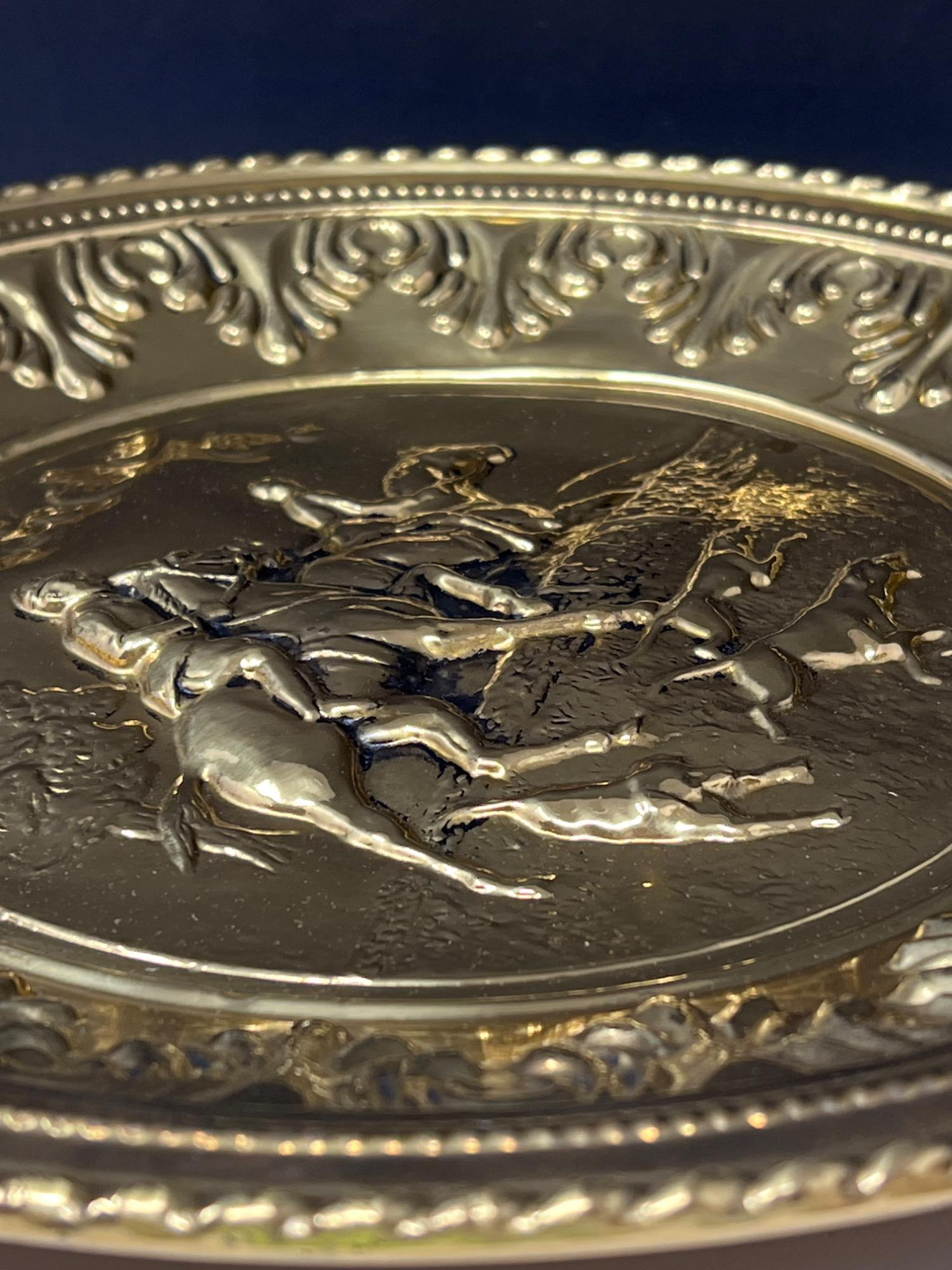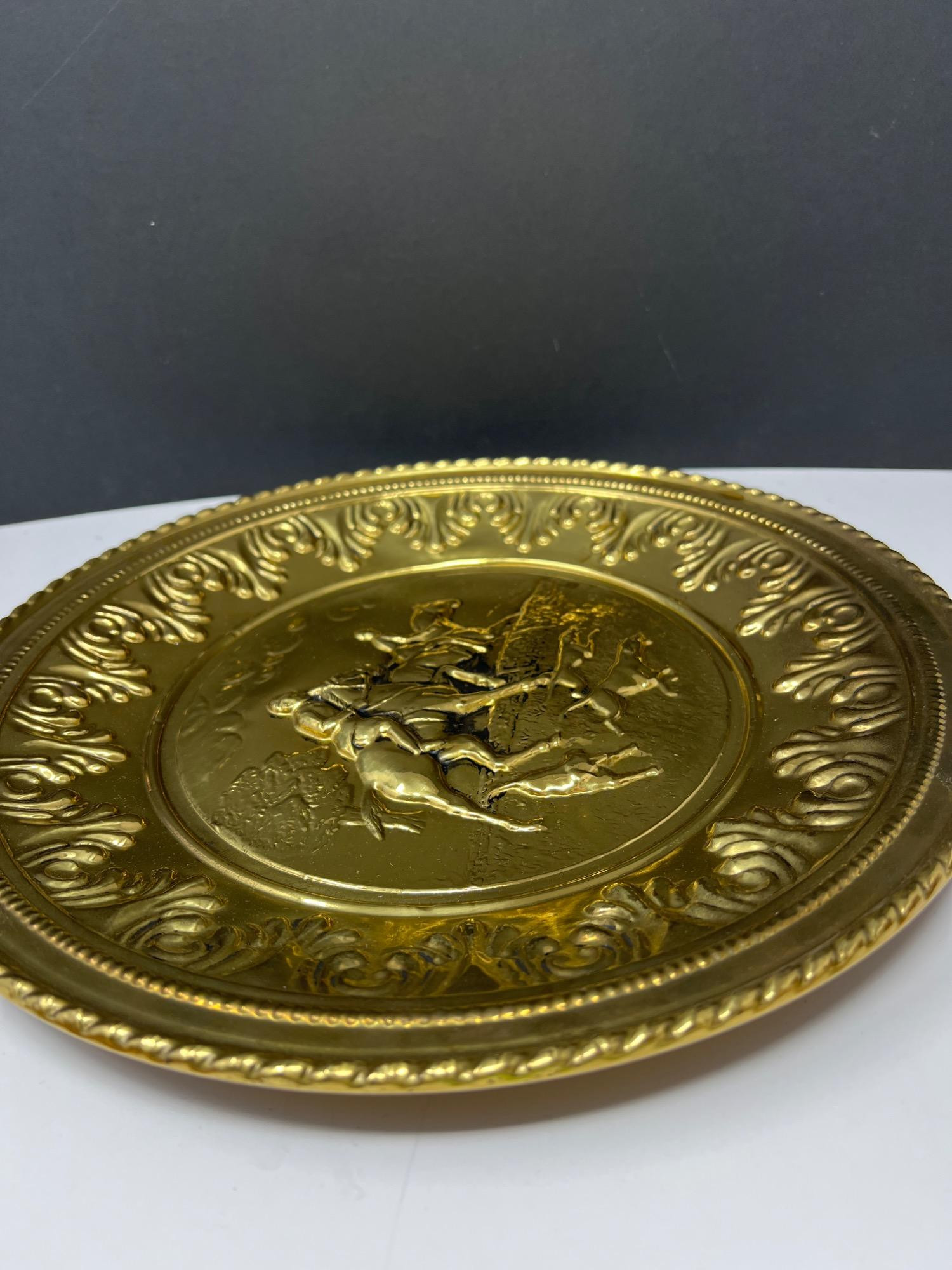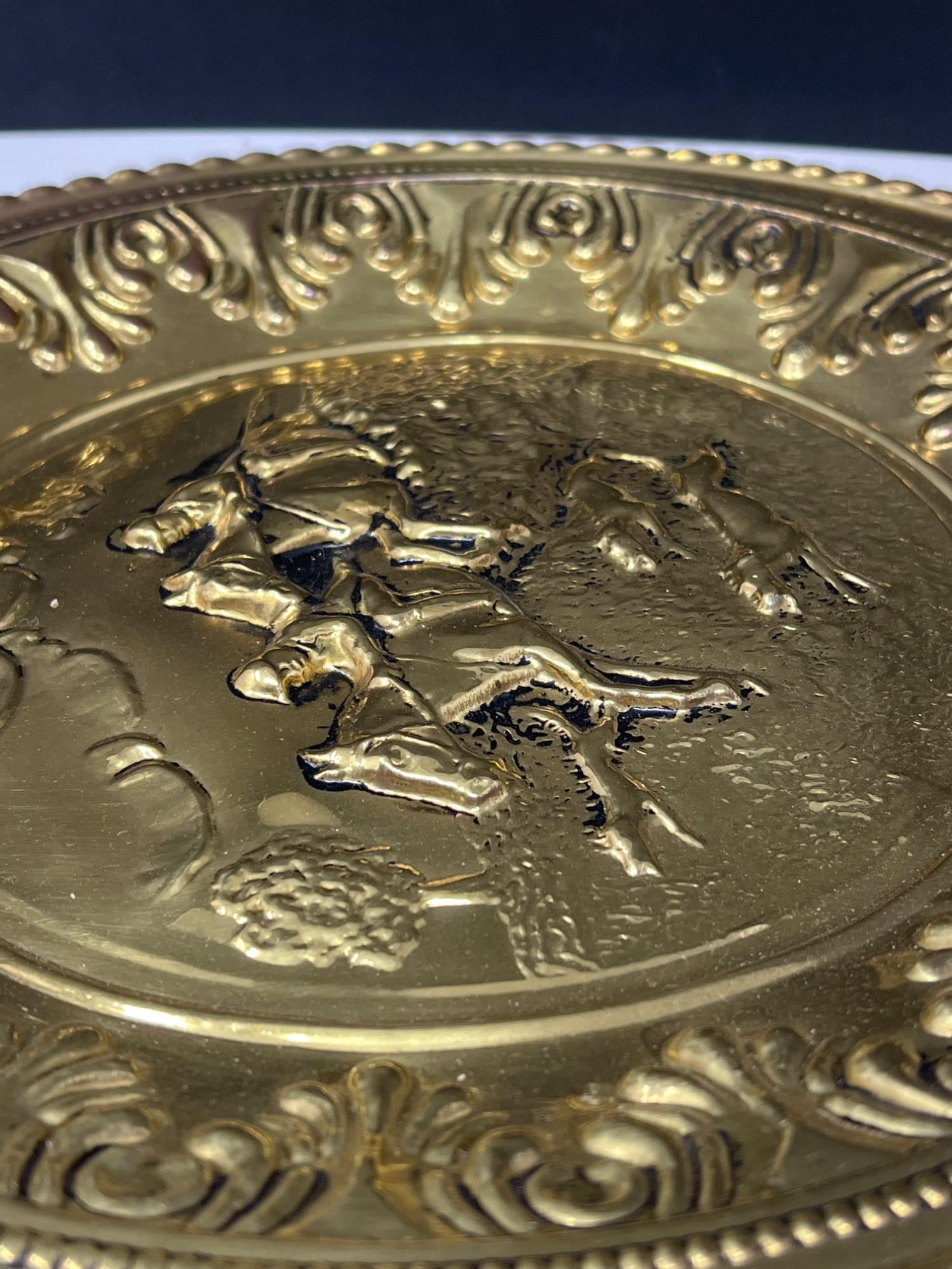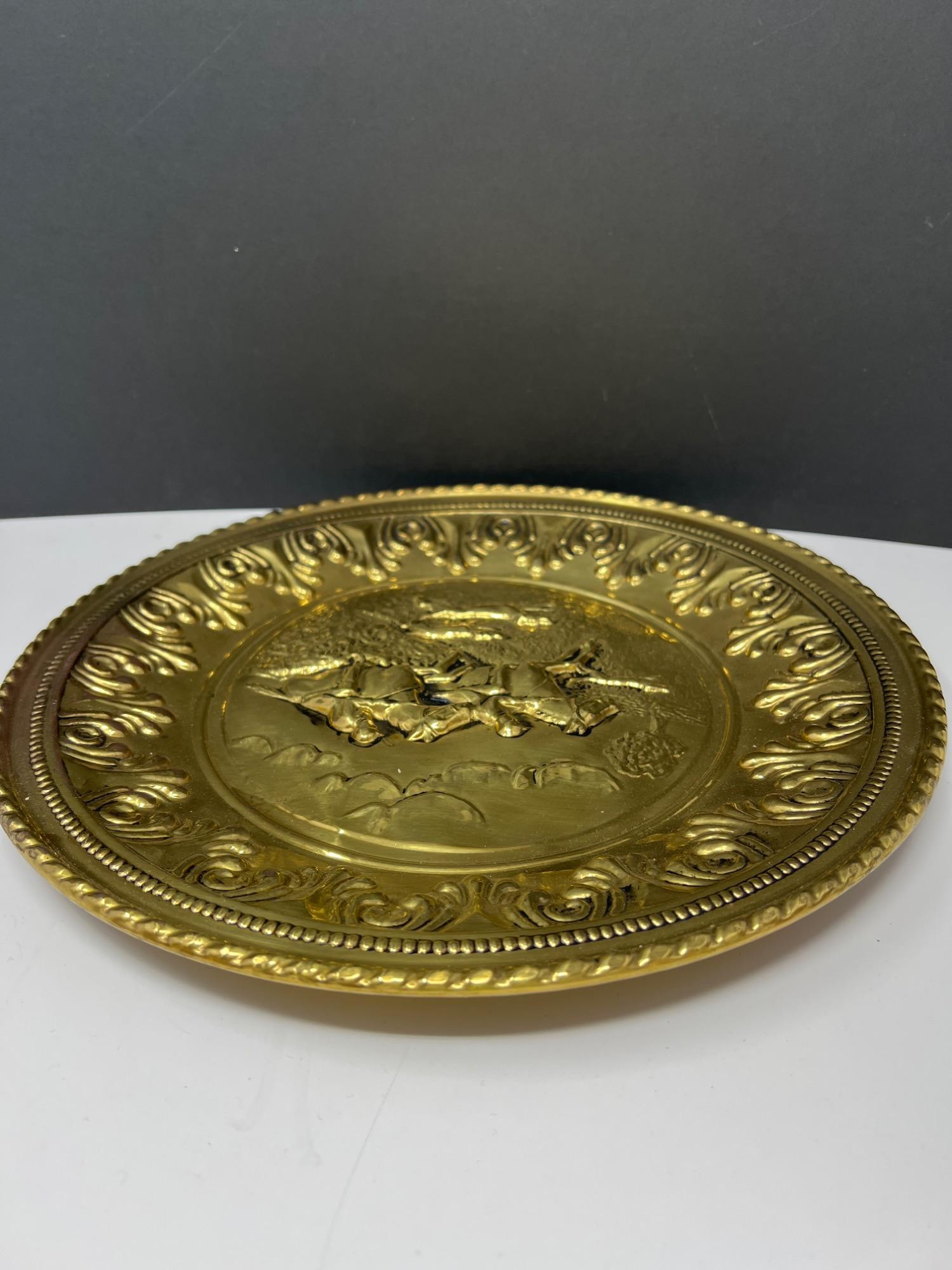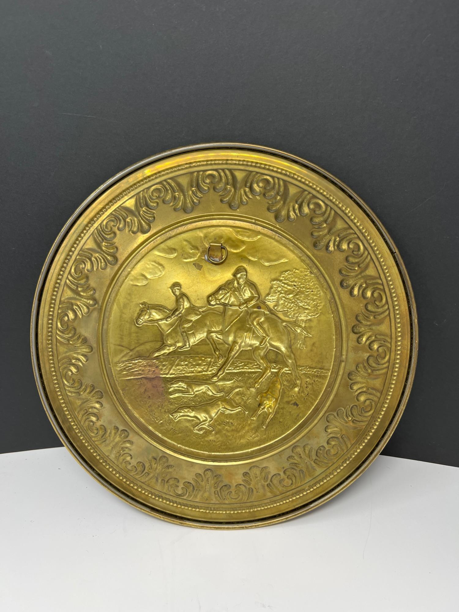 These vintage brass plates are embossed with fox hunting scenes, showcasing intricate craftsmanship. Made in England, these plates are a fine example of traditional decorative art. Their embossed design adds texture and depth, making them visually striking and perfect for wall display. Measuring 12 inches in diameter, they are a charming addition to any vintage or rustic-themed décor.