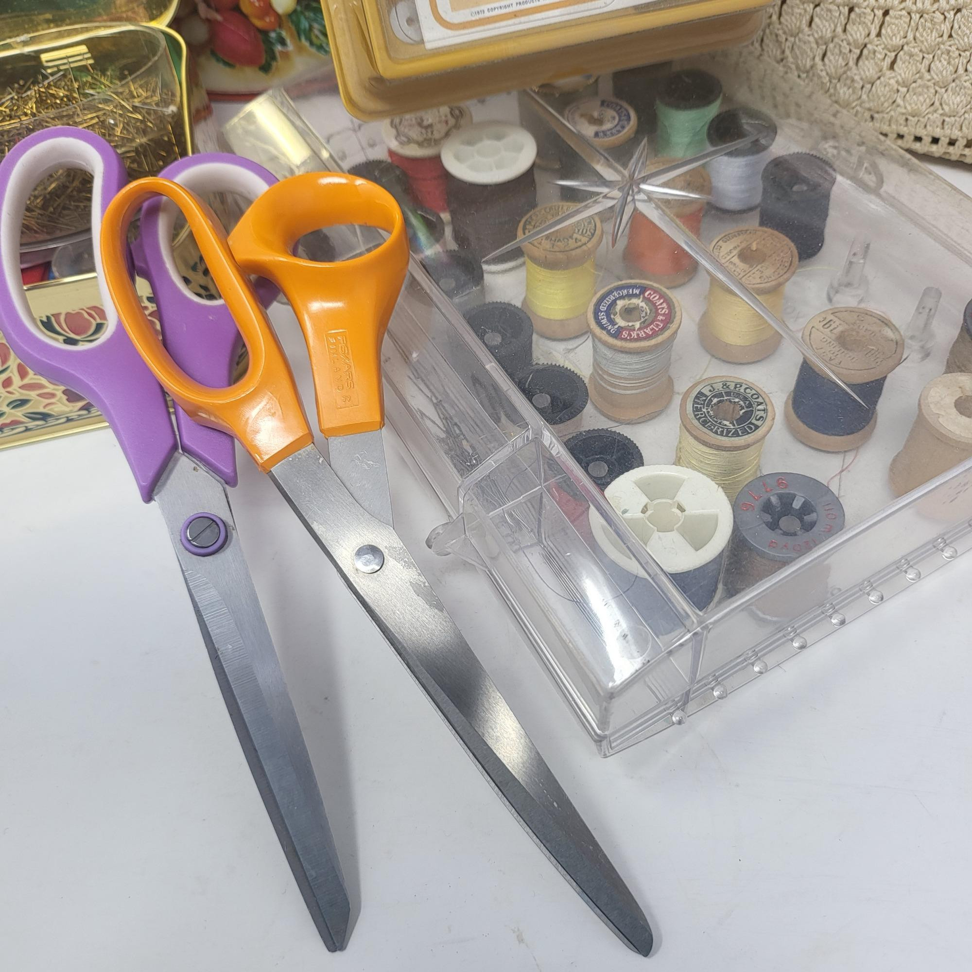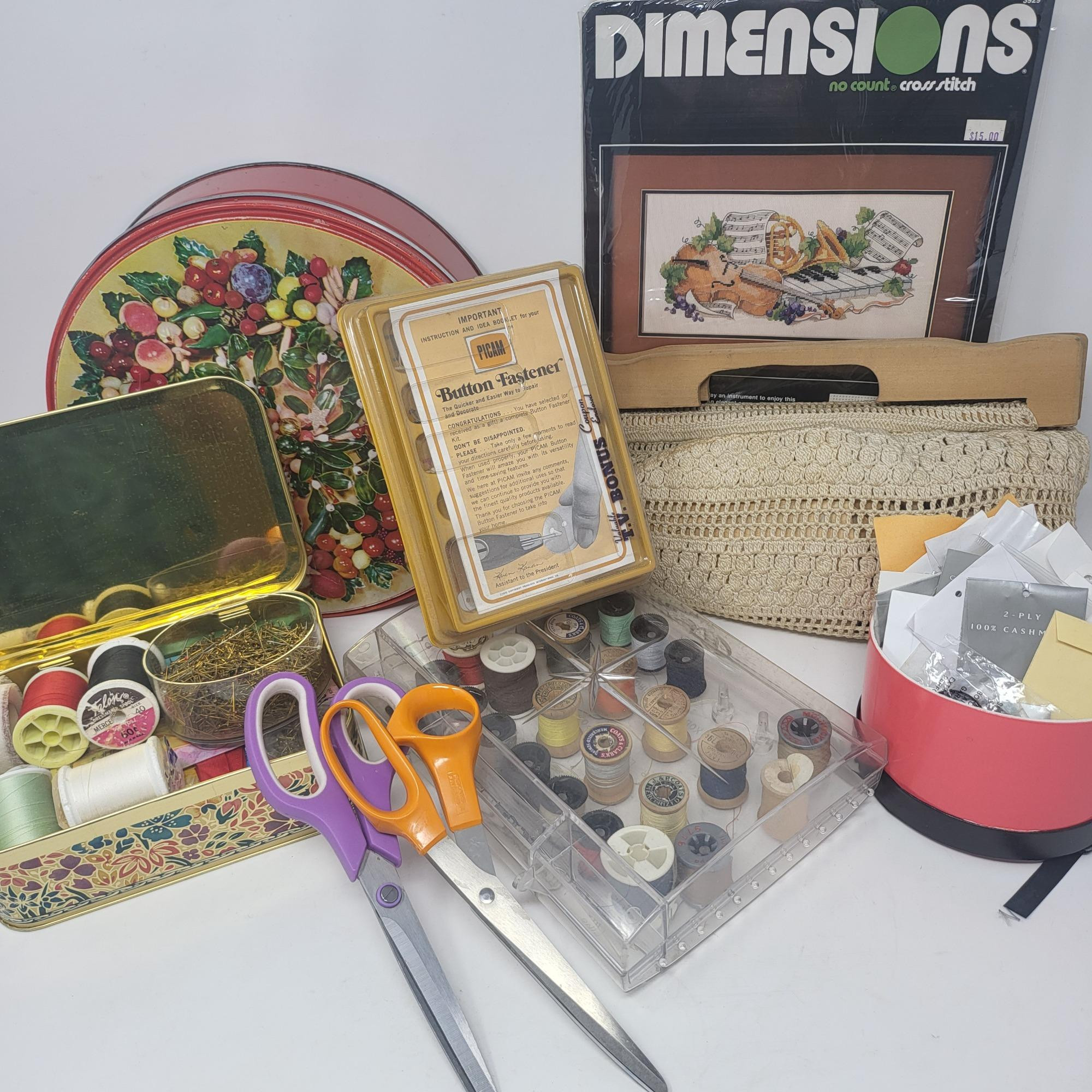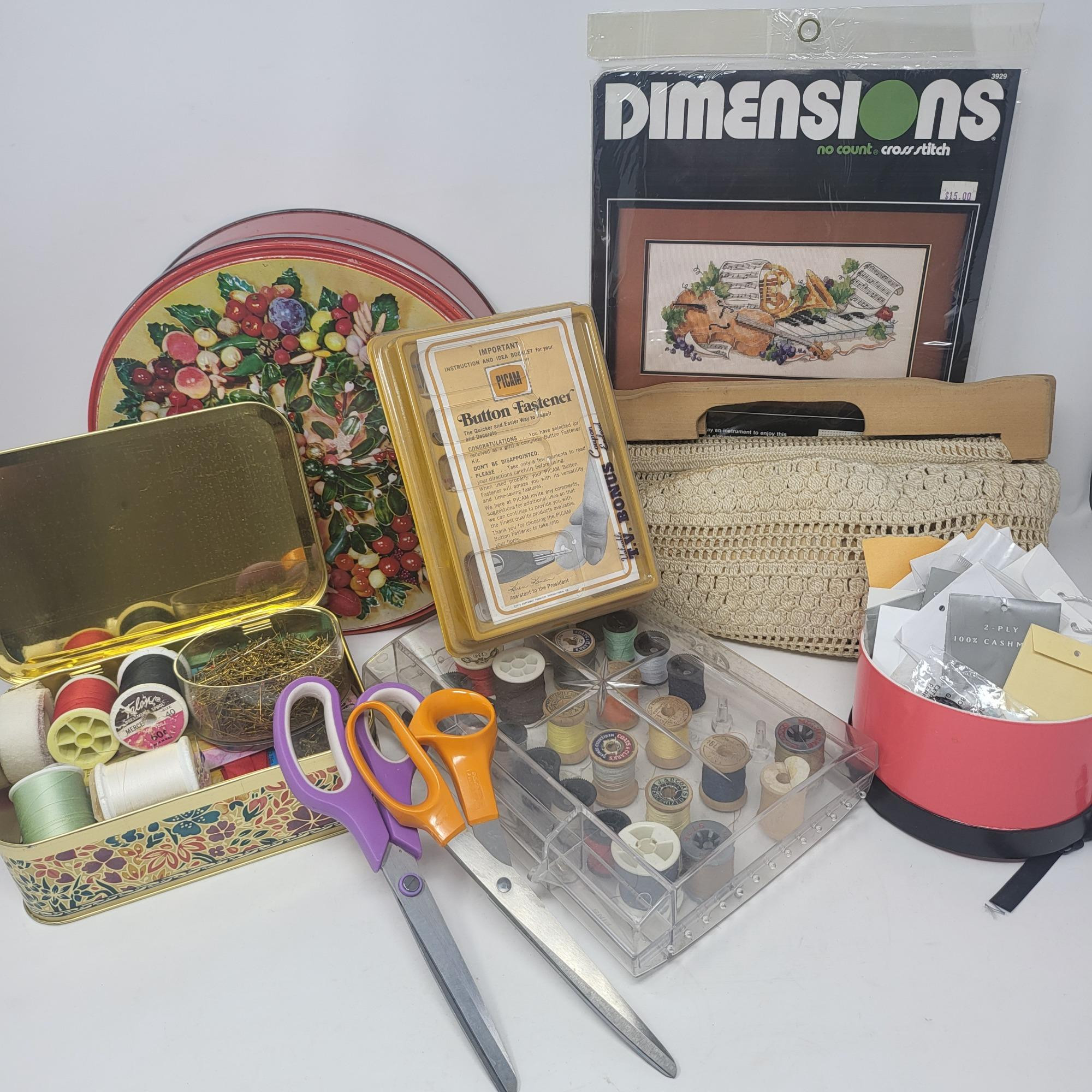 Large tin and round box of buttons, threads and a sewing caddy/purse with thread supplies. Spools of various colored thread. Button fastener, two pairs of scissors (one is Fiskar) anda cross stitch kit with music theme.