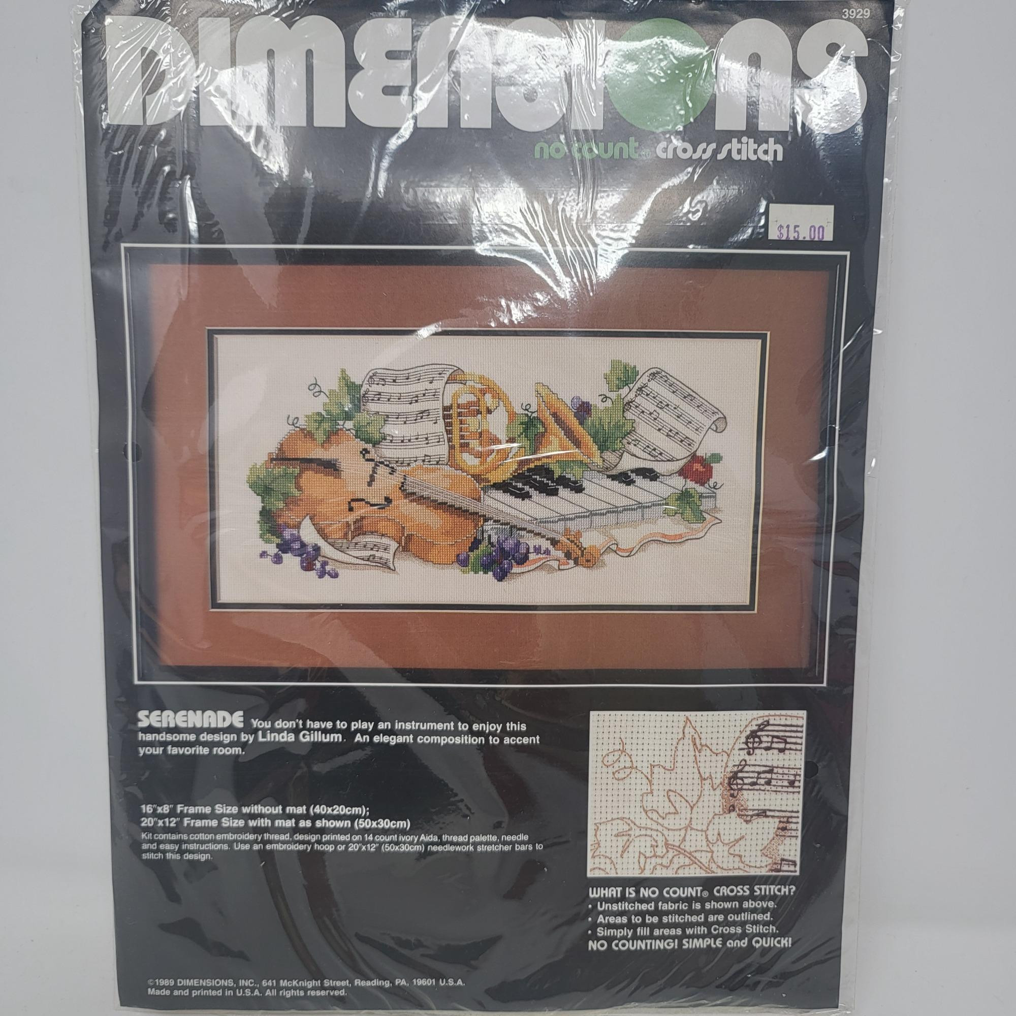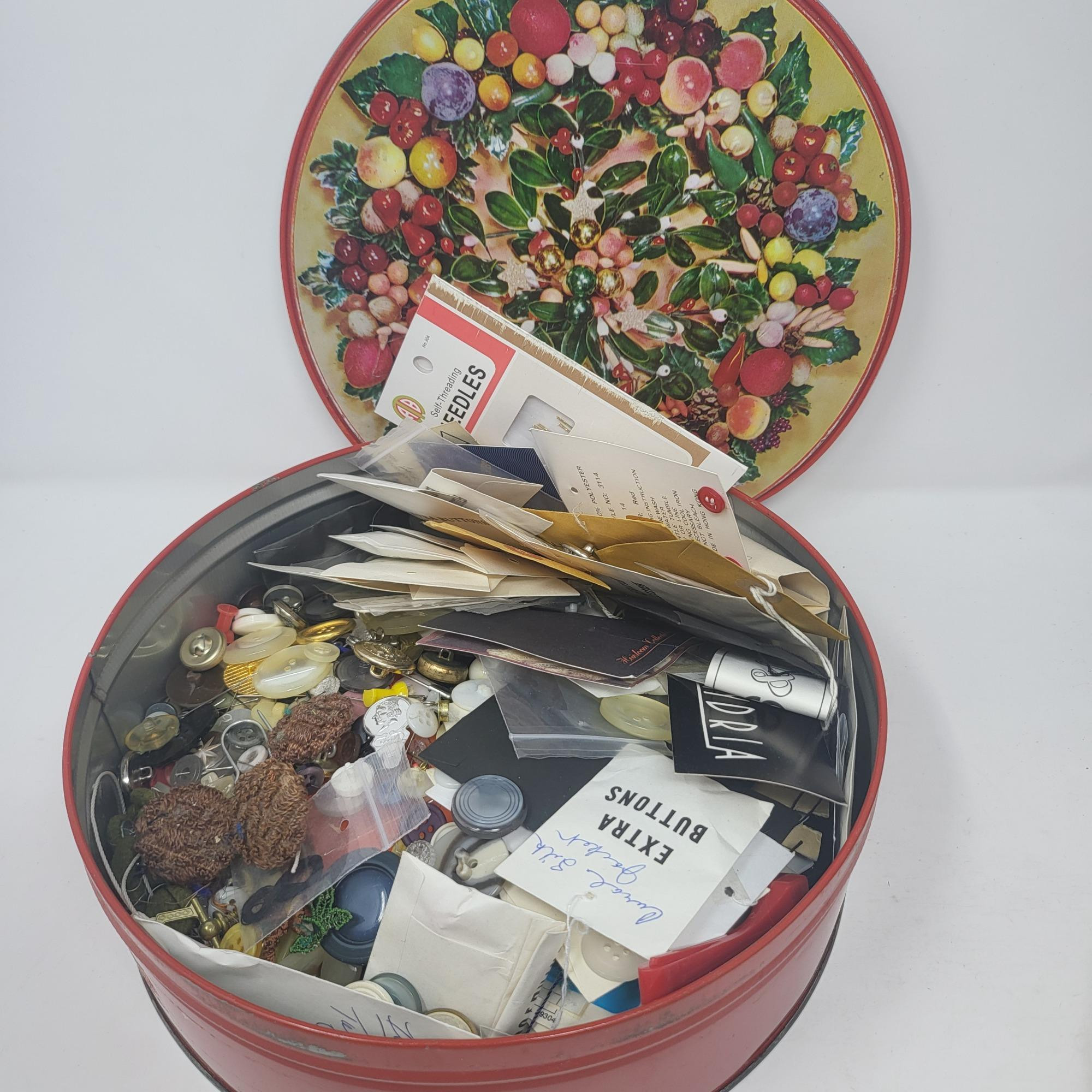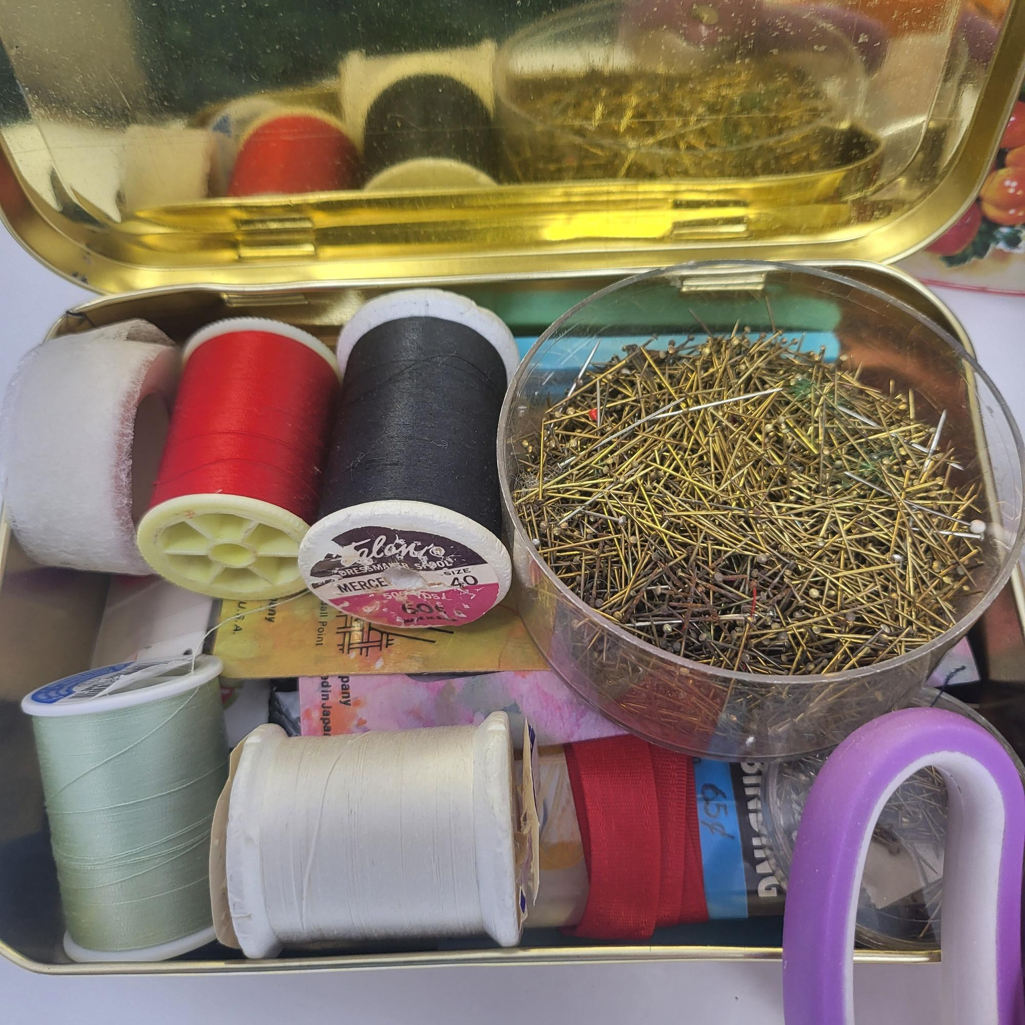 Large tin and round box of buttons, threads and a sewing caddy/purse with thread supplies. Spools of various colored thread. Button fastener, two pairs of scissors (one is Fiskar) anda cross stitch kit with music theme.