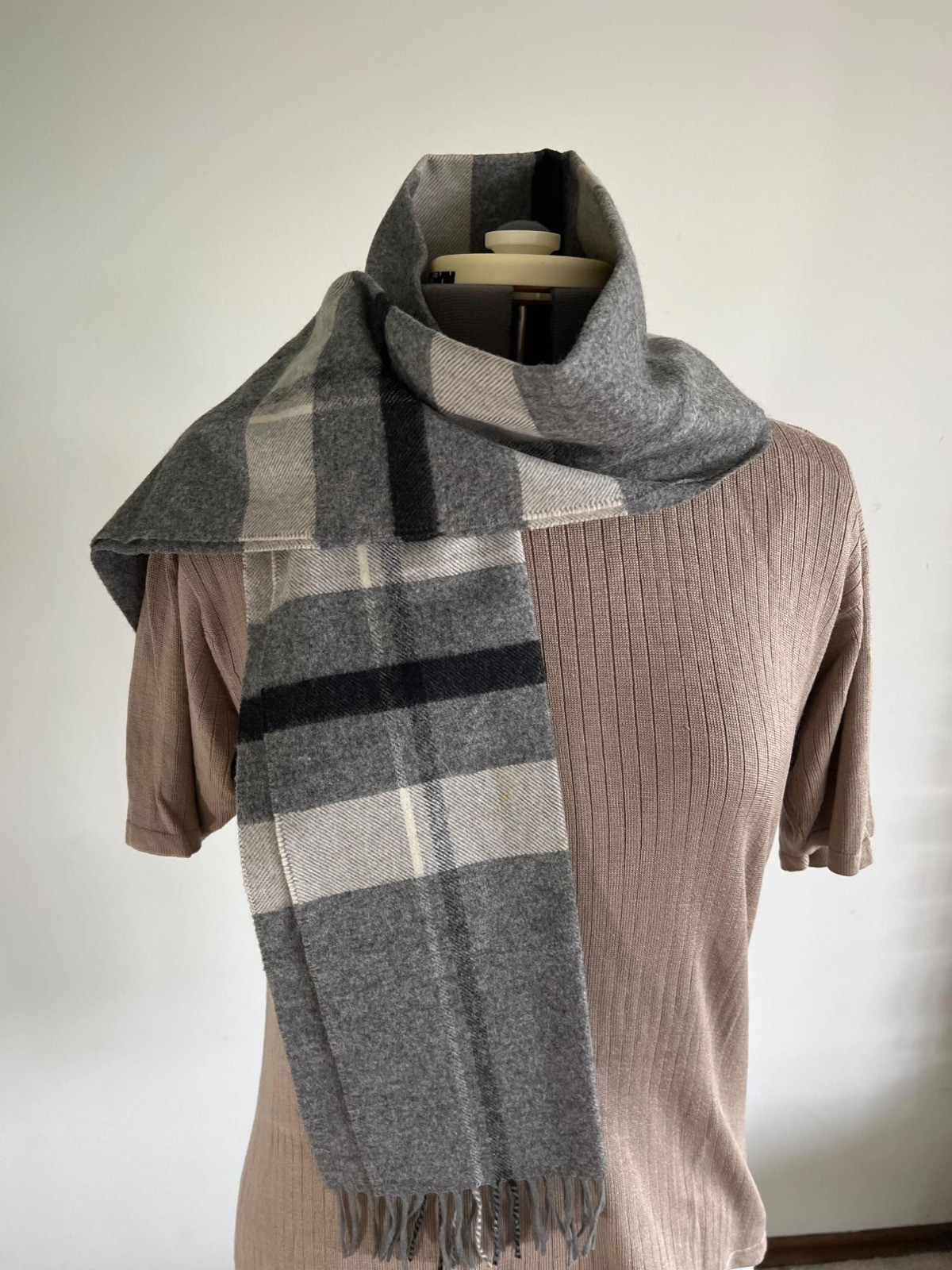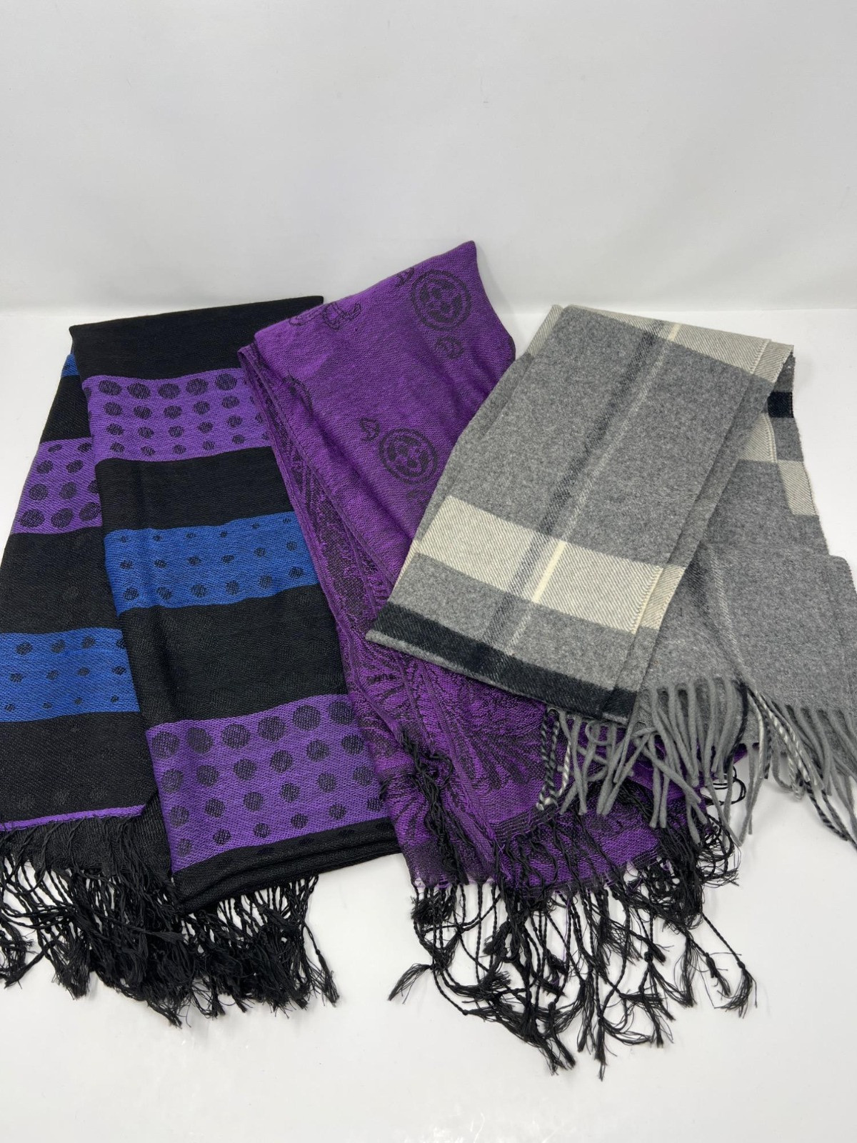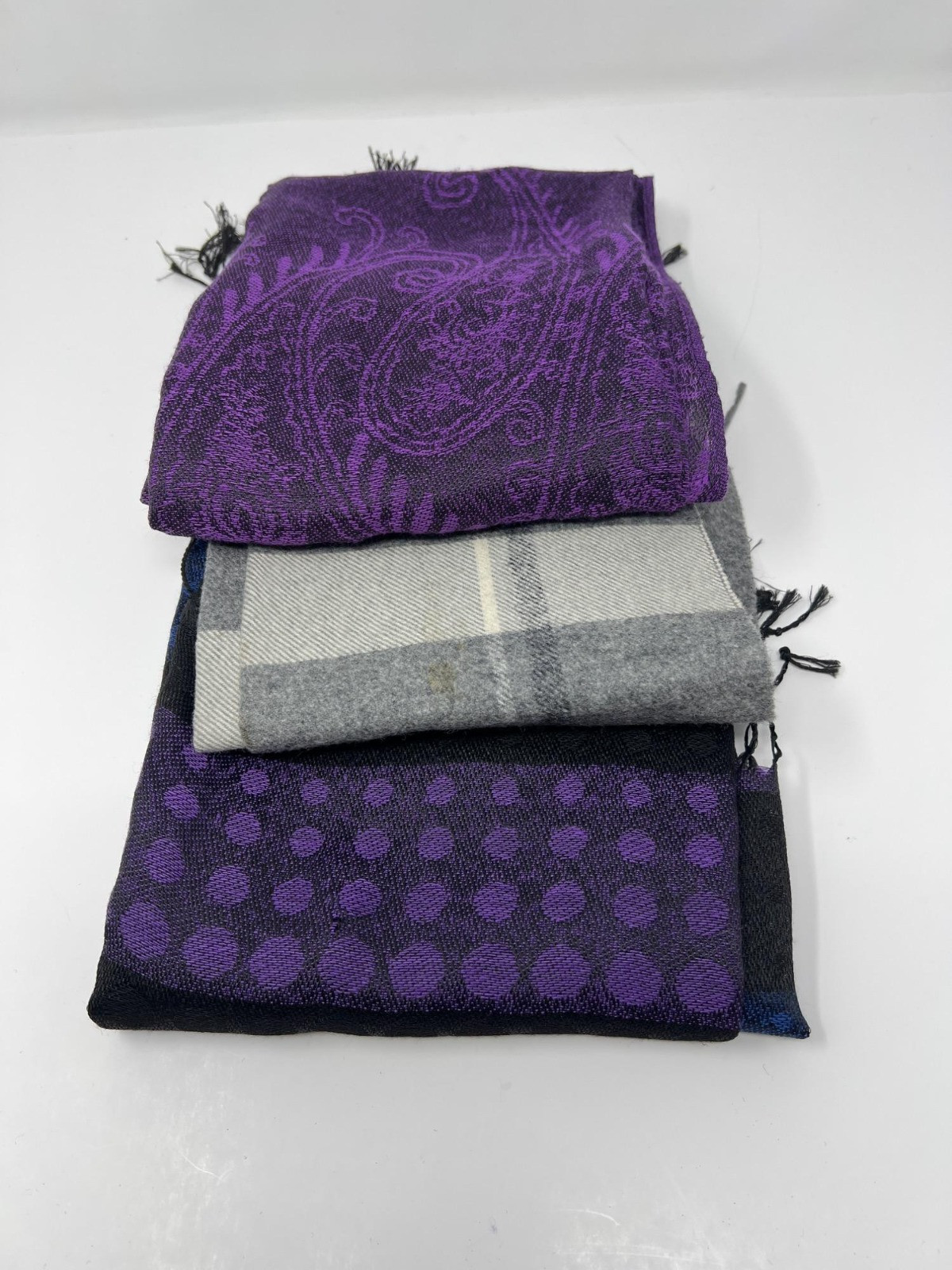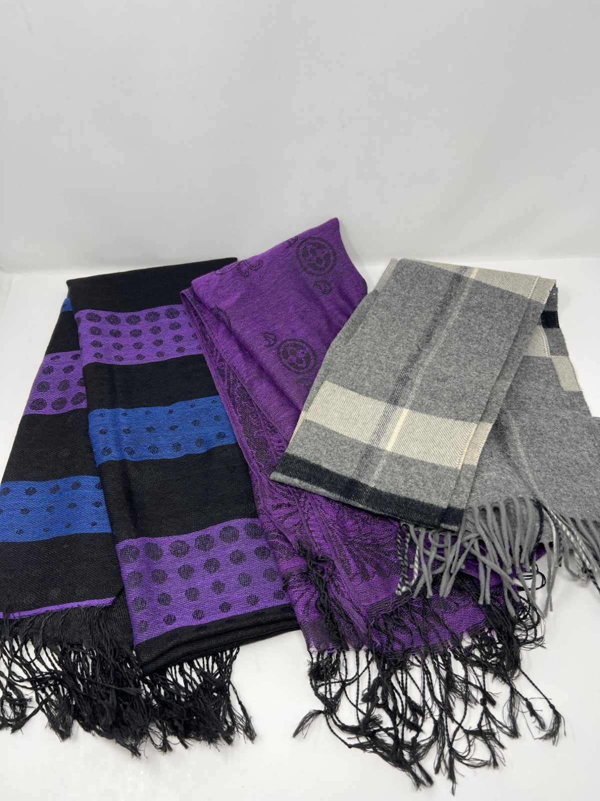 Grey and white 100% wool neck scarf with fringe. Two more scarfs that are Pashmina style (potentially Pashmina) but no tags.