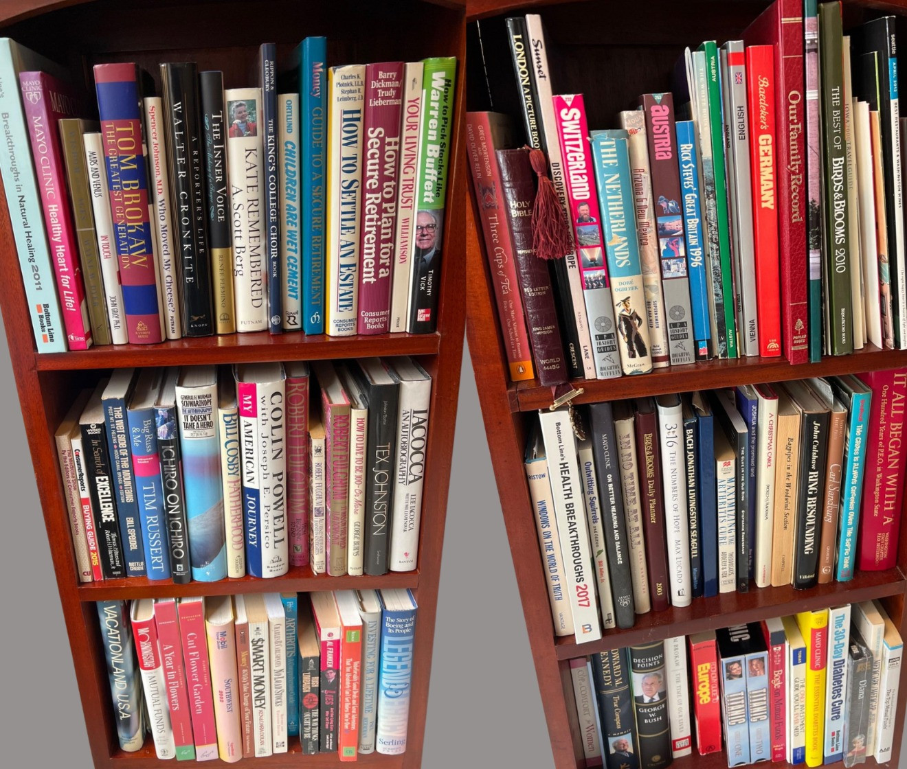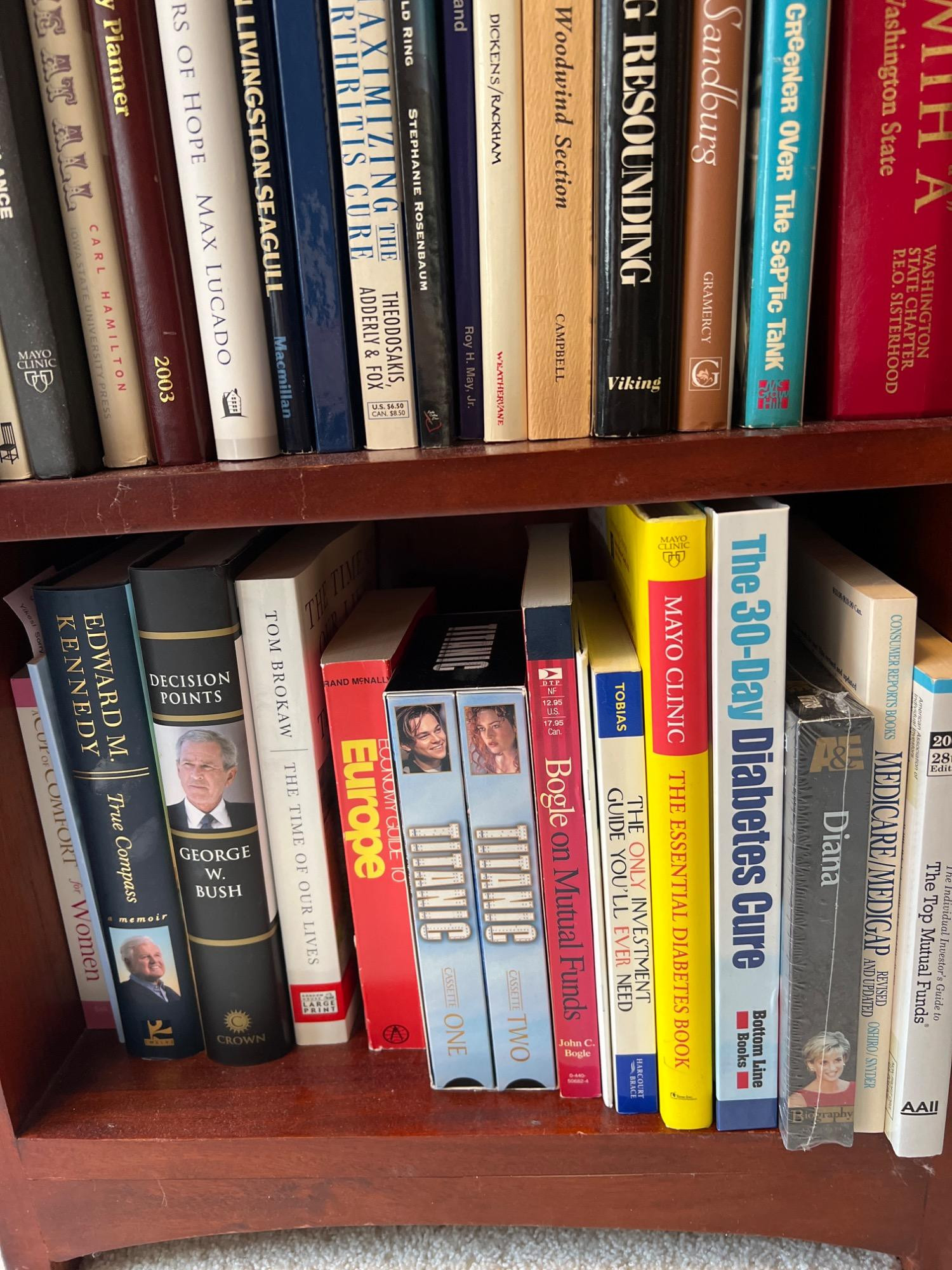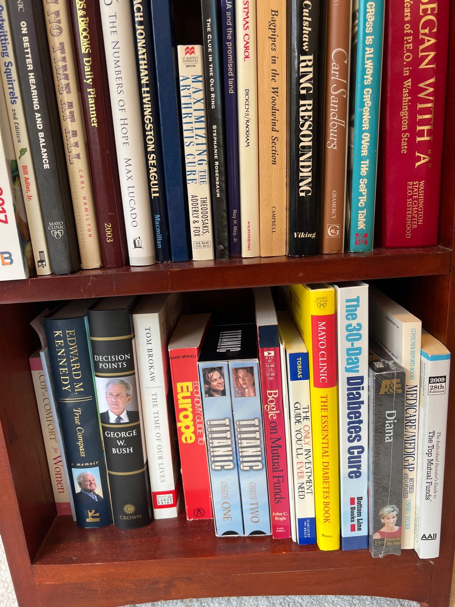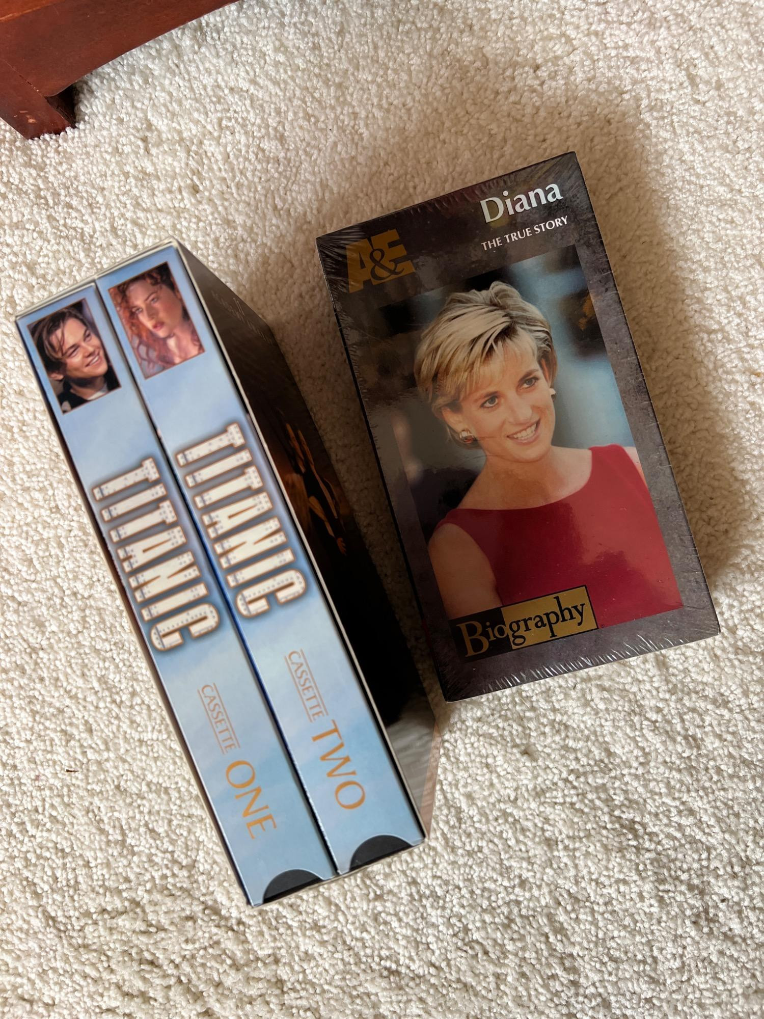 Over 100 book titles of various genres. Also includes VHS of Titanic movie and a sealed copy of the VHS about Princess Diana. Does not include bookshelves.