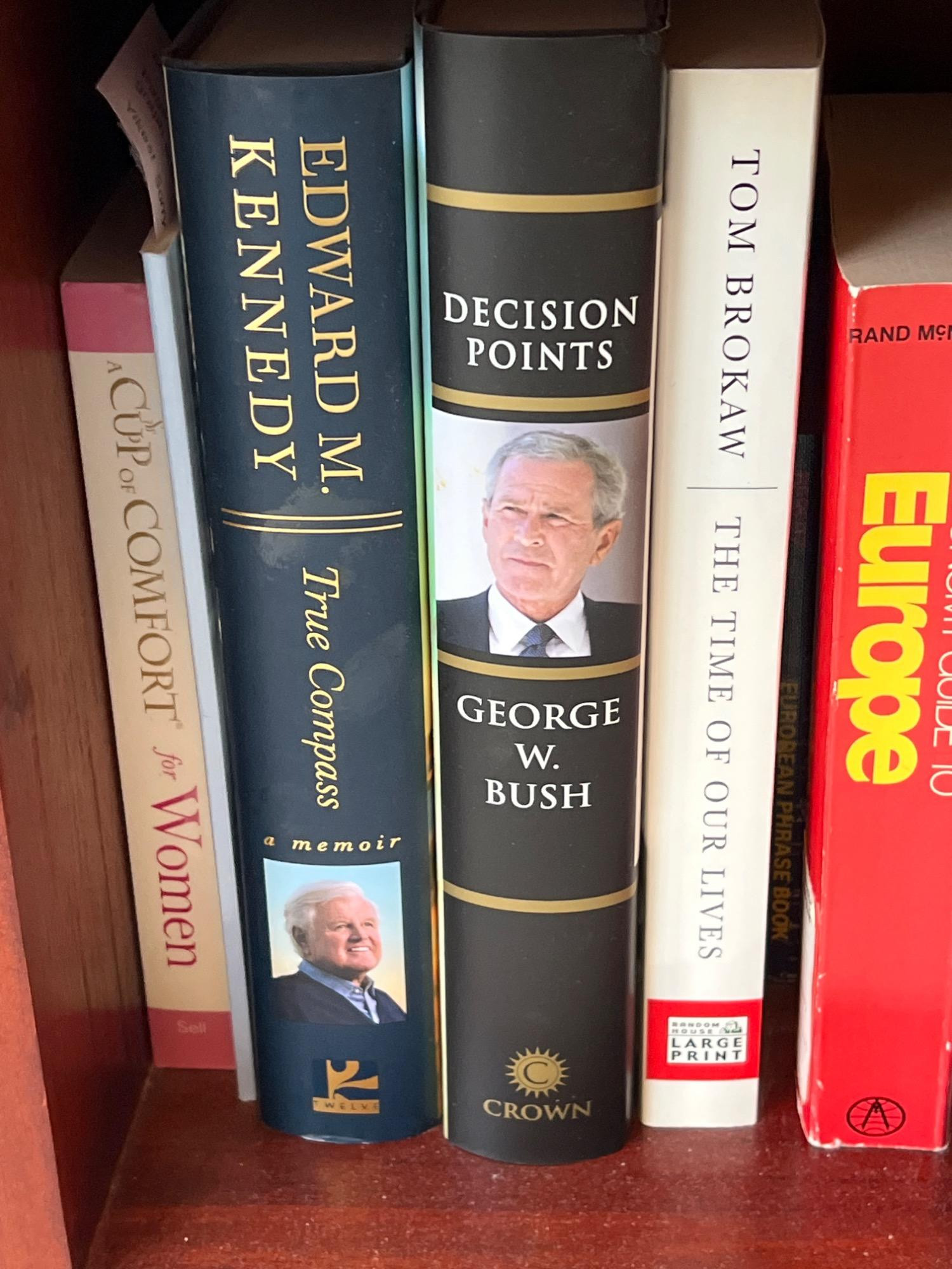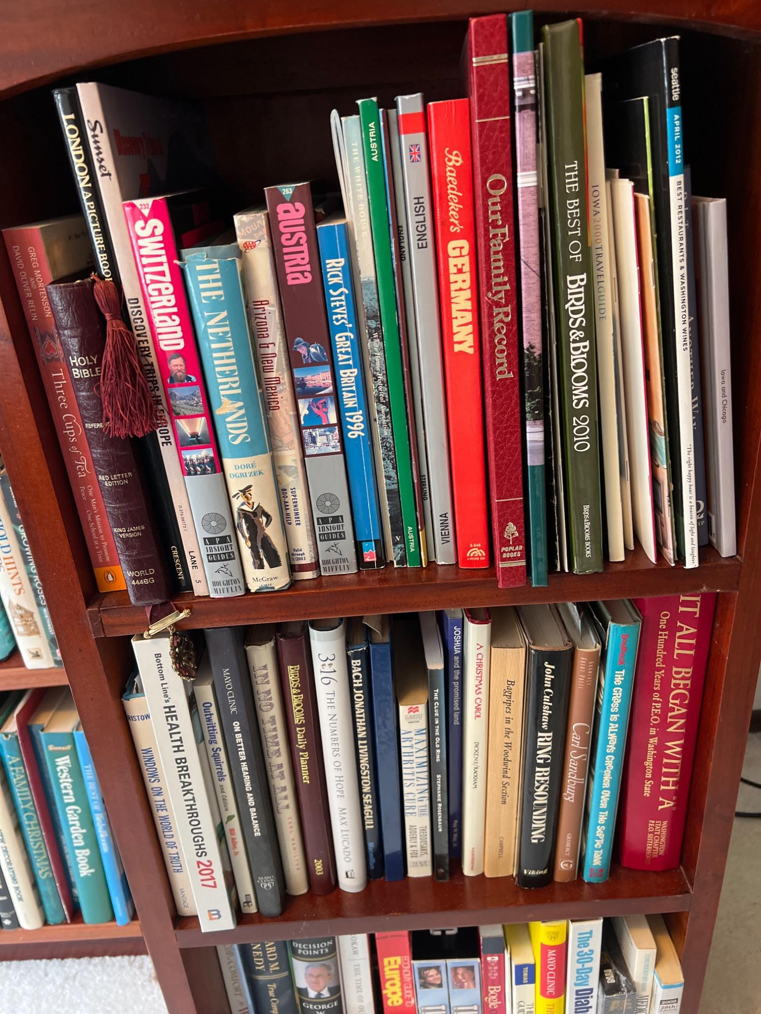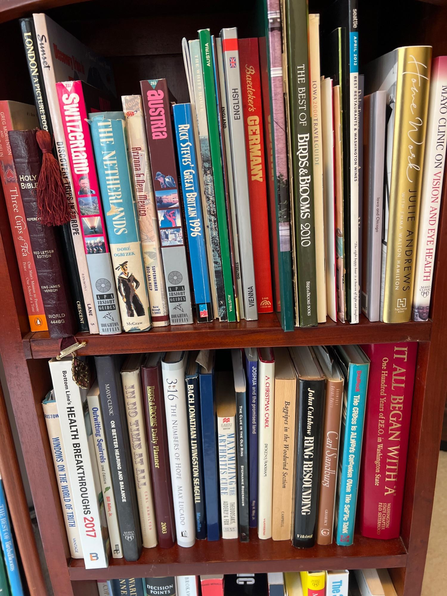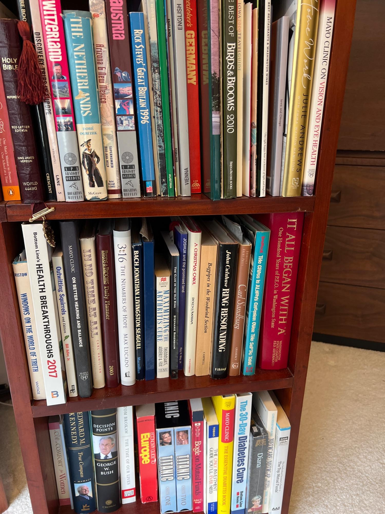Over 100 book titles of various genres. Also includes VHS of Titanic movie and a sealed copy of the VHS about Princess Diana. Does not include bookshelves.