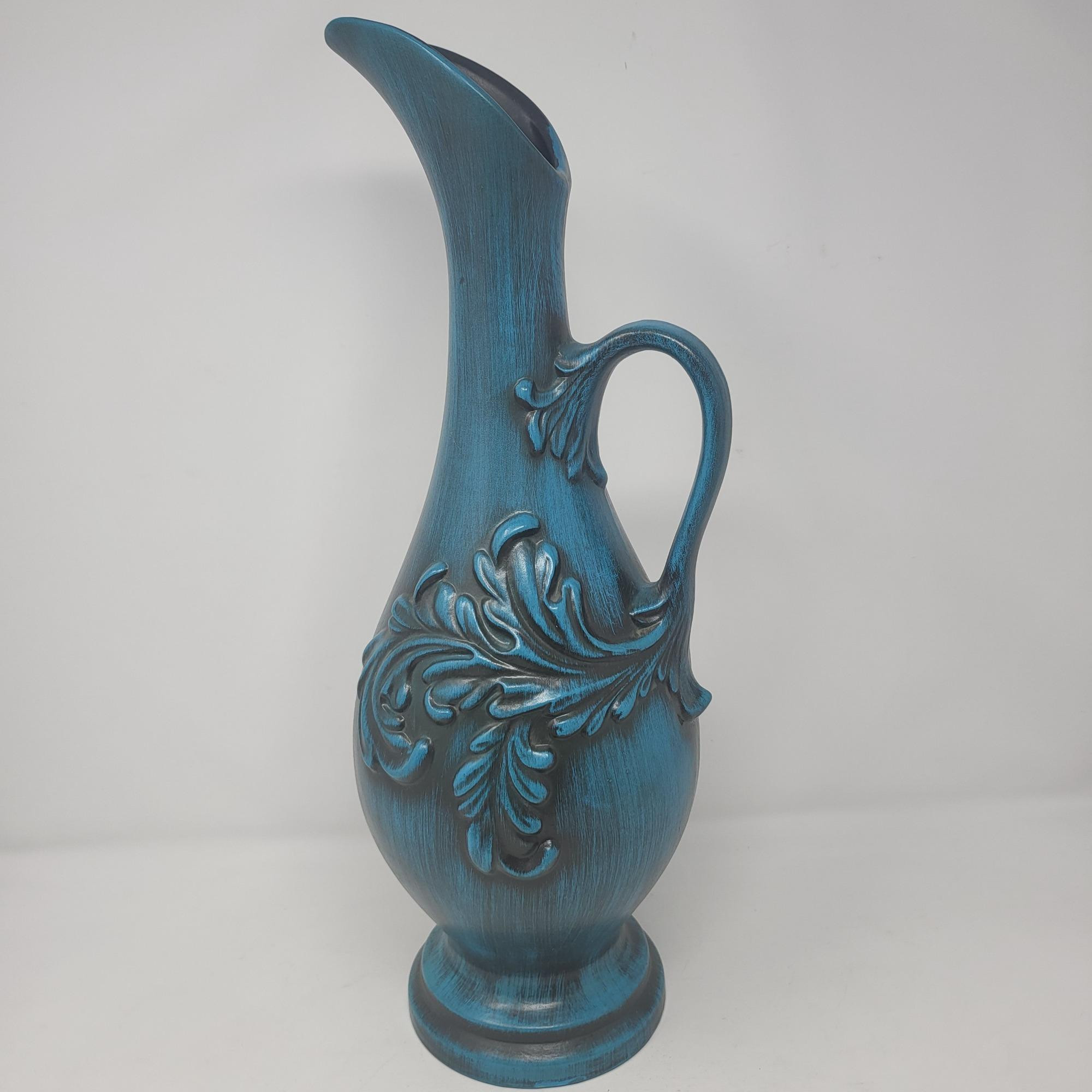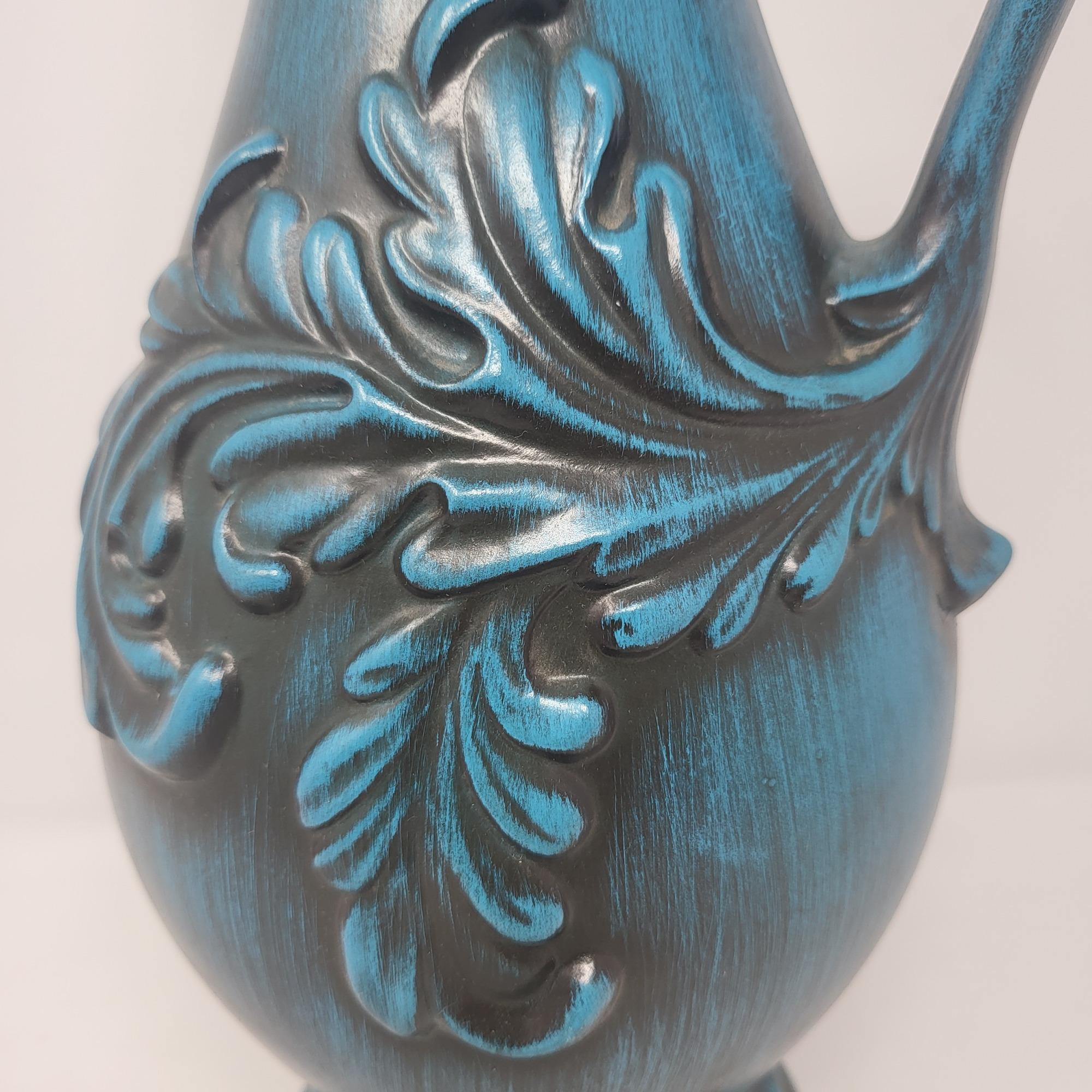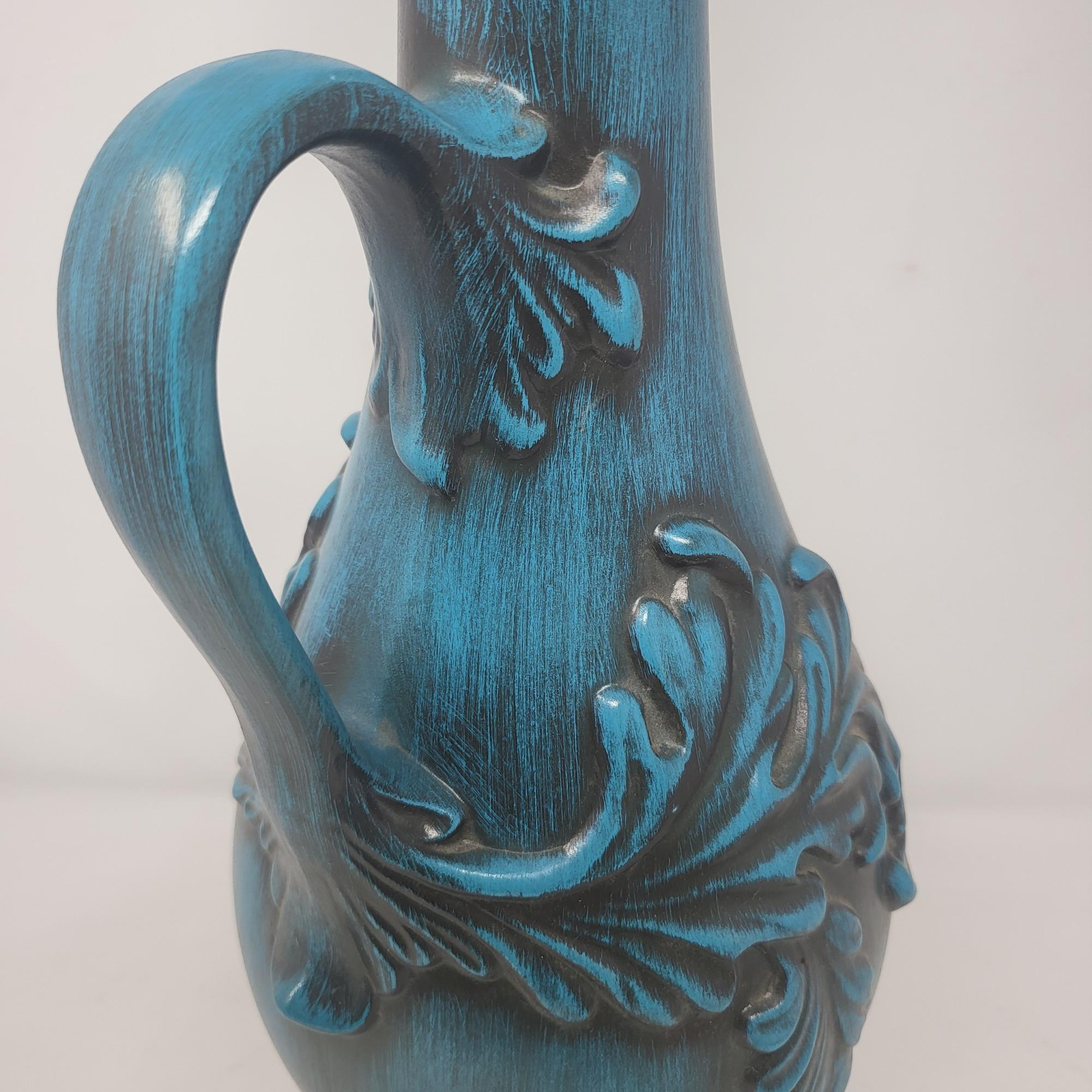 The Haeger vase features a teal and black brushed look with a raised leaf motif. It has a handle that accents the decorative and functional potential of the vase. Marked "Haeger 8097 U.S.A.".