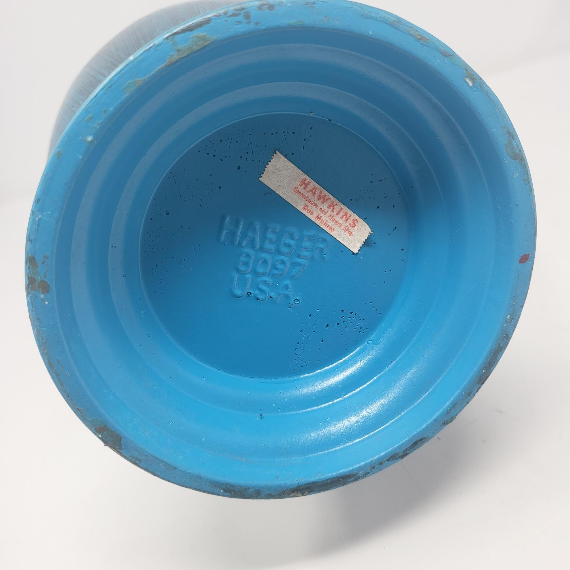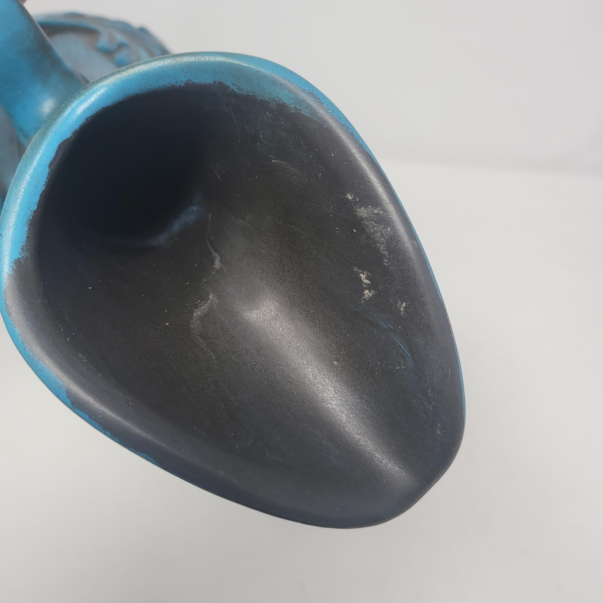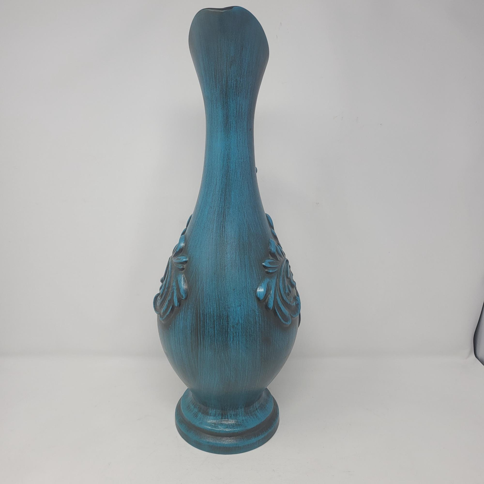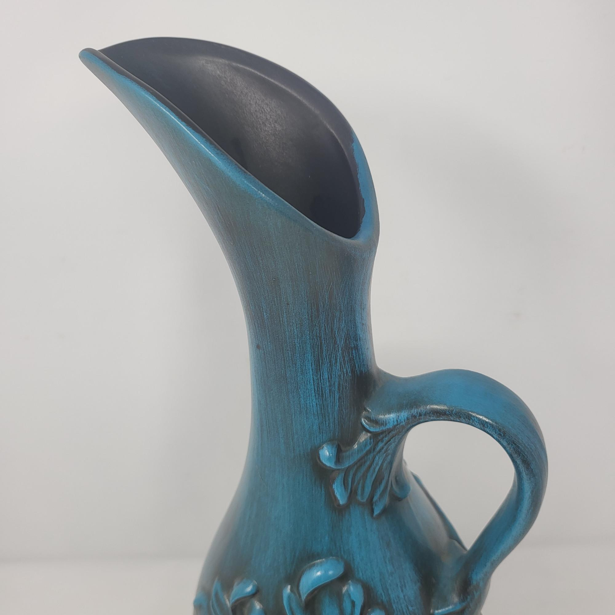 The Haeger vase features a teal and black brushed look with a raised leaf motif. It has a handle that accents the decorative and functional potential of the vase. Marked "Haeger 8097 U.S.A.".