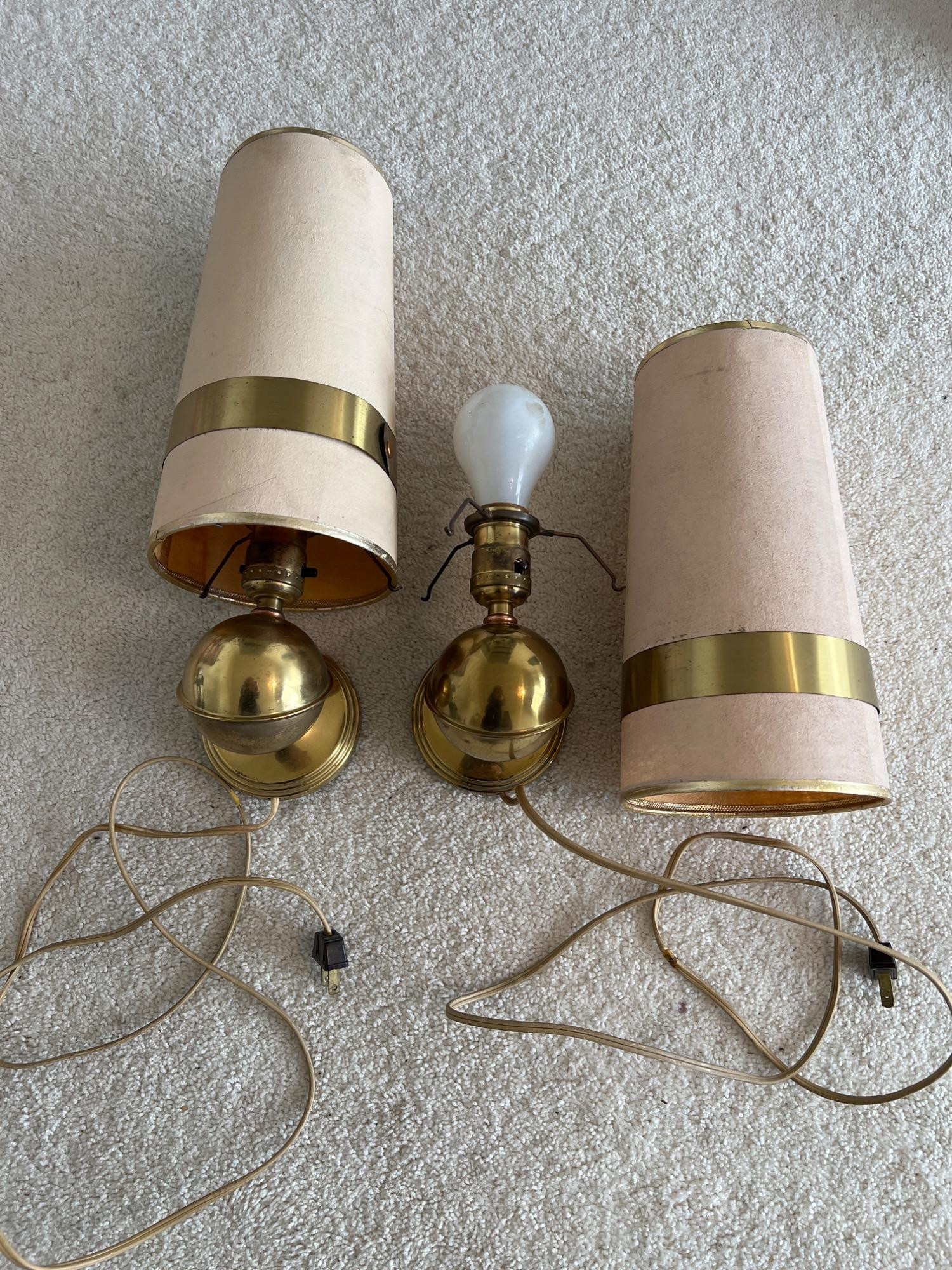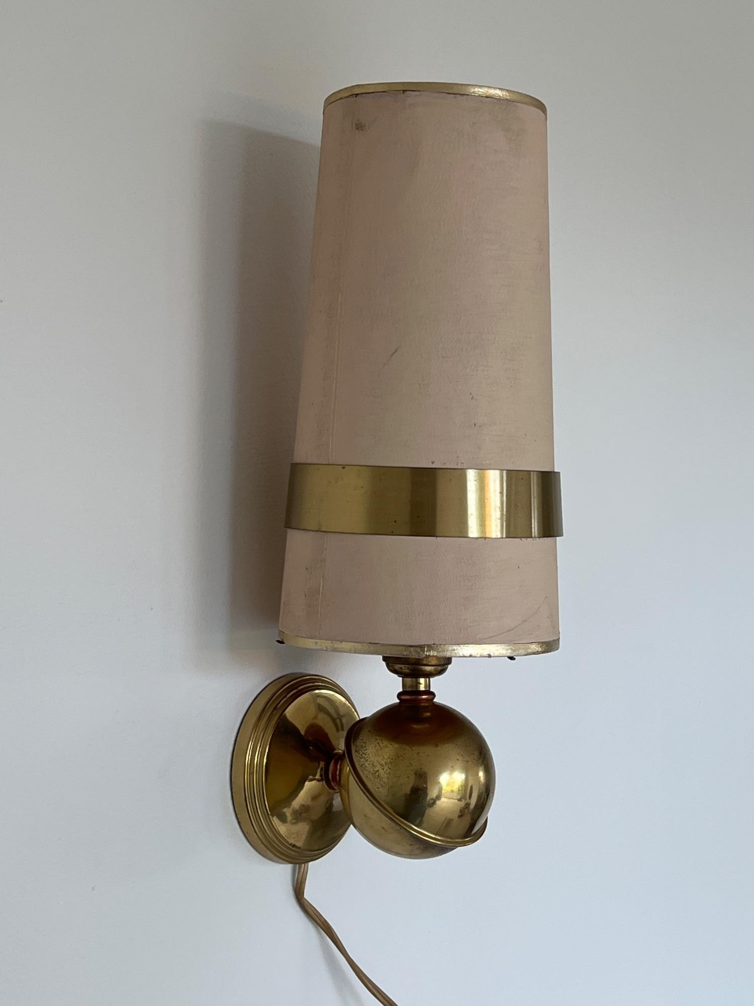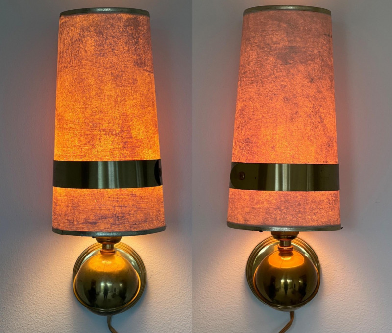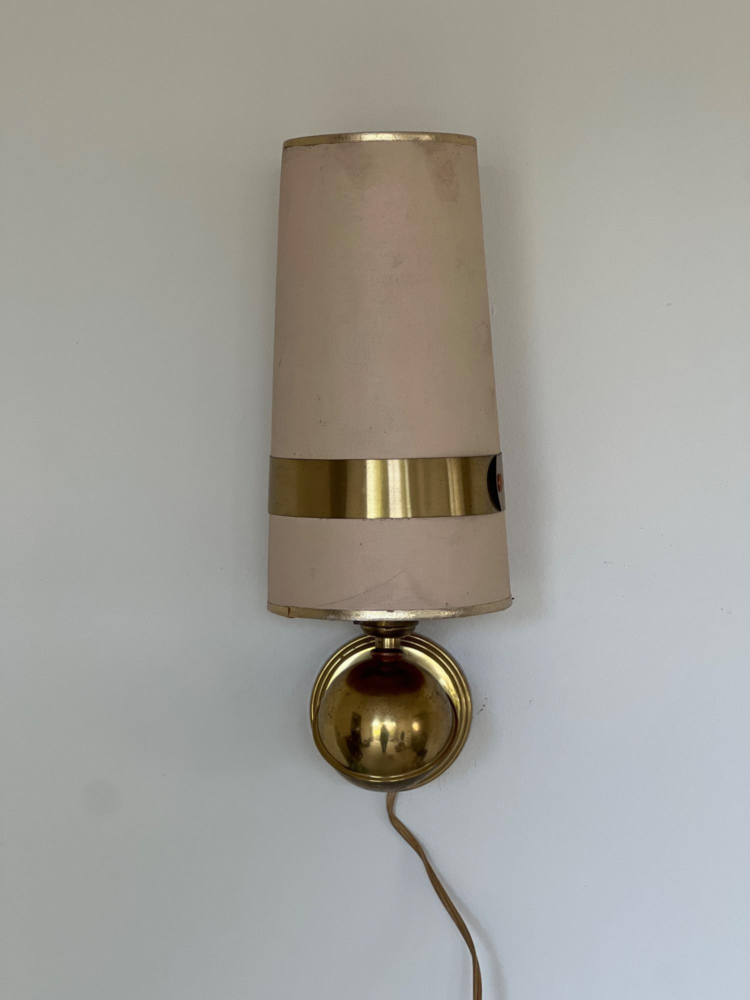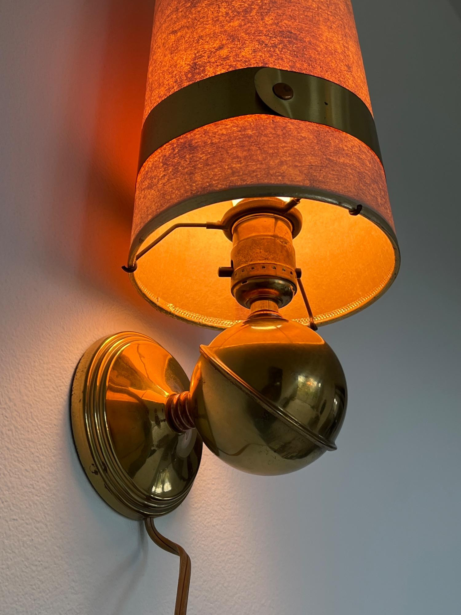 Two mid-century modern brass fixtures with an elegant, minimalist design. Conical beige lampshades, combined with brass trim and brass spherical base, give these lights a balanced and elongated appearance without dominating the wall space. The lights are working and simply plug into a wall outlet. Push on/off switch. Original shades that have some smudges to the surface.