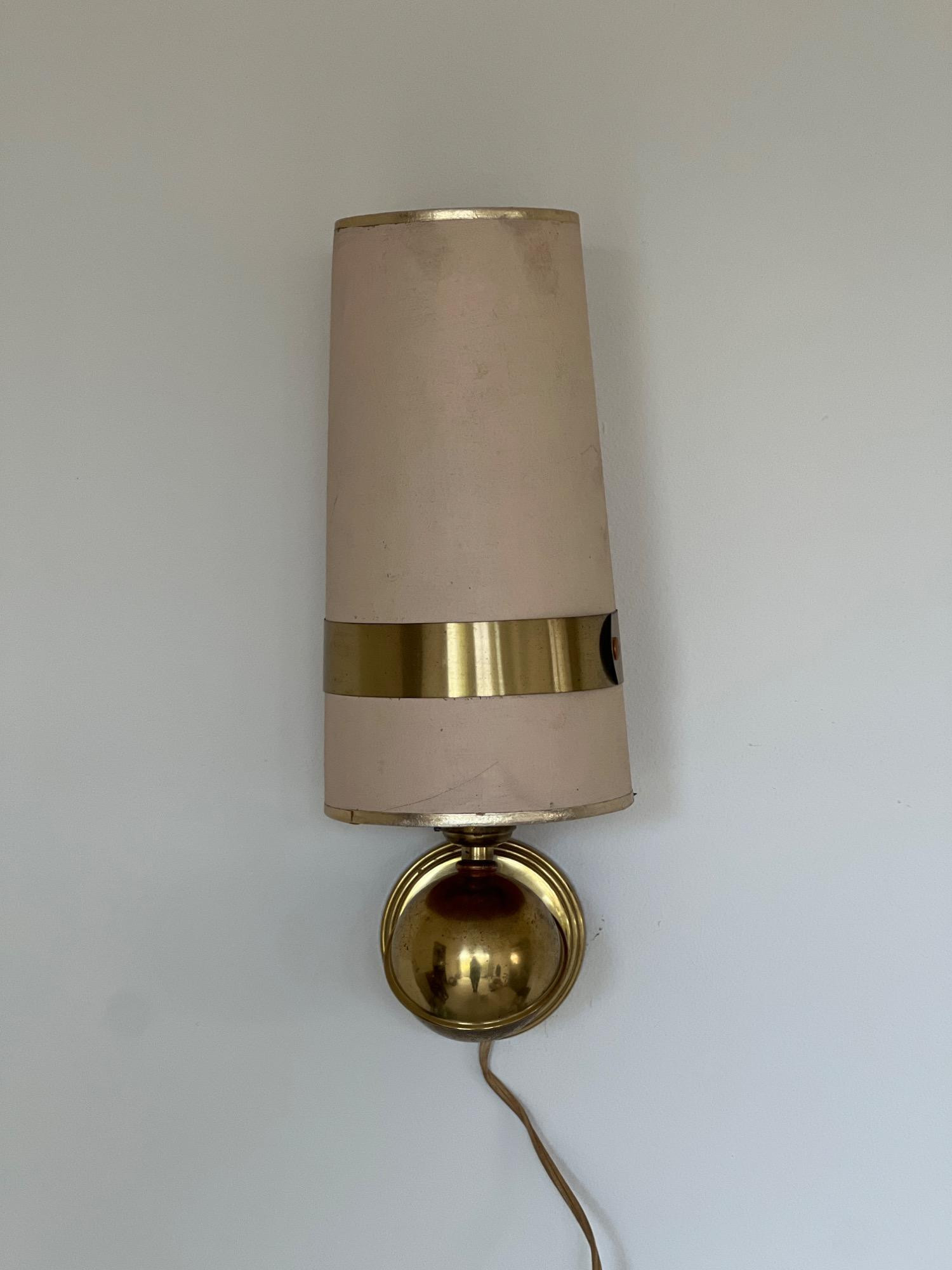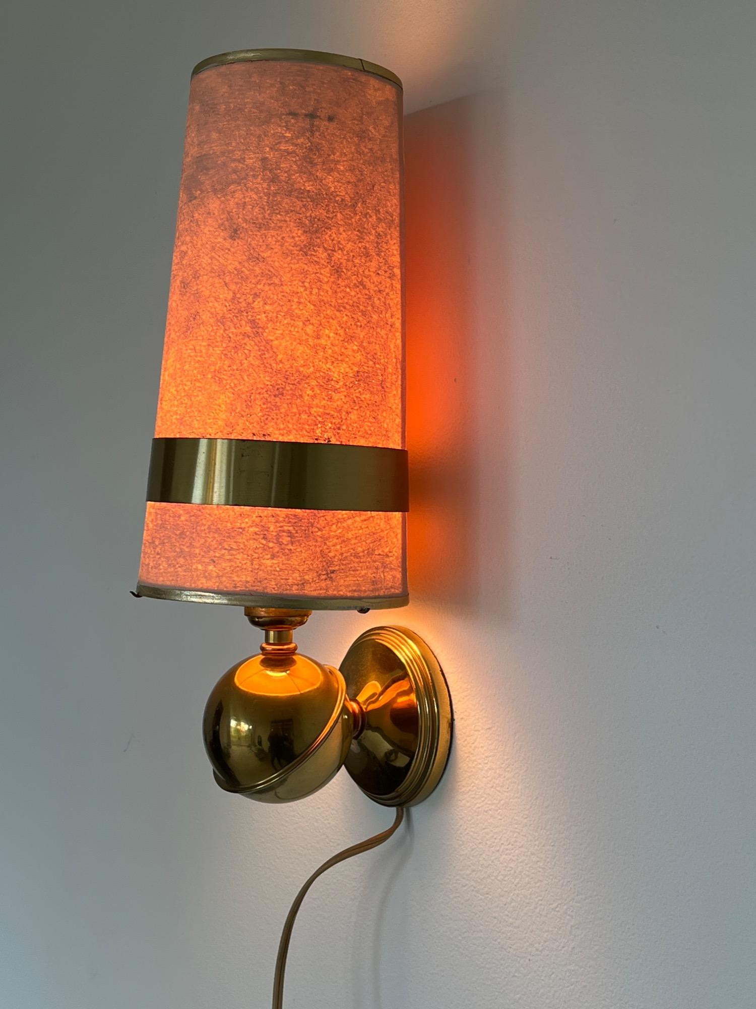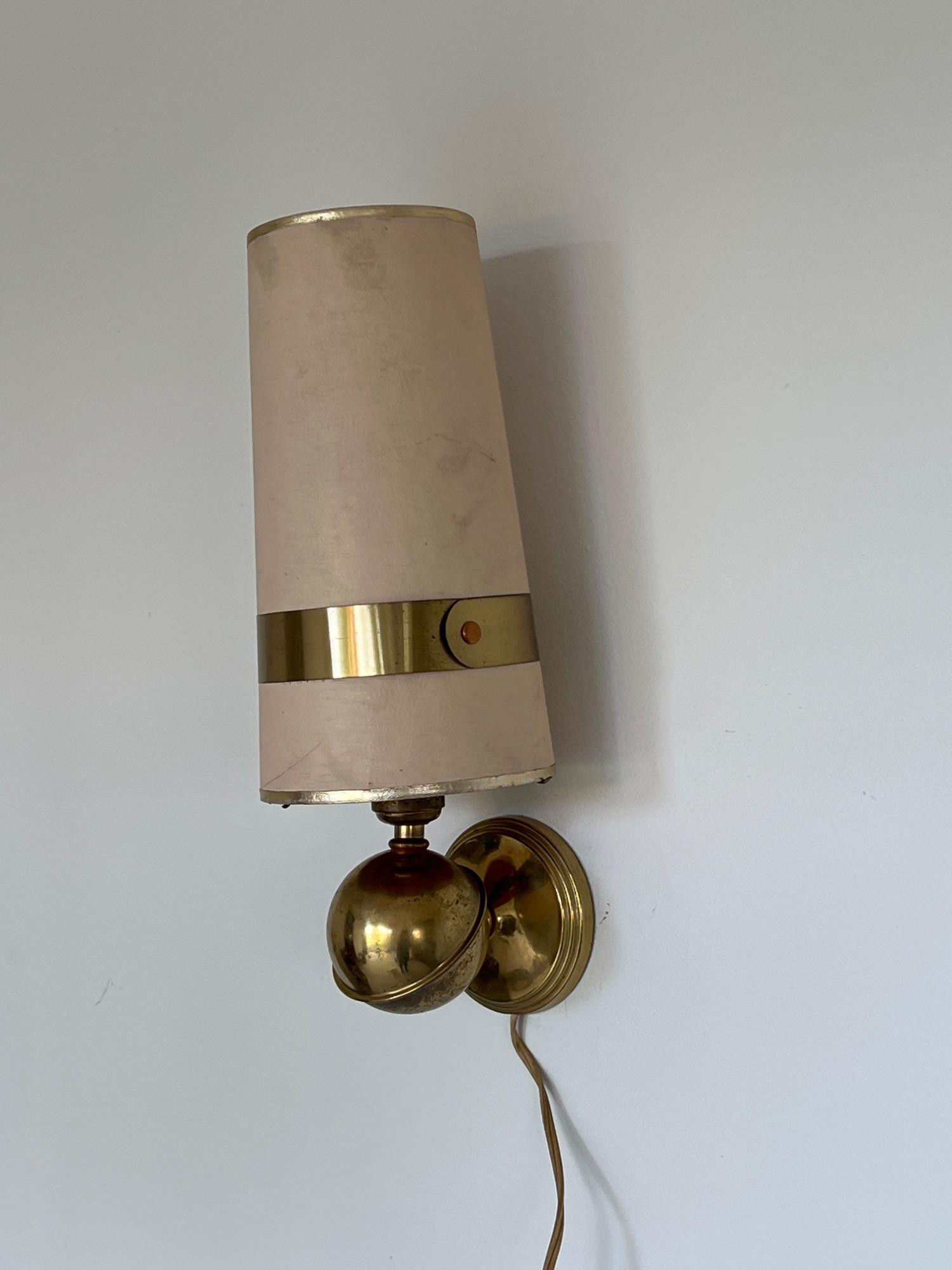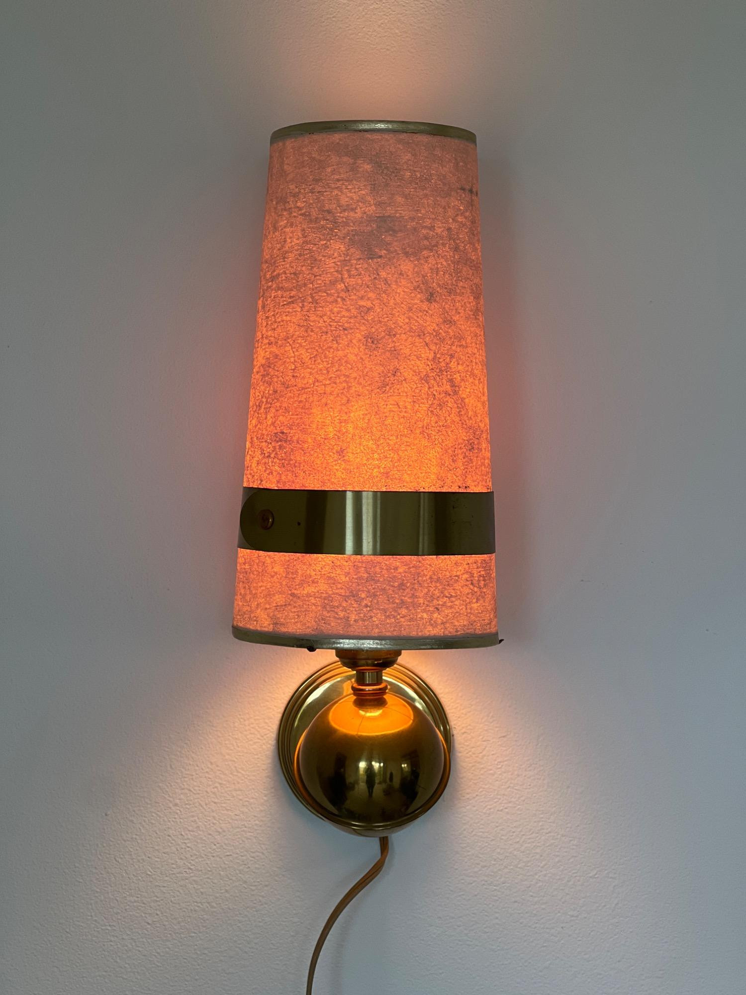 Two mid-century modern brass fixtures with an elegant, minimalist design. Conical beige lampshades, combined with brass trim and brass spherical base, give these lights a balanced and elongated appearance without dominating the wall space. The lights are working and simply plug into a wall outlet. Push on/off switch. Original shades that have some smudges to the surface.