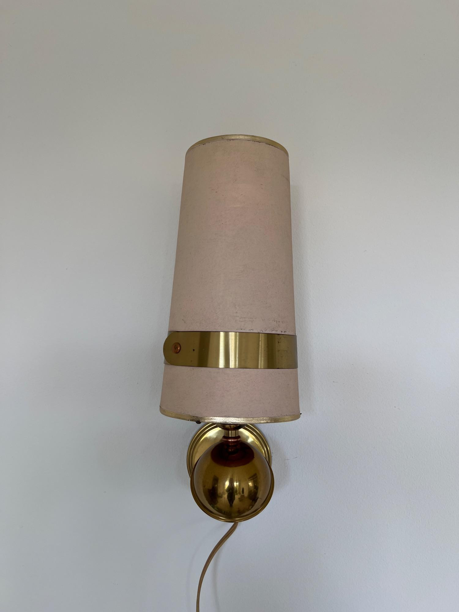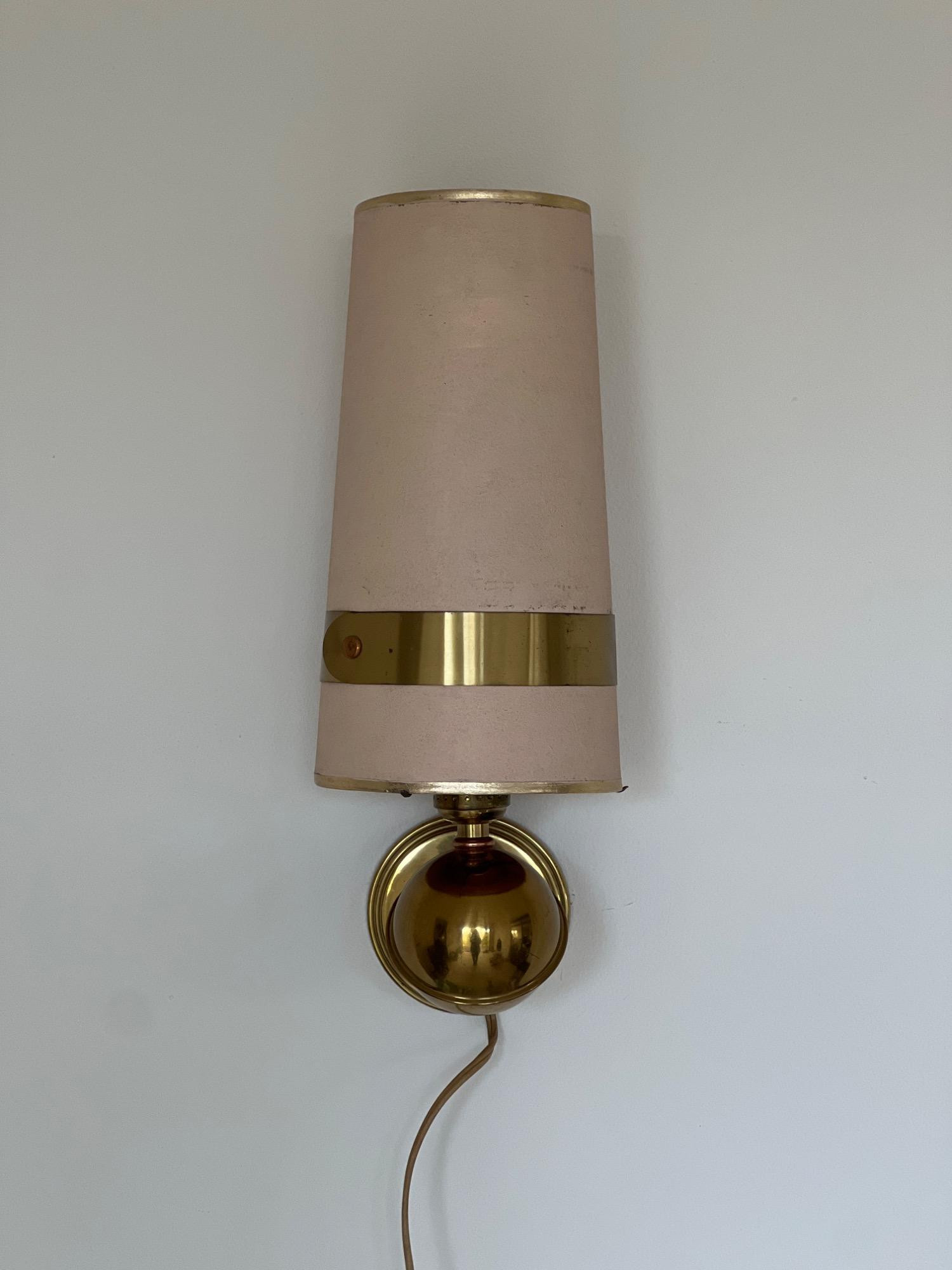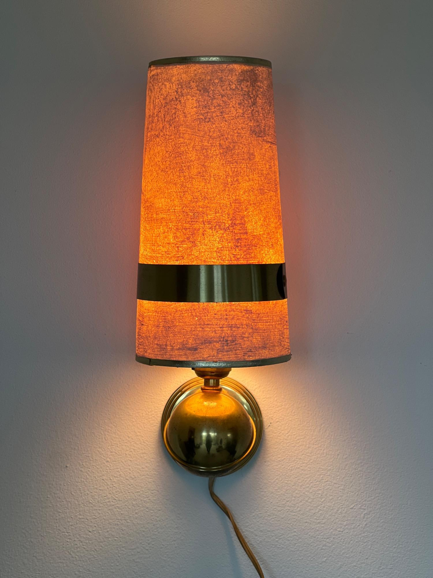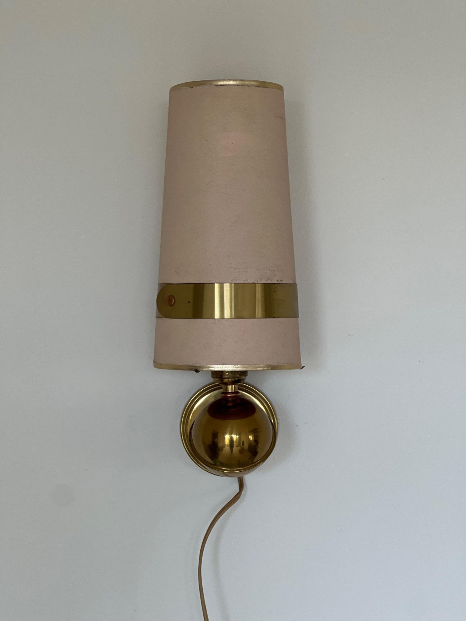 Two mid-century modern brass fixtures with an elegant, minimalist design. Conical beige lampshades, combined with brass trim and brass spherical base, give these lights a balanced and elongated appearance without dominating the wall space. The lights are working and simply plug into a wall outlet. Push on/off switch. Original shades that have some smudges to the surface.